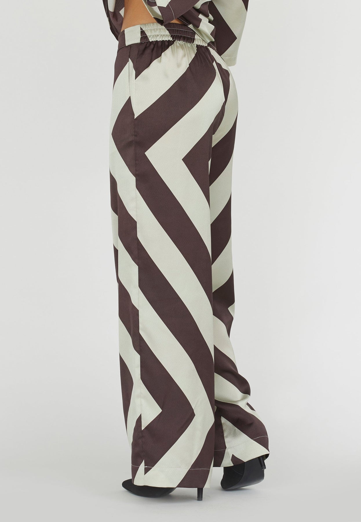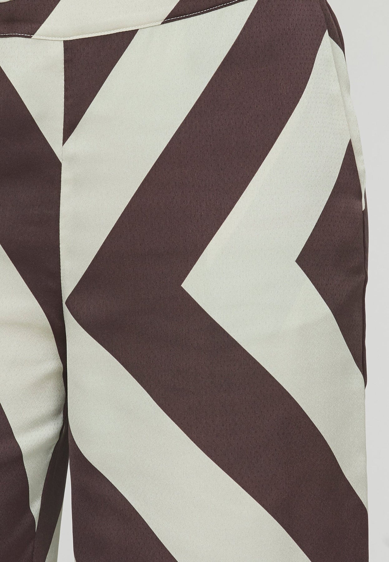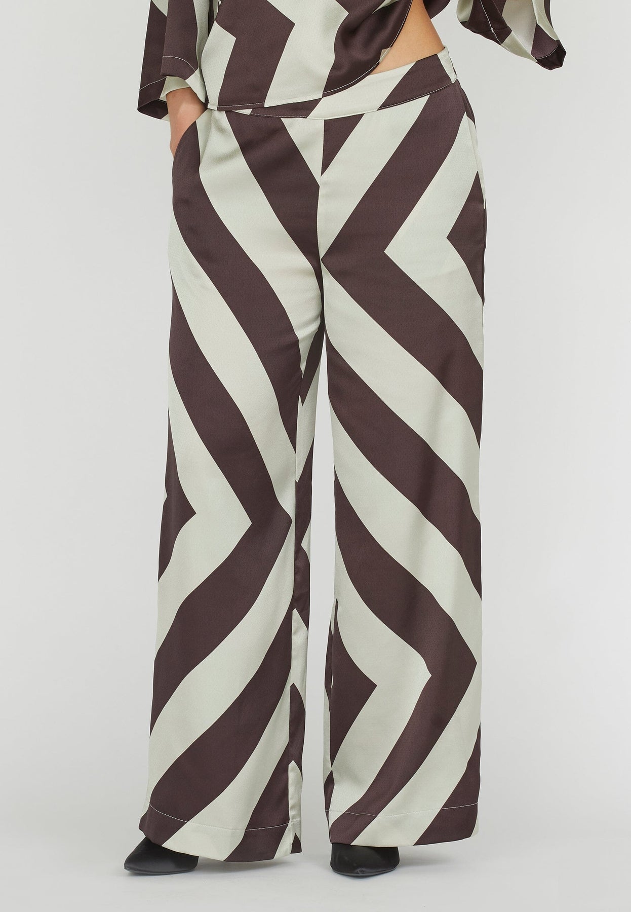 Hosen von Love & Divine mit braunen und hellgrünen Zickzackstreifen. Die Hosen haben eine lockere Passform und enden an den Knöcheln. Der elastische Bund sorgt für einen bequemen Sitz.