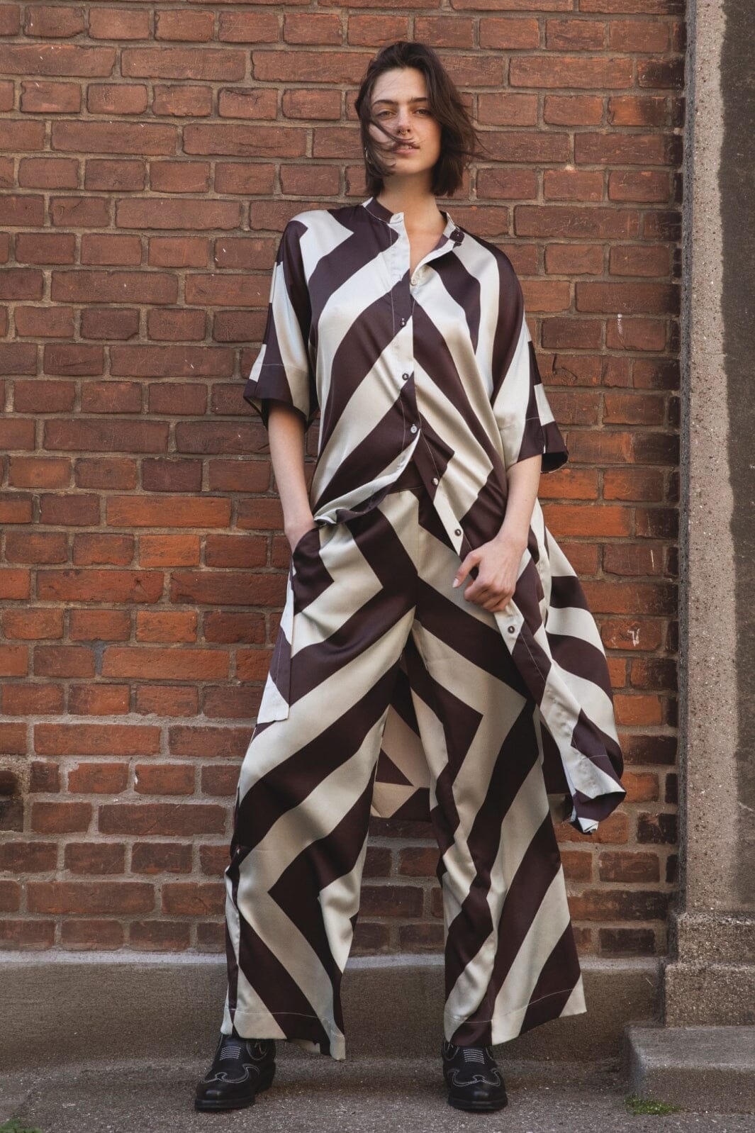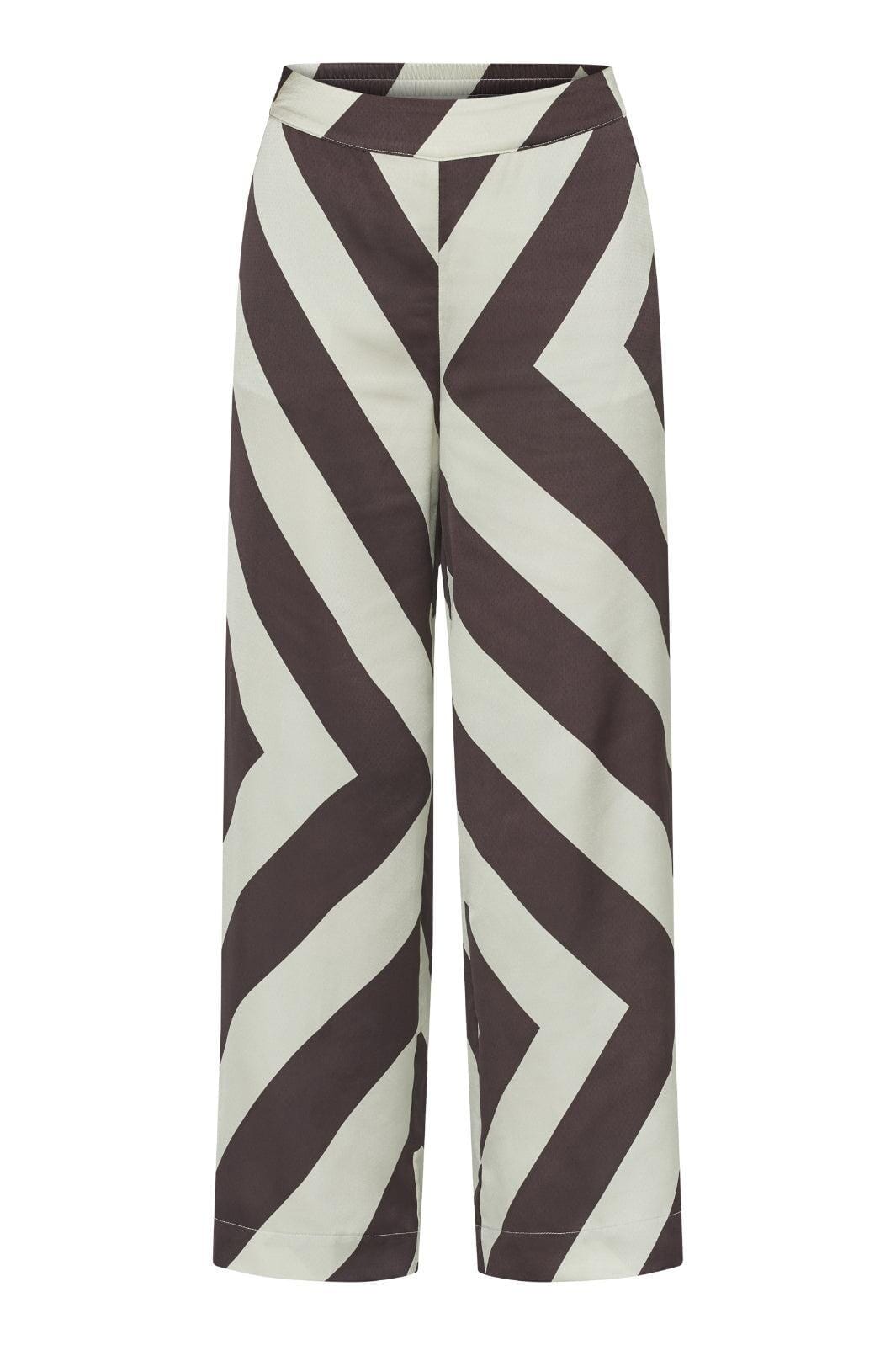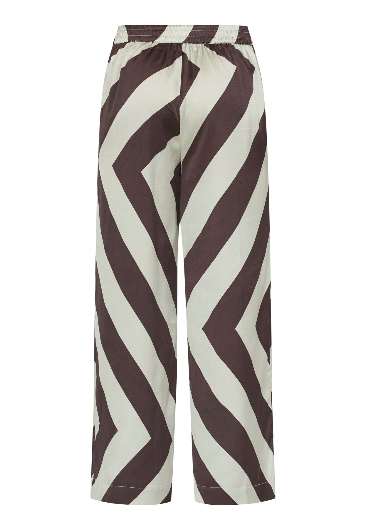 Hosen von Love & Divine mit braunen und hellgrünen Zickzackstreifen. Die Hosen haben eine lockere Passform und enden an den Knöcheln. Der elastische Bund sorgt für einen bequemen Sitz.