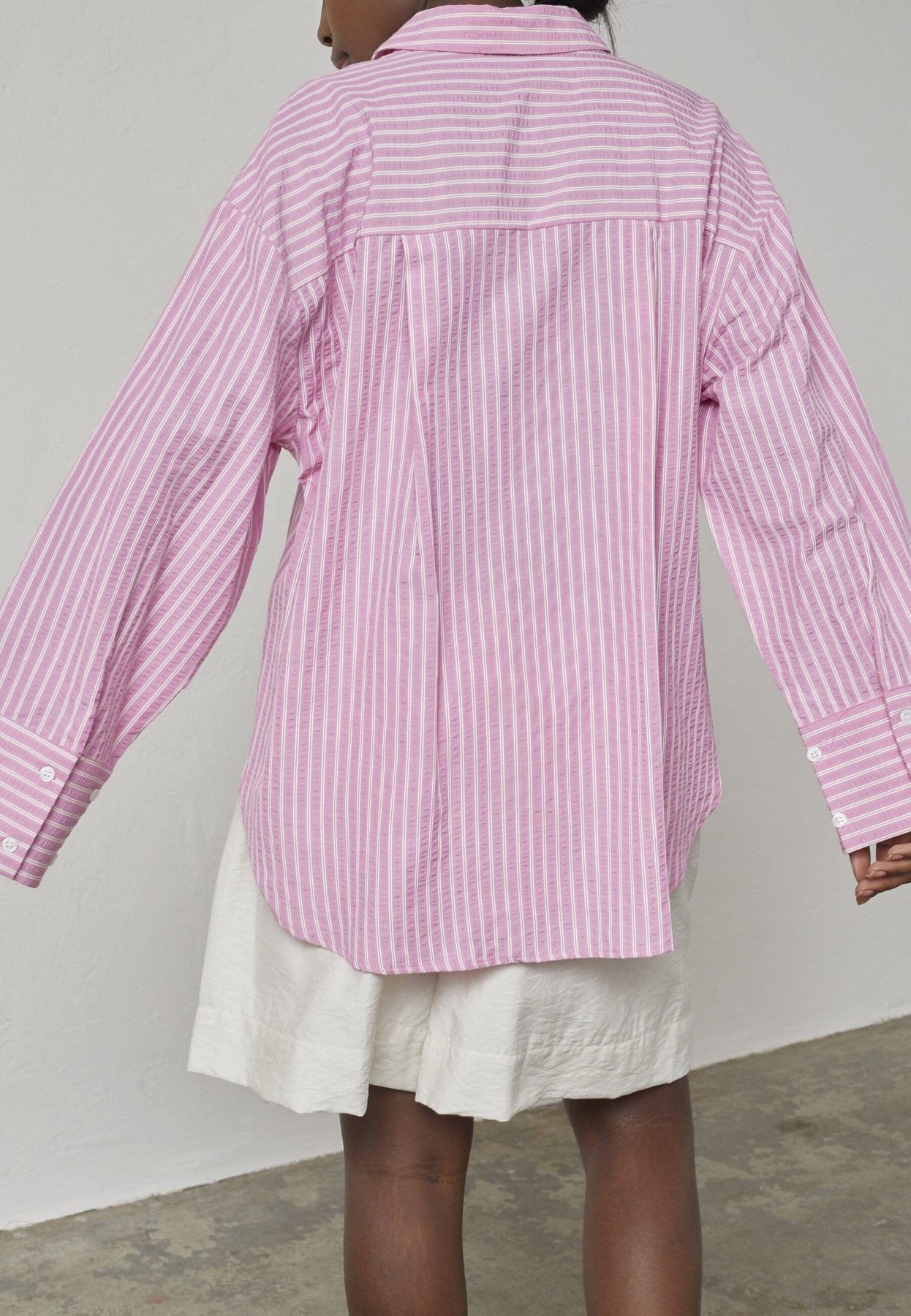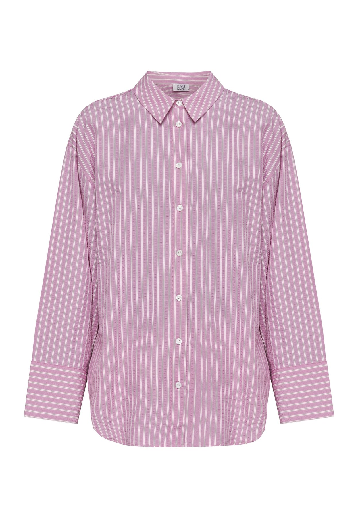 Rosa und weiße gestreifte Bluse mit klassischem Kragen. Die lockere Passform bietet gute Bewegungsfreiheit, und die langen Ärmel haben Manschetten an den Handgelenken.