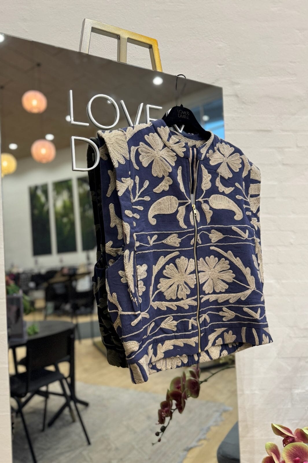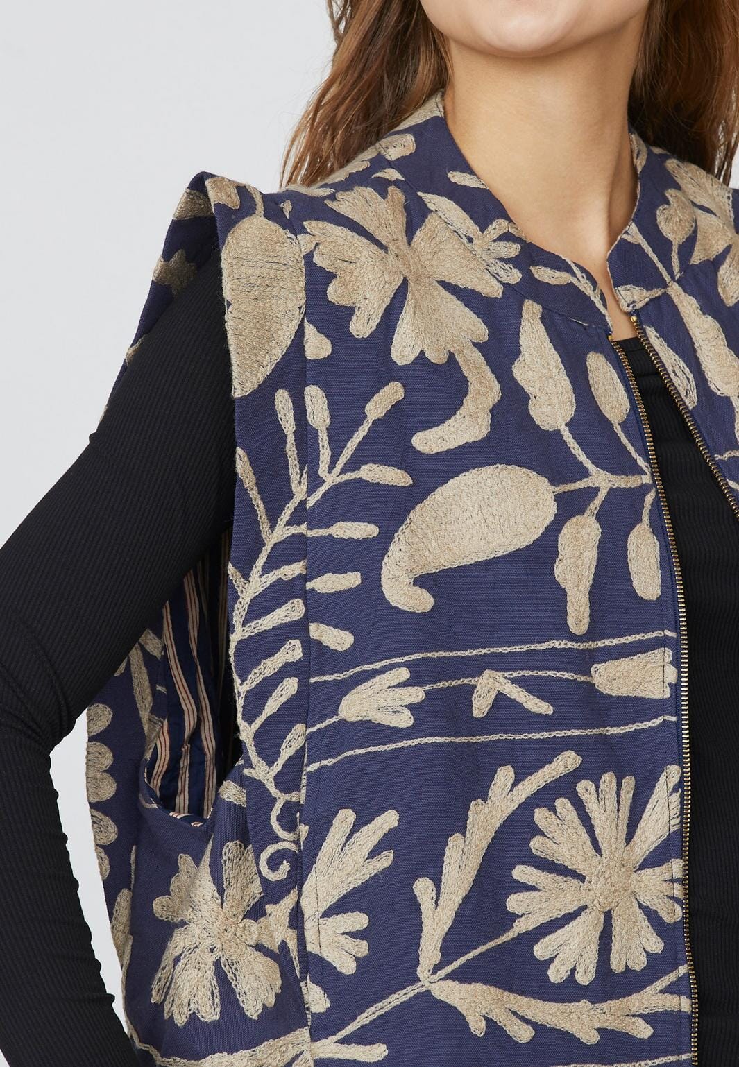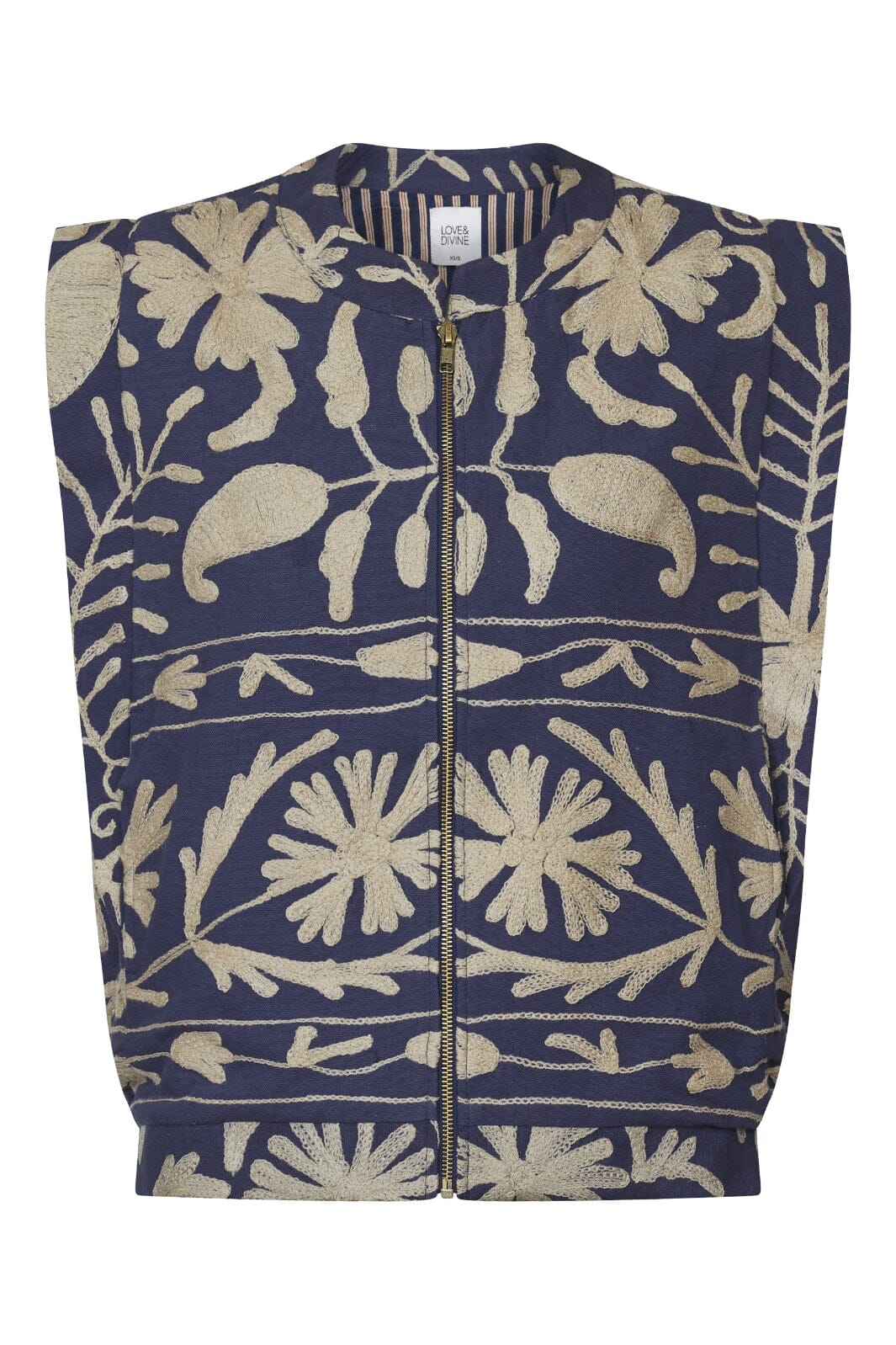 Ärmellose Baumwollweste von Love & Divine in Blau- und Sandtönen. Die Weste hat eine Blumenstickerei in Beige auf blauem Hintergrund und einen Reißverschluss vorne.