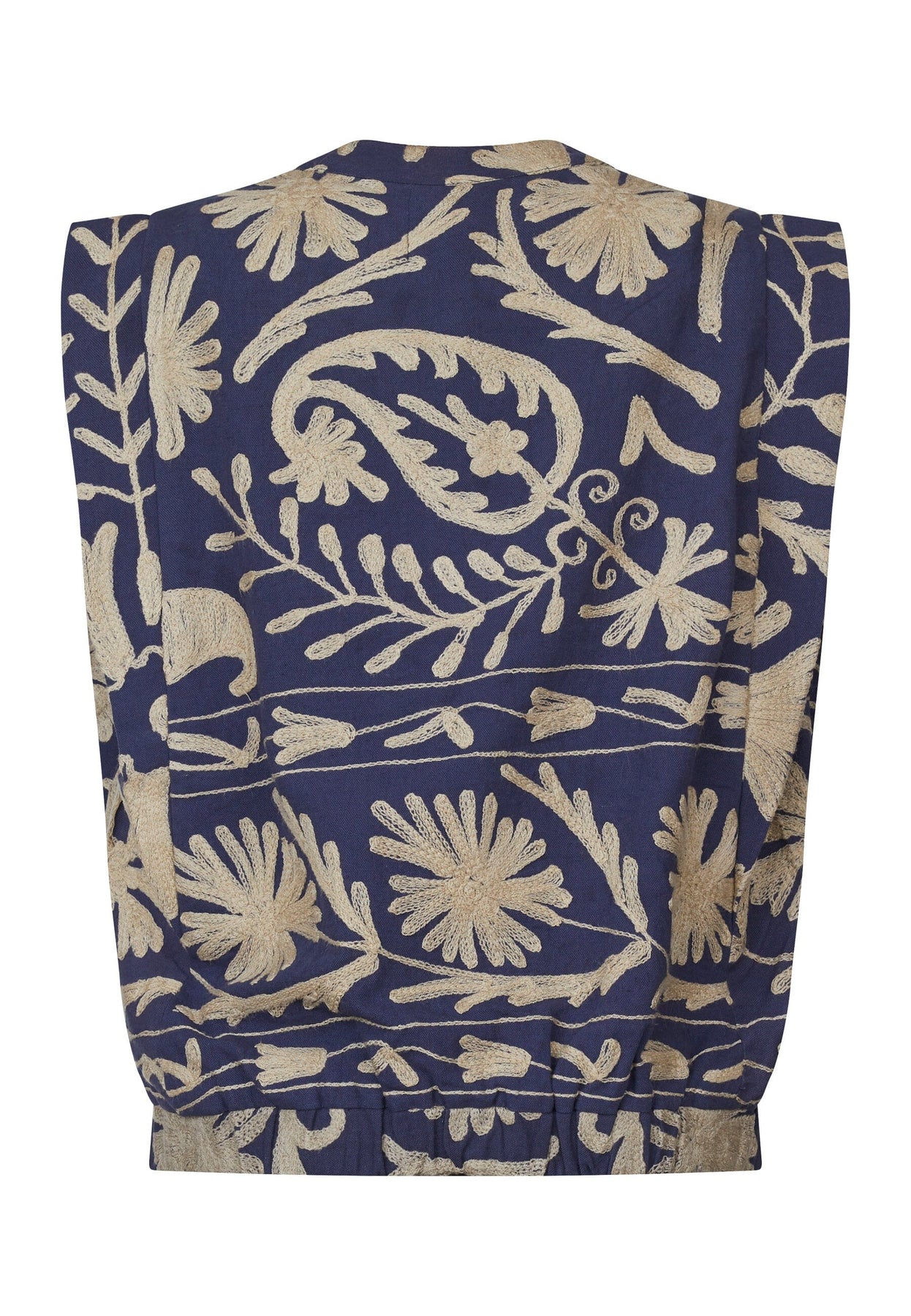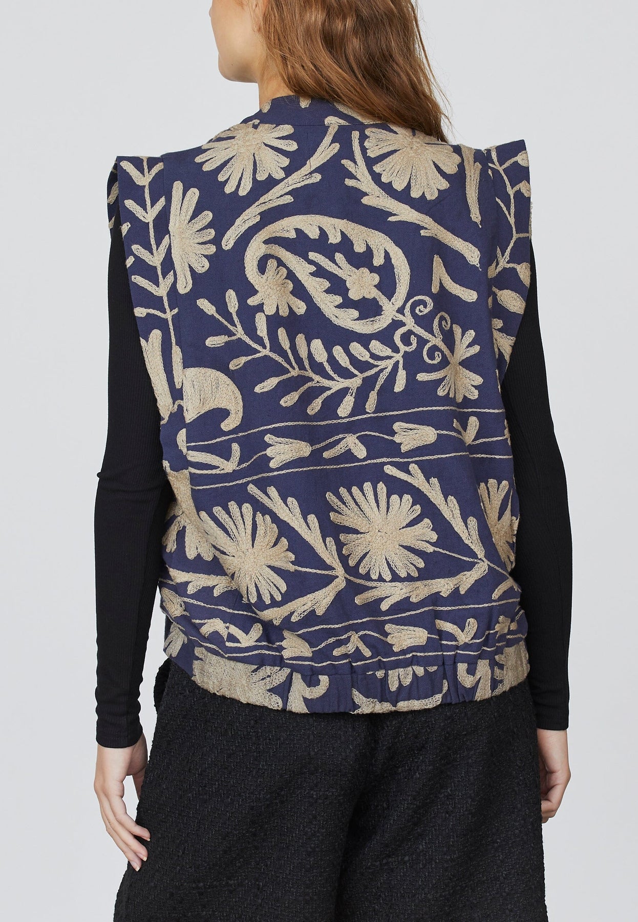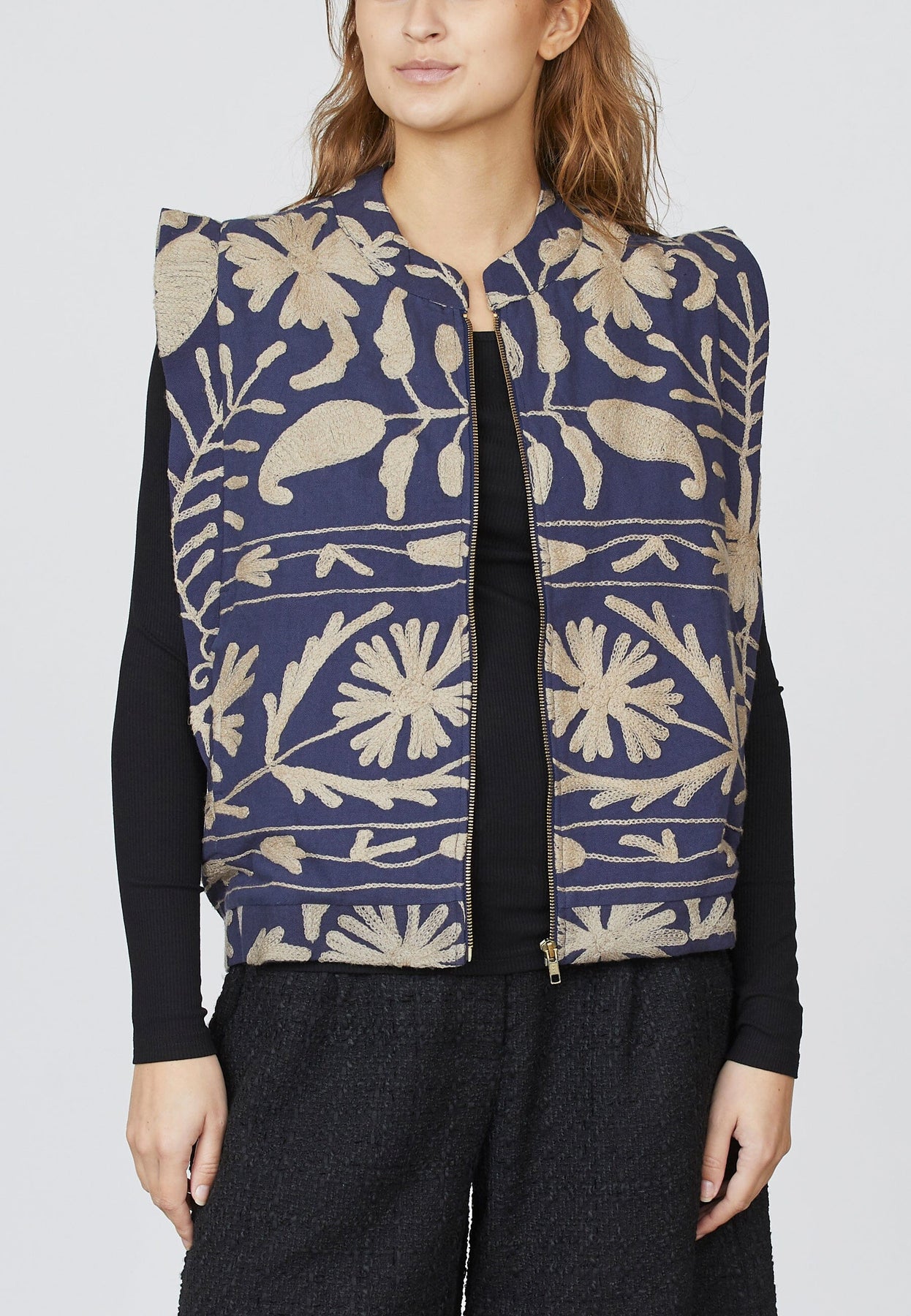 Ärmellose Baumwollweste von Love & Divine in Blau- und Sandtönen. Die Weste hat eine Blumenstickerei in Beige auf blauem Hintergrund und einen Reißverschluss vorne.