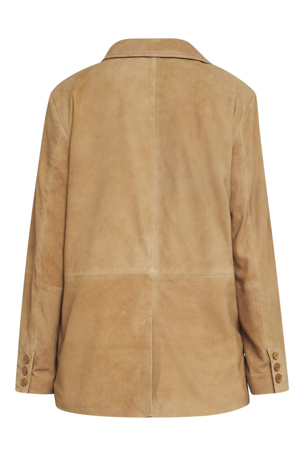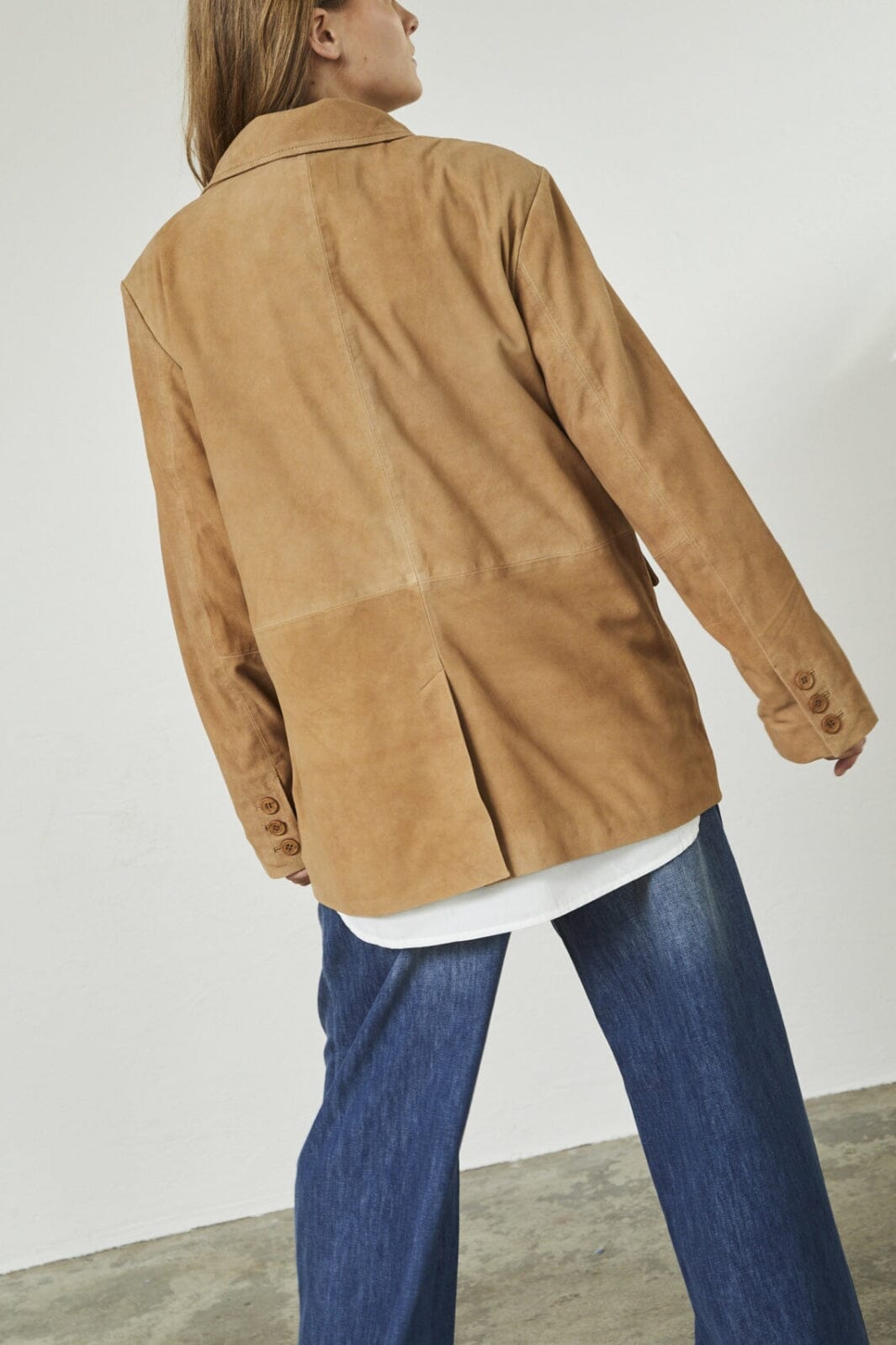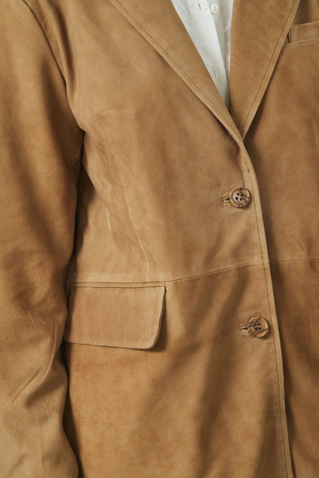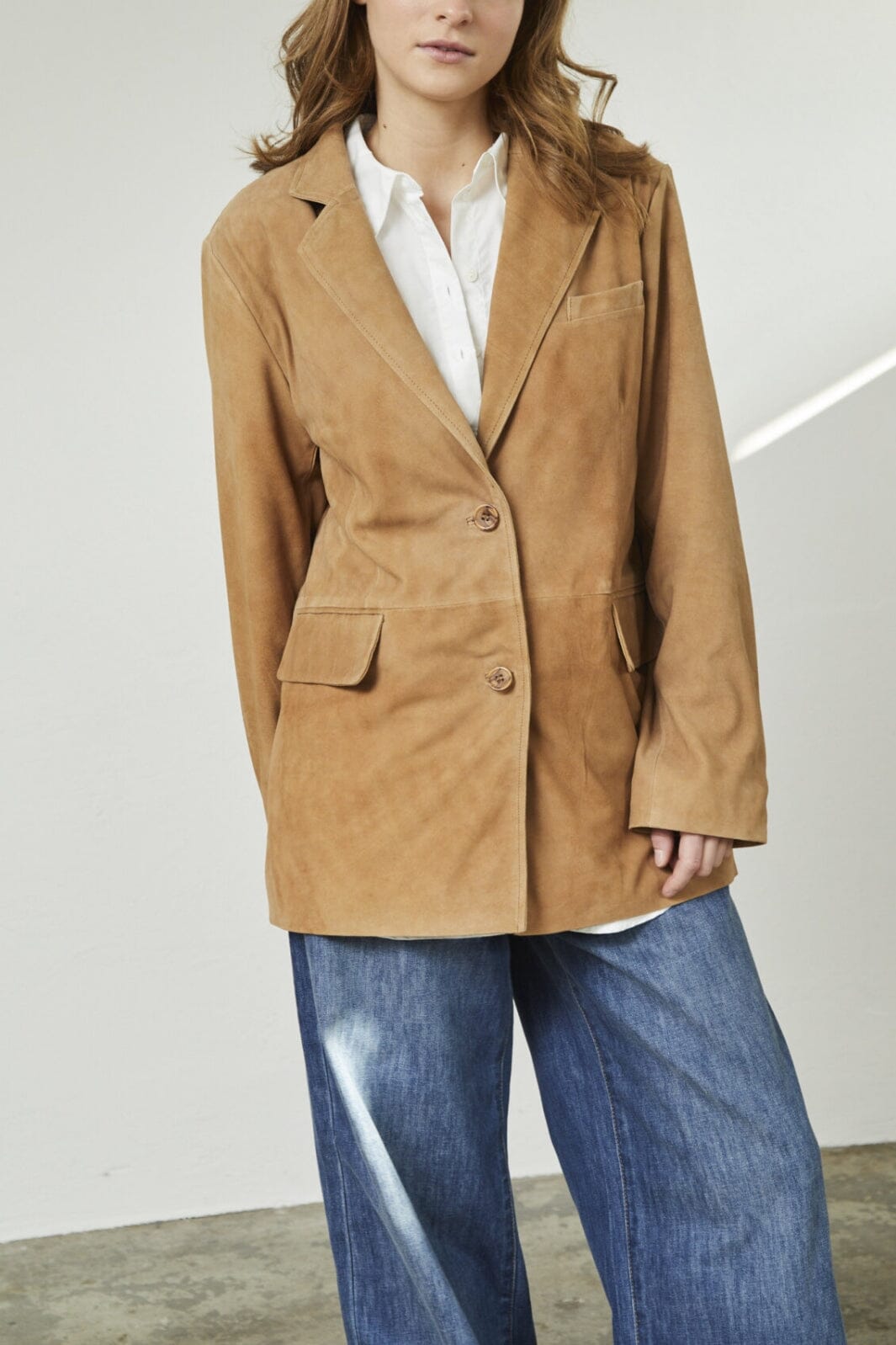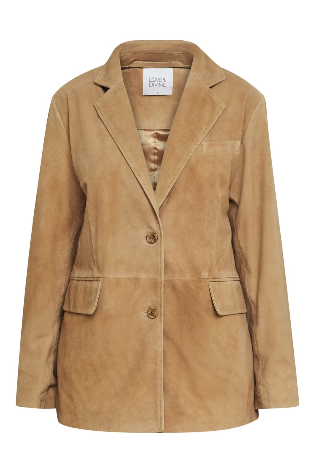 Die Lederblazer von Love & Divine in Camel hat einen klassischen Reverskragen und zwei Knöpfe vorne. Sie ist aus weichem Leder mit dekorativen Nähten und praktischen Taschen gefertigt.