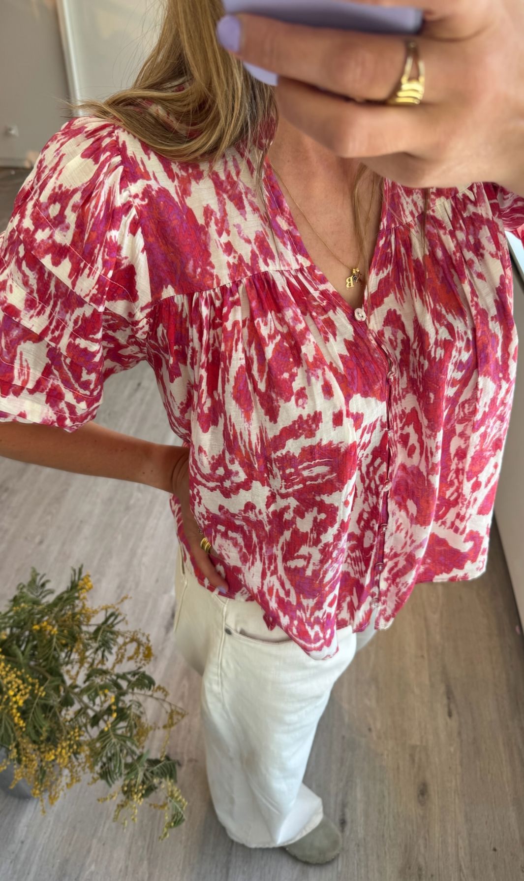 Rote Bluse mit ethnischem Muster von Love & Divine. Die Bluse hat Rüschendetails und 3/4-Ärmel mit Puff. Der V-Ausschnitt und die Knöpfe vorne machen sie einfach zu stylen.