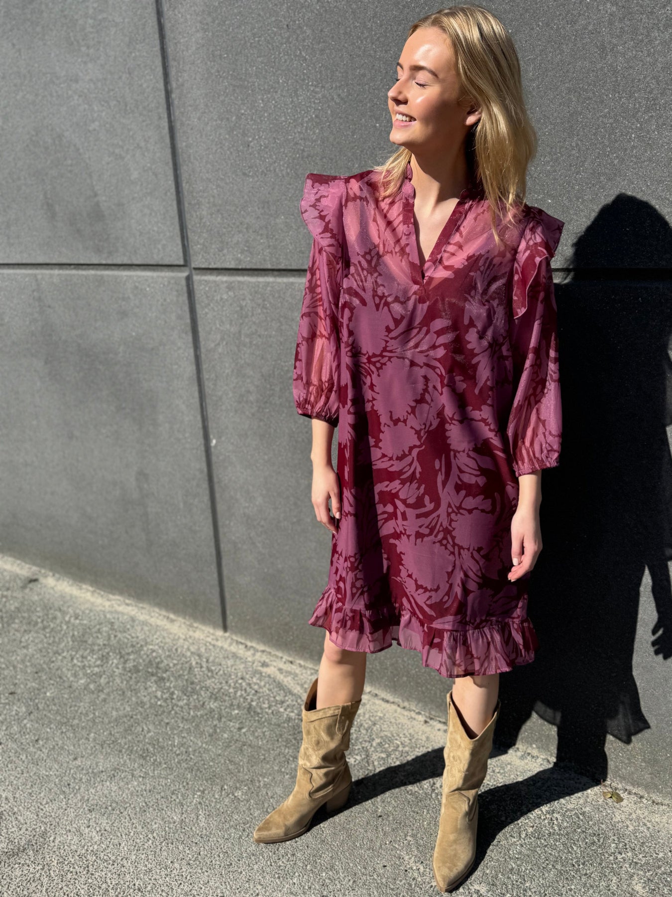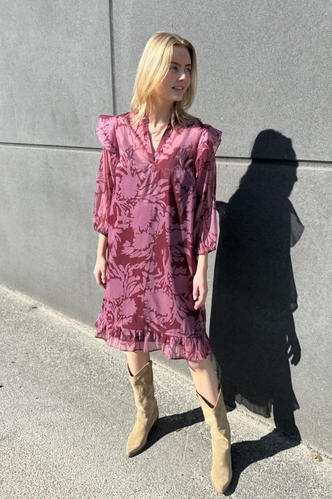 Kleid von Love & Divine mit Blumenmuster in Blush- und Burgunderfarben. Es hat einen V-Ausschnitt, 3/4-Ärmel und geraffte Details an den Ärmeln und dem Saum.
