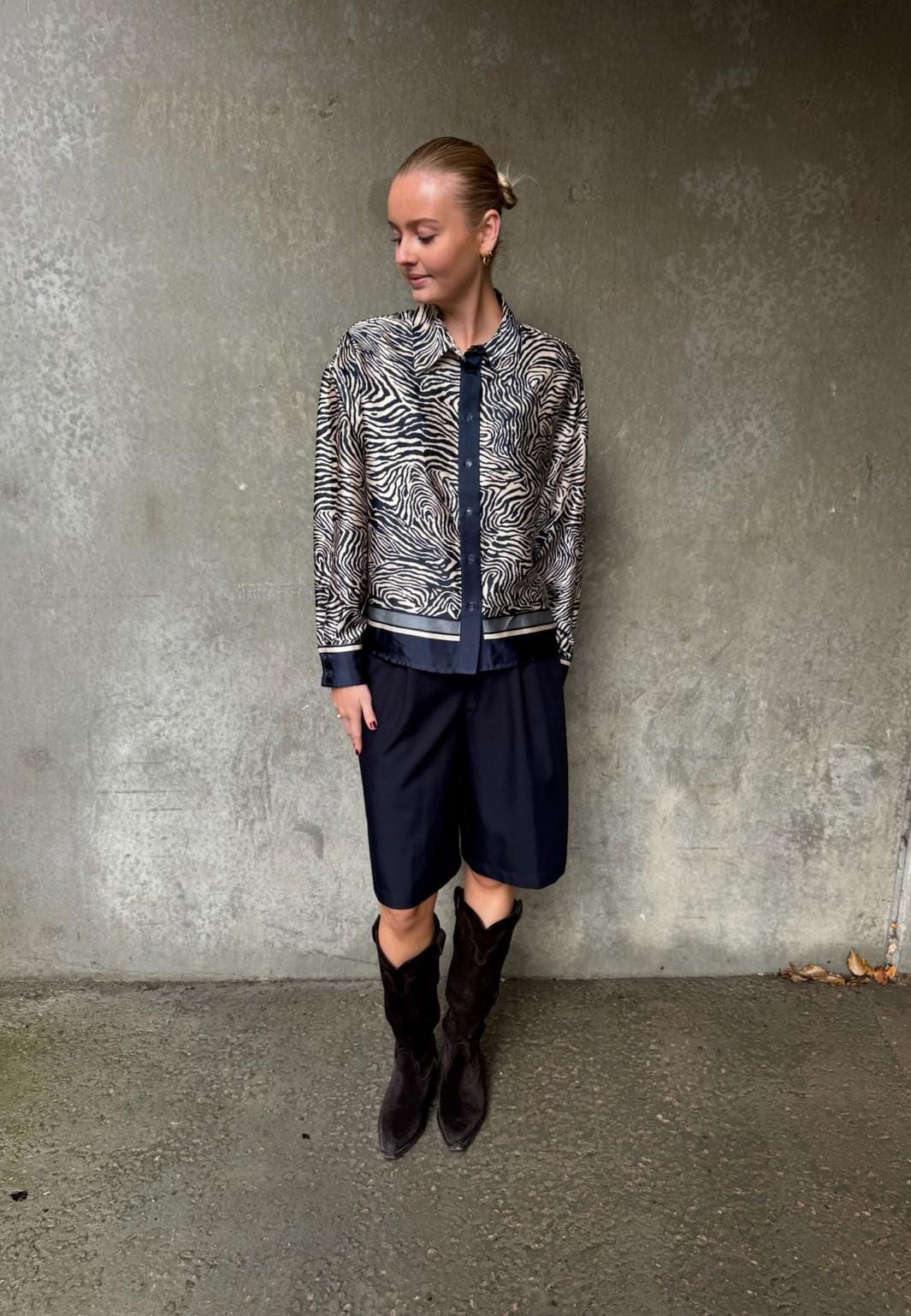 Bluse von Love & Divine mit Zebraprint in dunkelblauen und beigefarbenen Nuancen. Die Bluse hat einen klassischen Kragen und eine Knopfleiste entlang der Vorderseite.