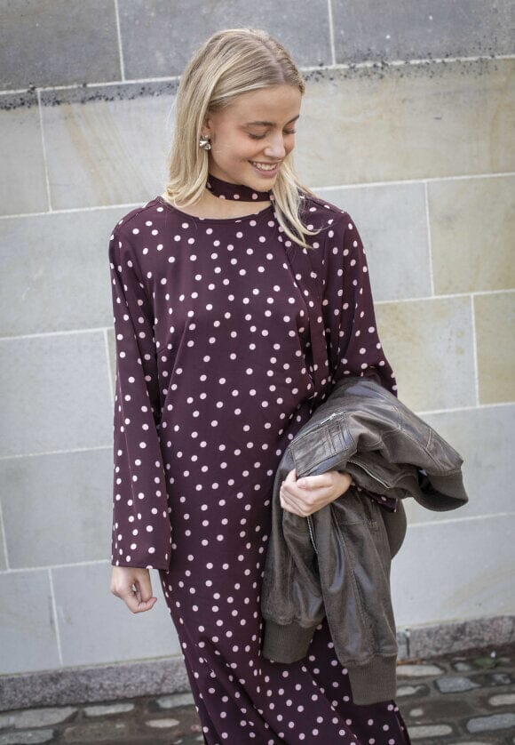 Langärmliges Kleid von Love & Divine in Bordeaux mit hellen Polka-Dots. Das lange Kleid hat einen runden Halsausschnitt und eine lockere Passform mit Schlitz an der Seite.