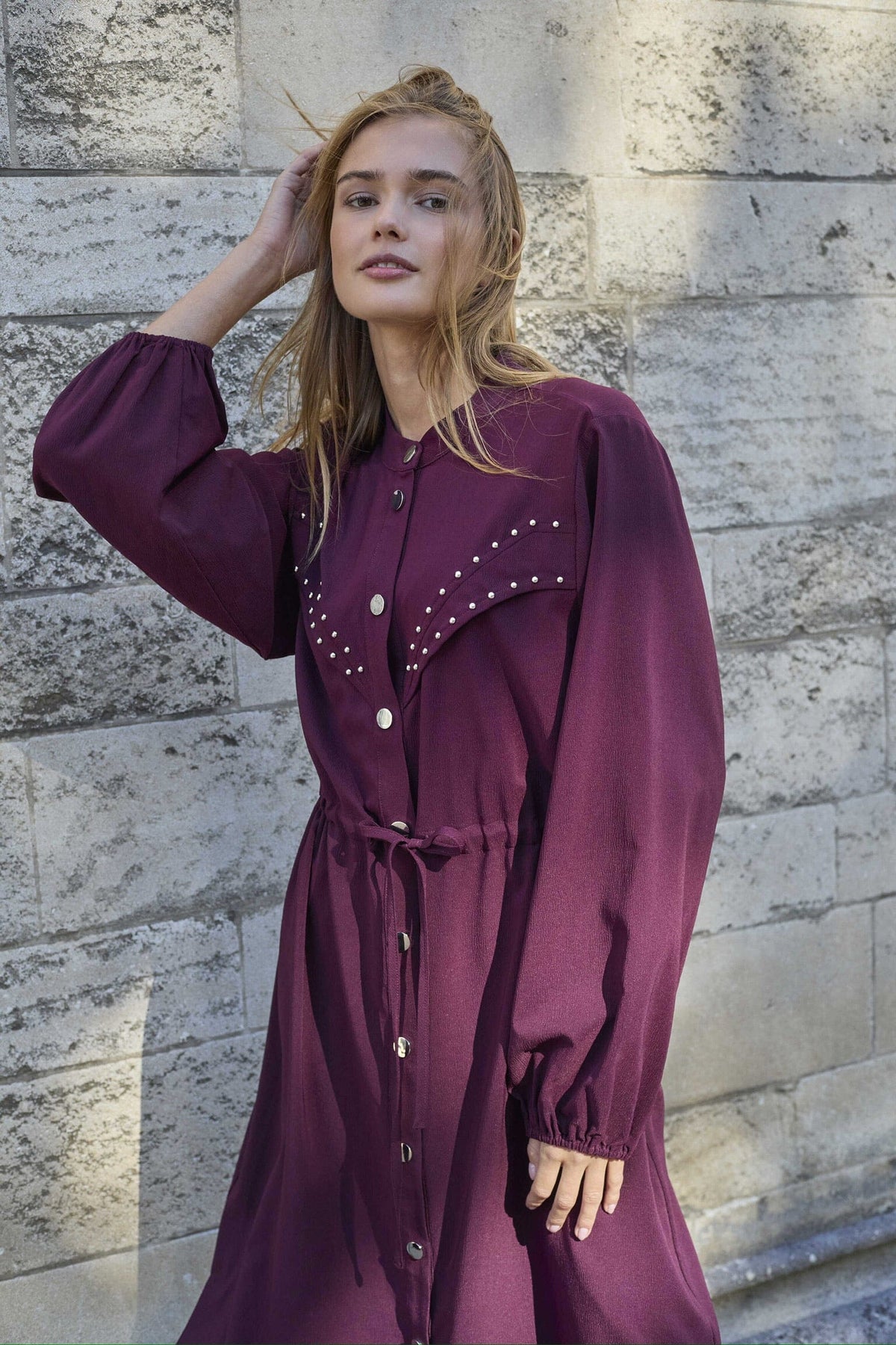 Kleid von Love & Divine in tiefem Bordeauxrot. Das Kleid hat einen hohen Kragen, lange Ärmel und knielange Länge mit Knopfleiste vorn.