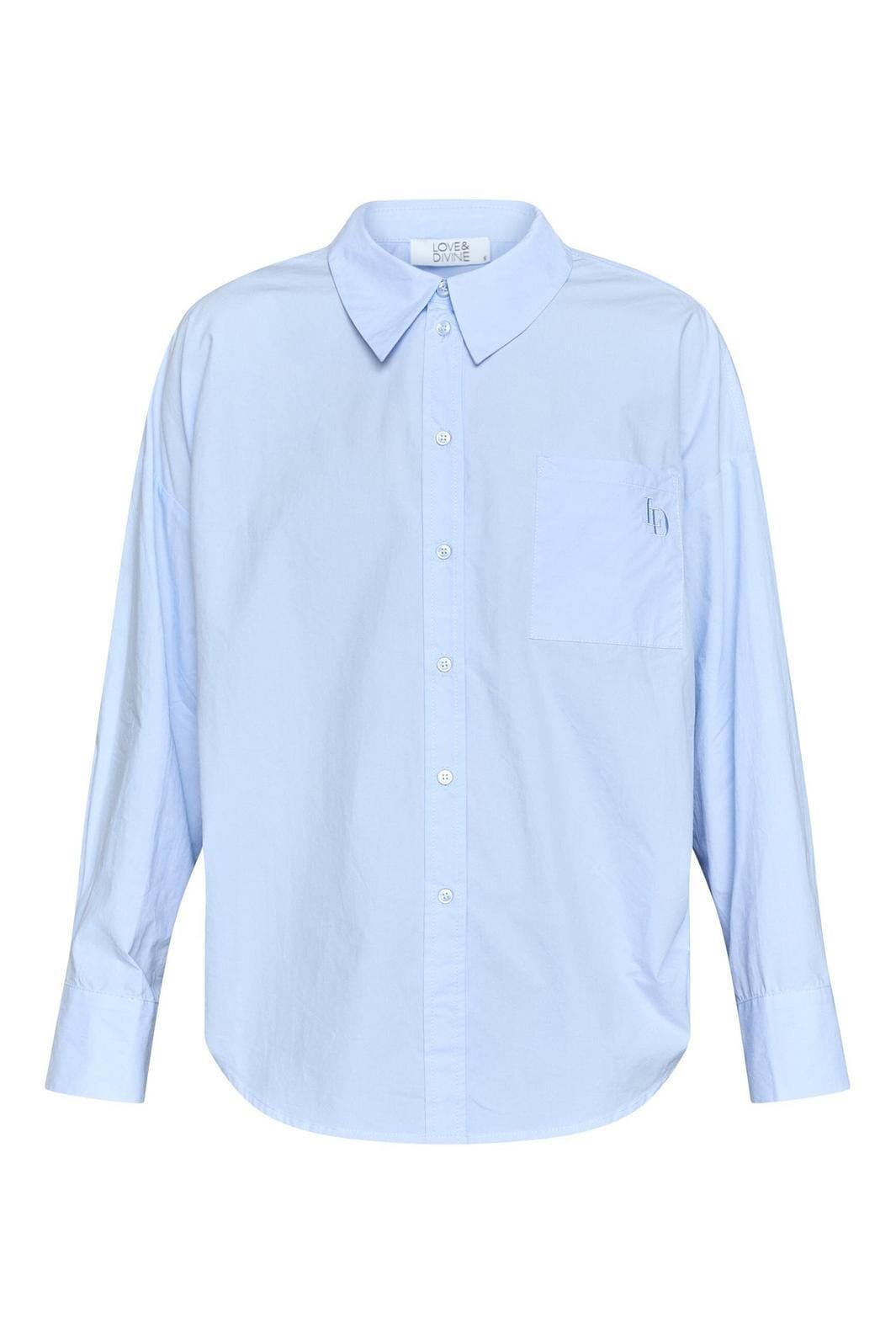 Hellblaues Hemd von Love & Divine aus 100 % Baumwolle. Das Hemd hat einen klassischen Kragen und eine Knopfleiste.