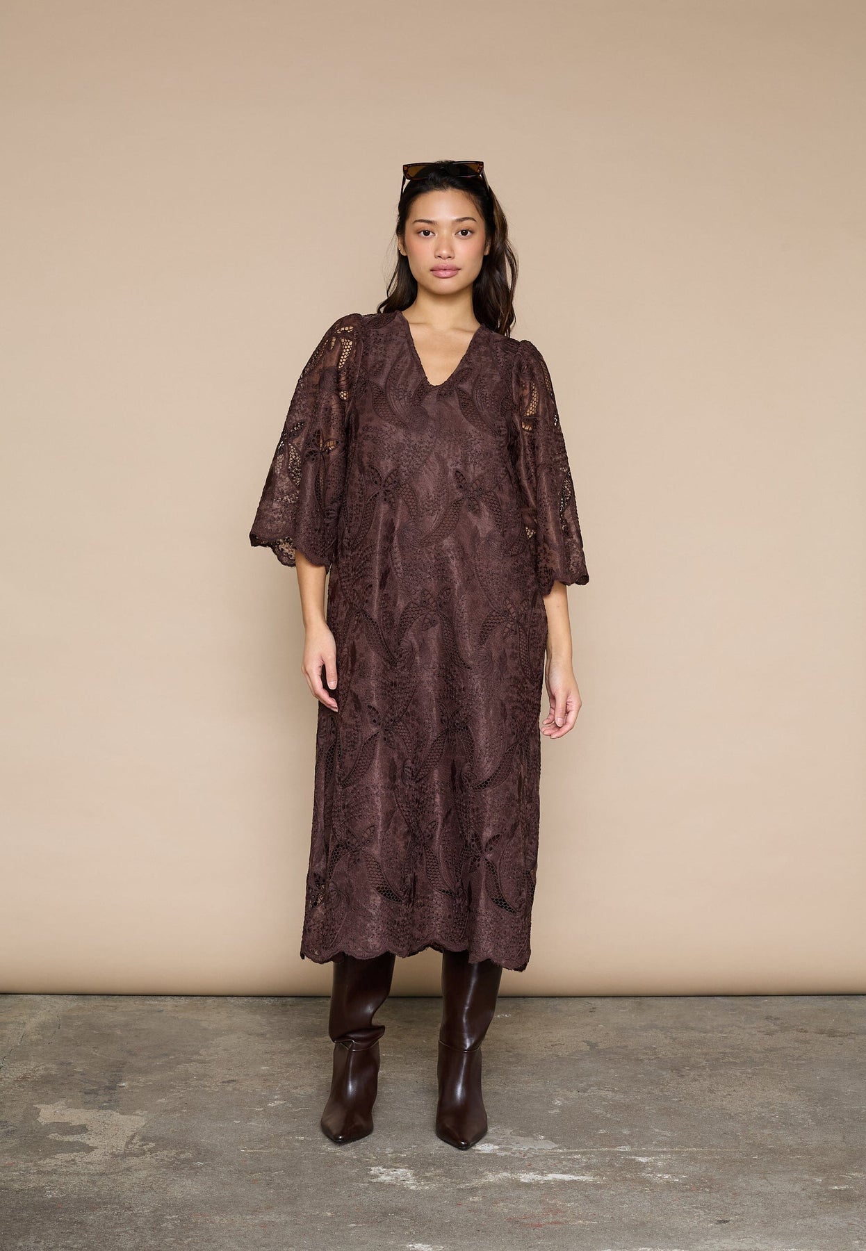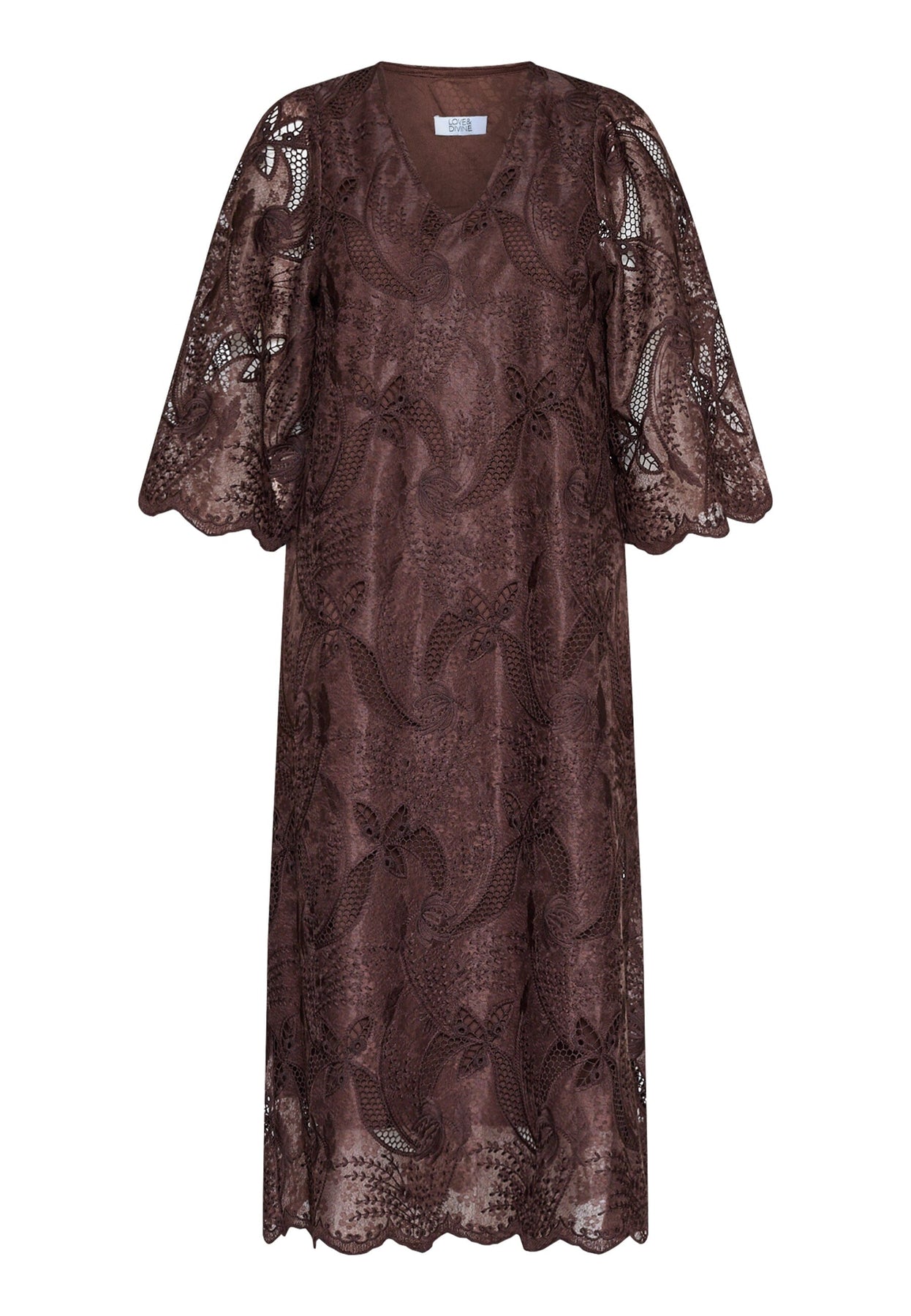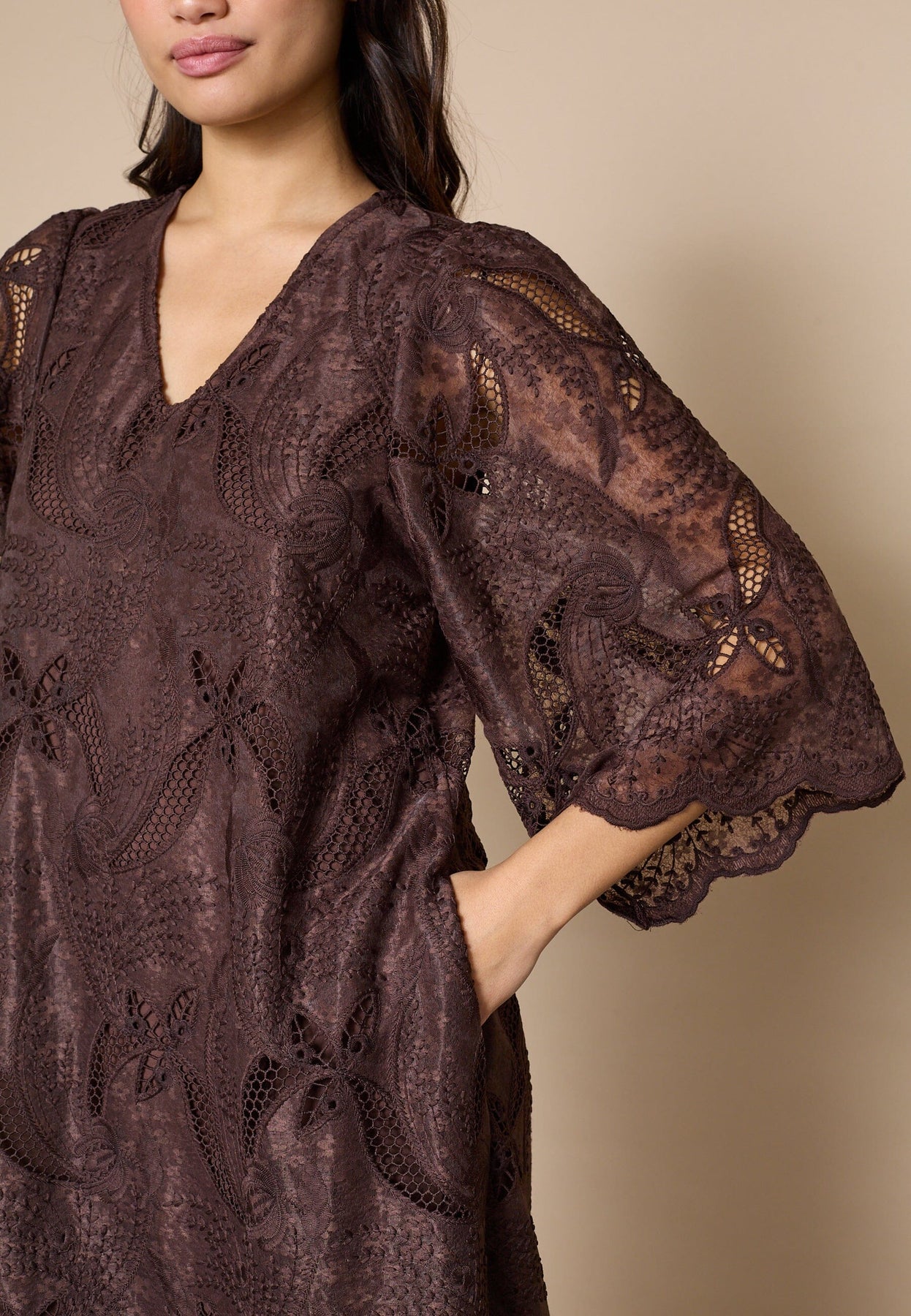 Braunes Kleid von Love & Divine mit Stickerei und Spitze. Das Kleid hat dreiviertellange Ärmel, einen V-Ausschnitt sowie ein Blumen- und Paisleymuster.