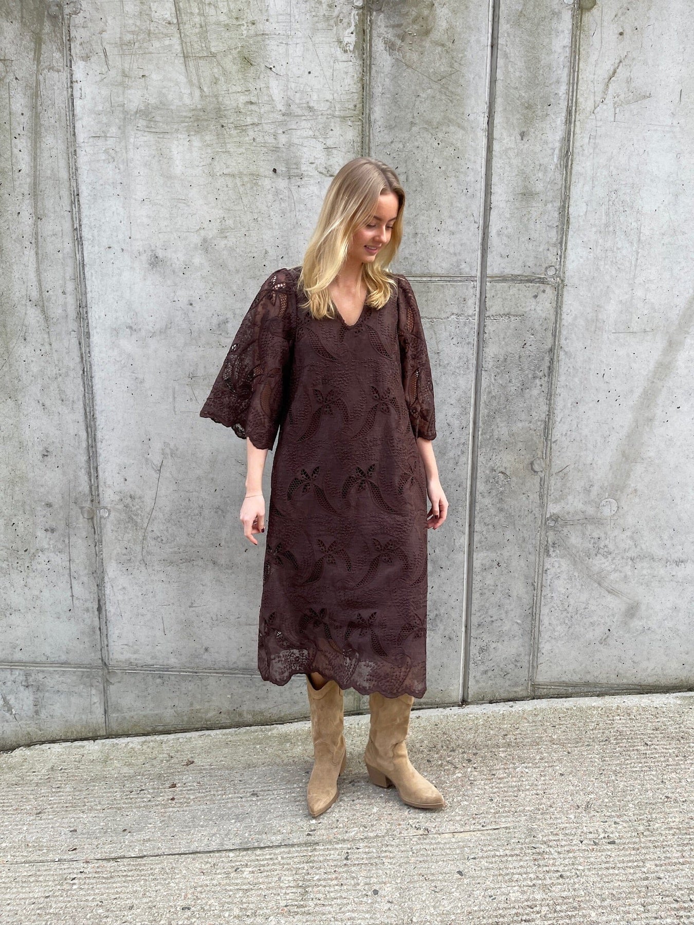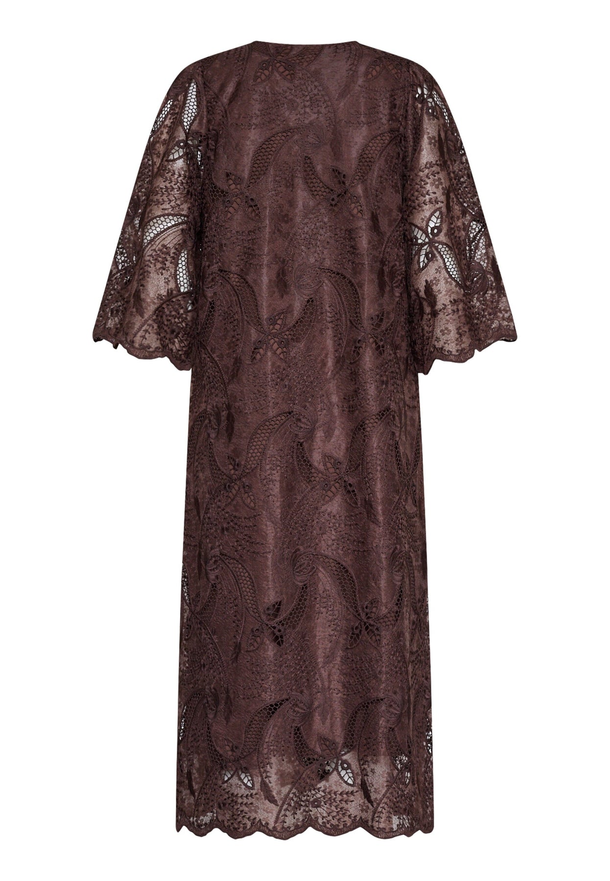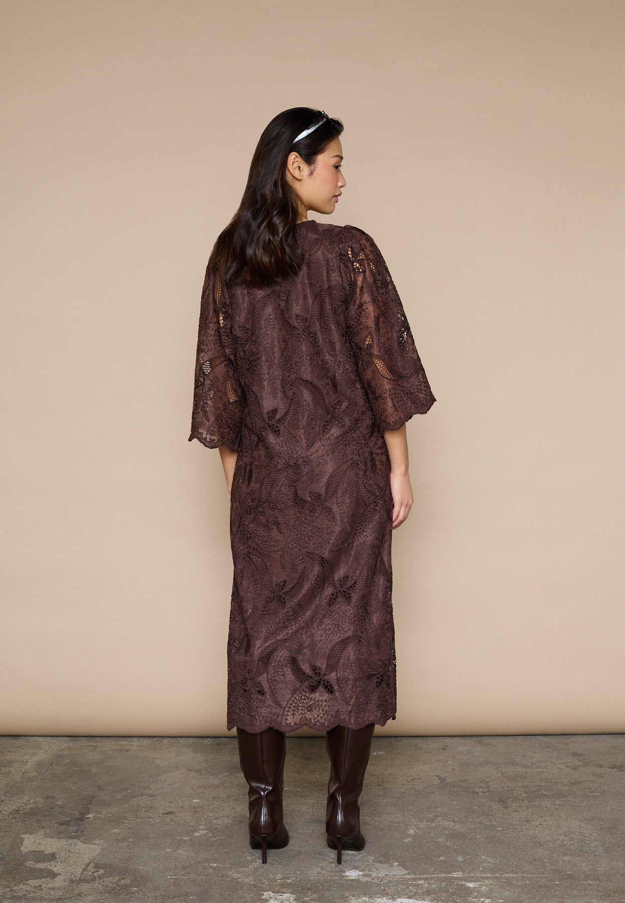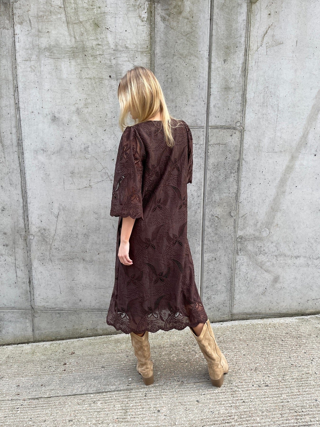 Braunes Kleid von Love & Divine mit Stickerei und Spitze. Das Kleid hat dreiviertellange Ärmel, einen V-Ausschnitt sowie ein Blumen- und Paisleymuster.