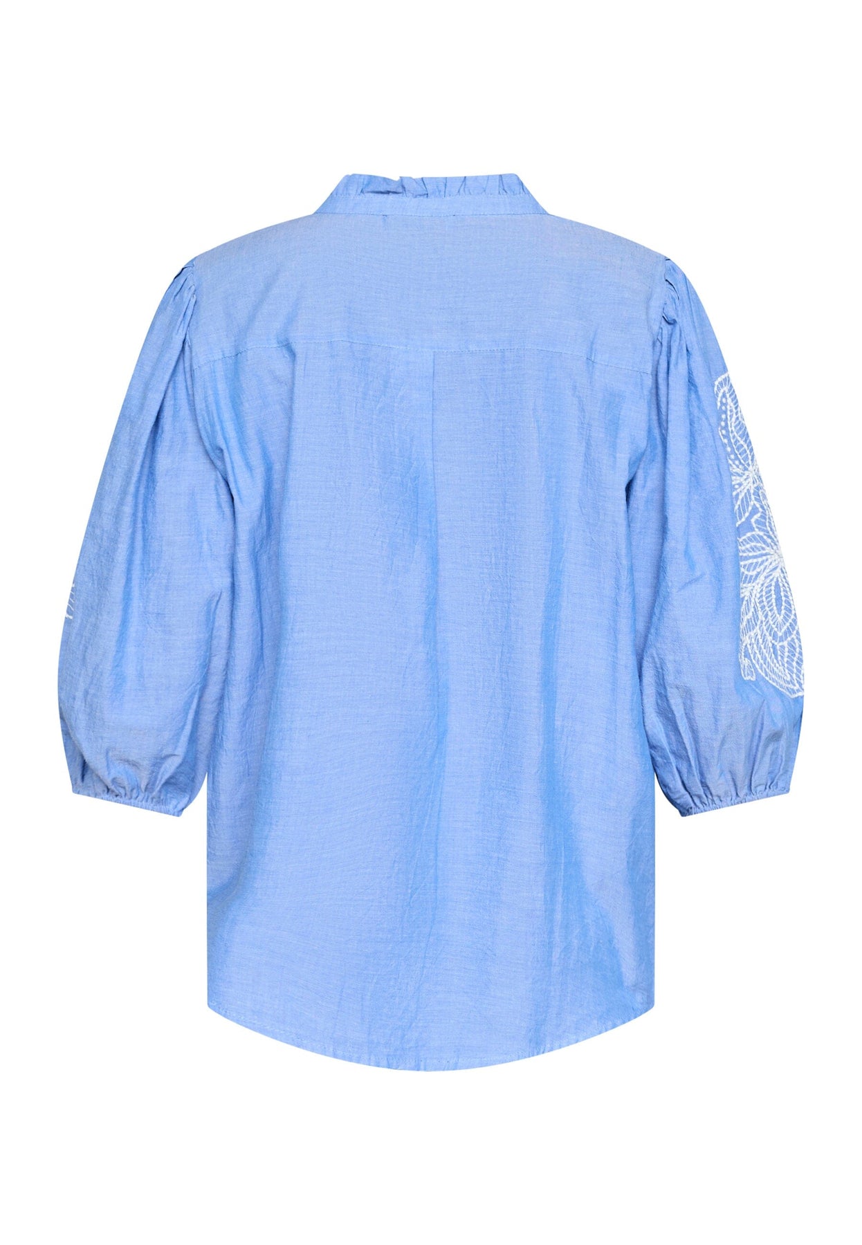 Blaue Bluse von Love & Divine mit weißen Blumenstickereien. Die Bluse besteht aus 100 % Baumwolle und hat eine lockere Passform mit 3/4-Ärmeln mit Puff.