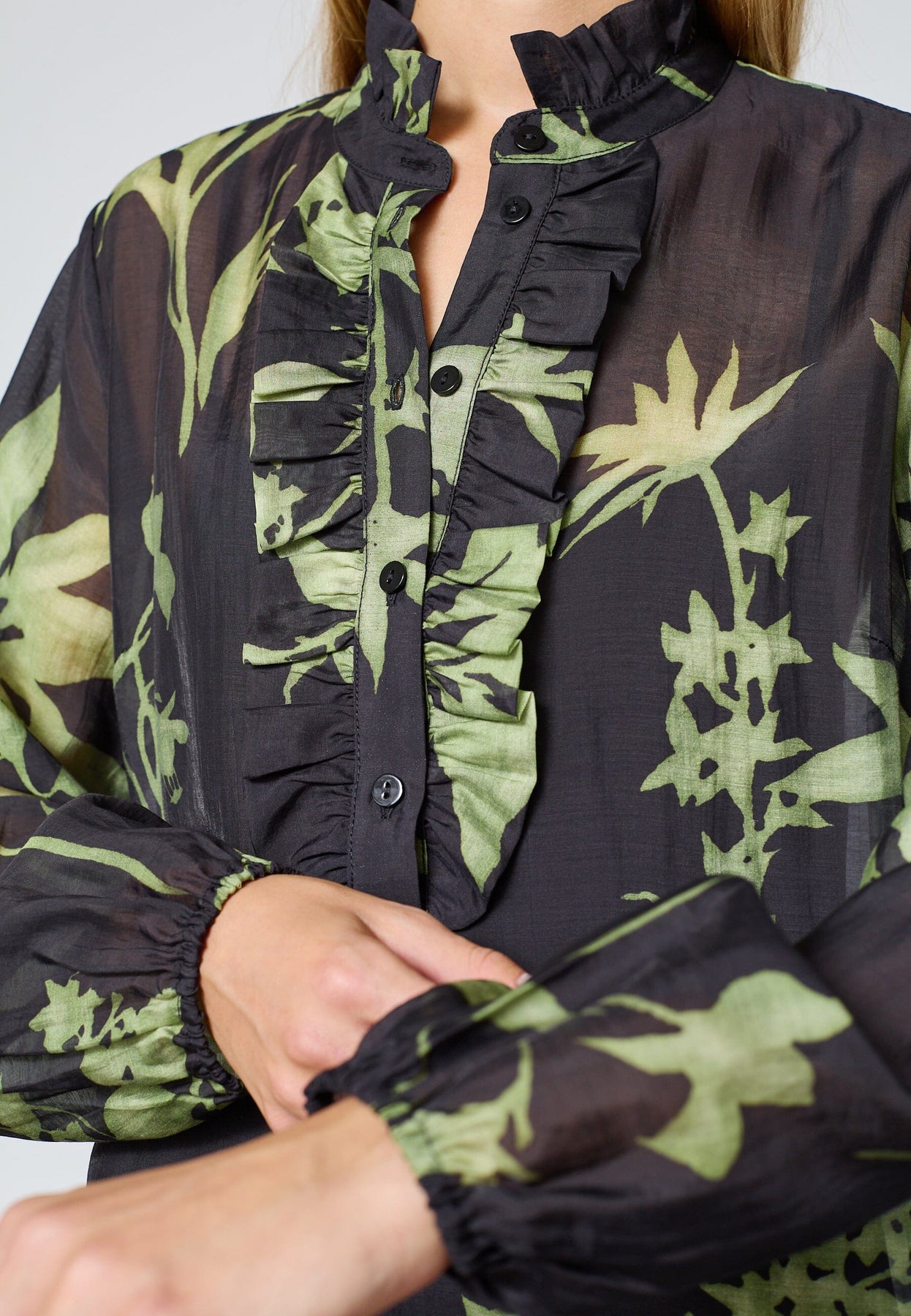 • Lange Ärmel mit Raffungen
