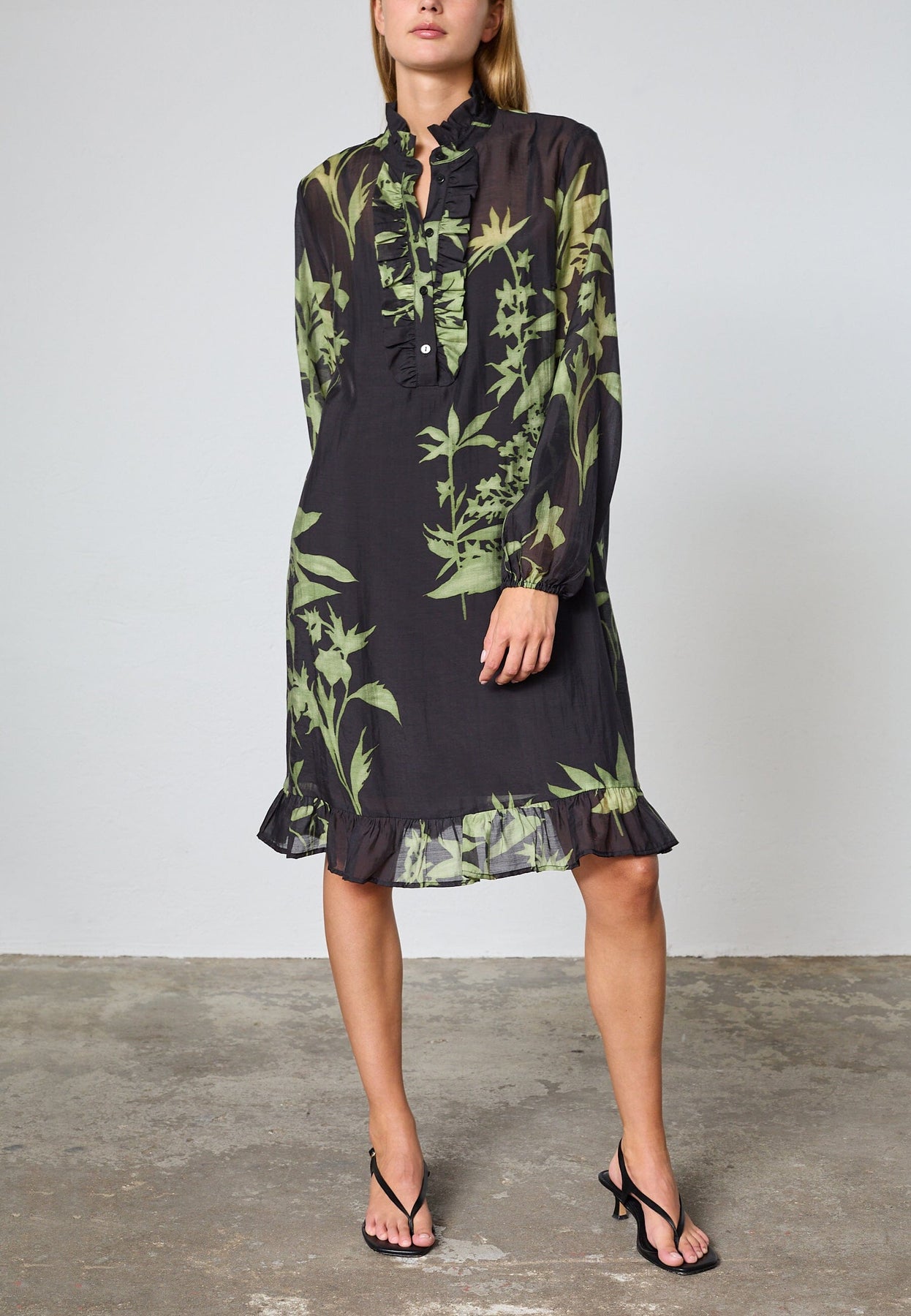 Knielanges Kleid von Love & Divine mit grünem Blattmuster auf dunklem Hintergrund. Das Kleid hat einen kleinen Stehkragen mit Rüschen und wird mit Knöpfen geschlossen.
