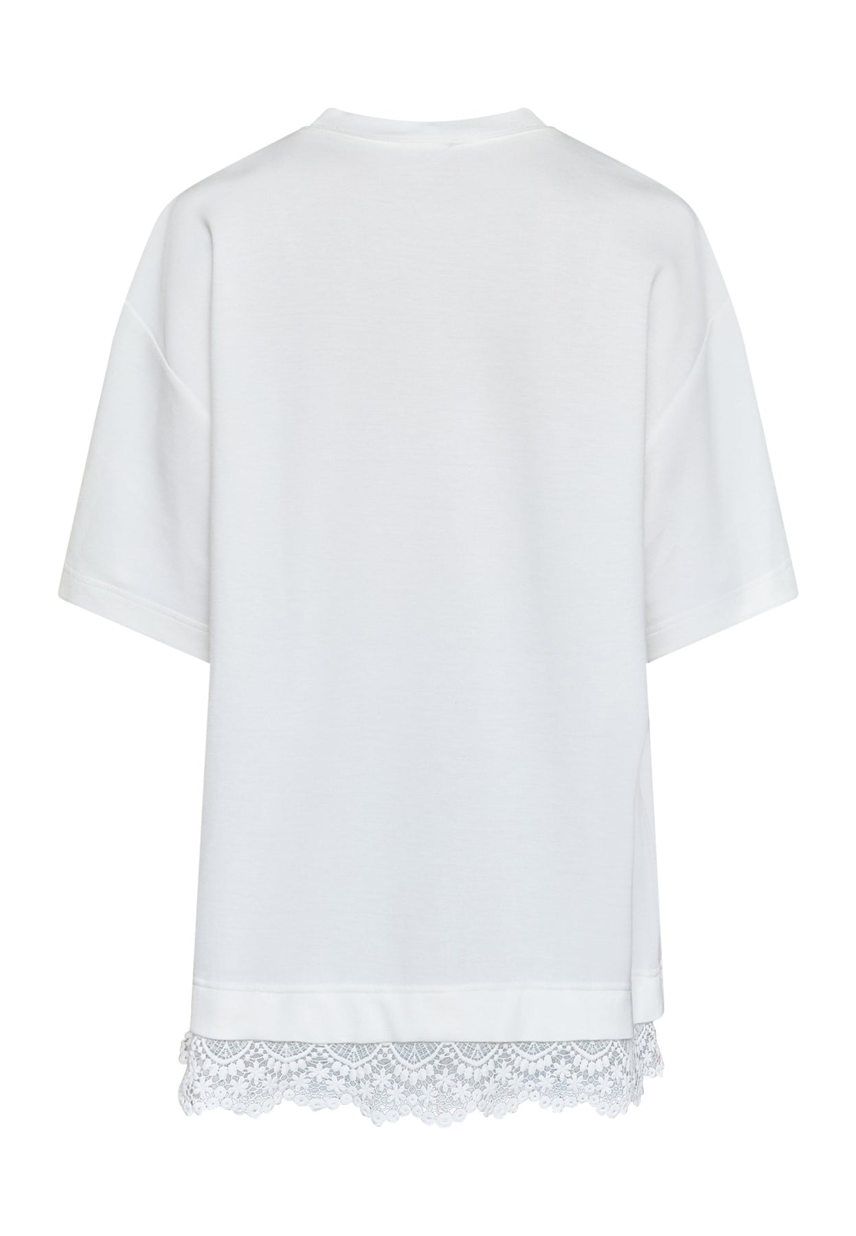 Weißes T-Shirt von Love & Divine mit aufgenähter Spitzenkante entlang des unteren Saums. Es hat eine oversized Passform mit kurzen Ärmeln.