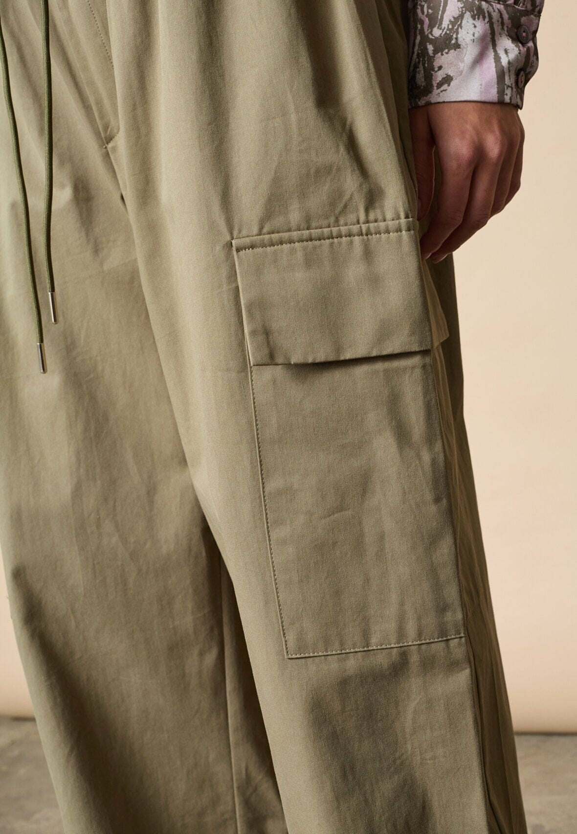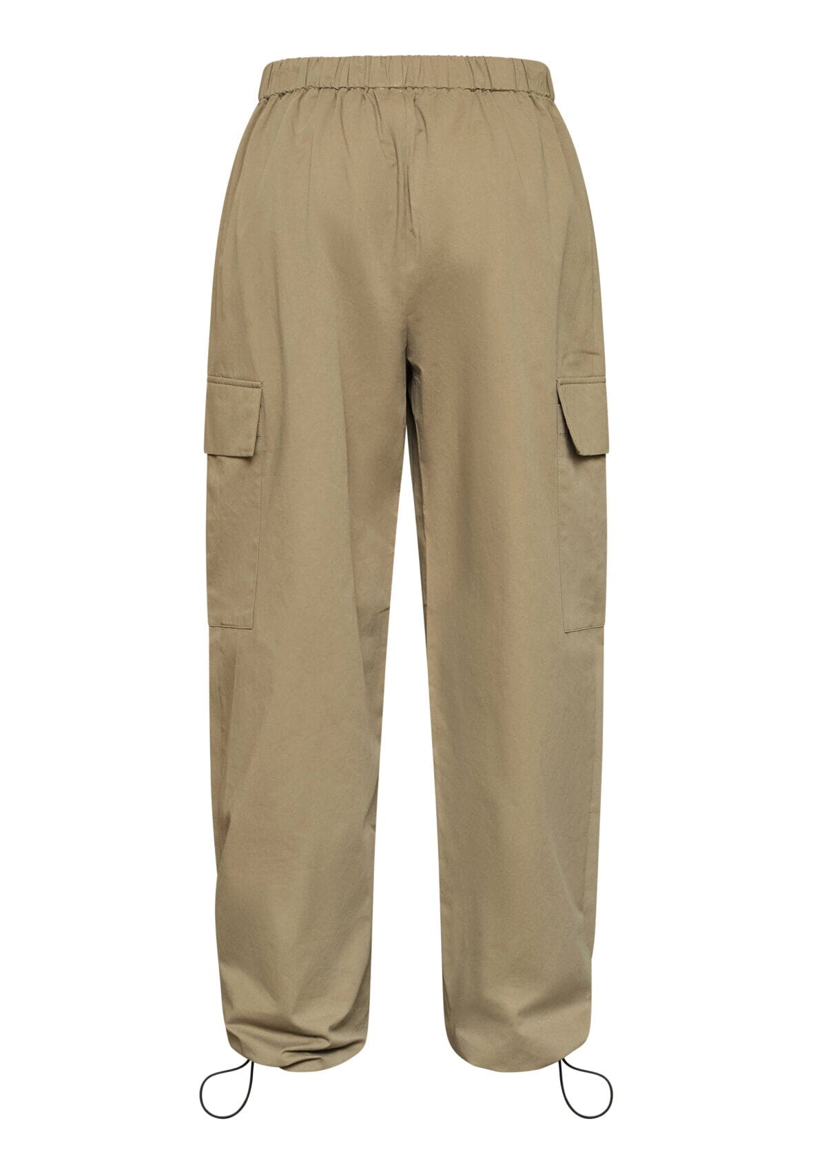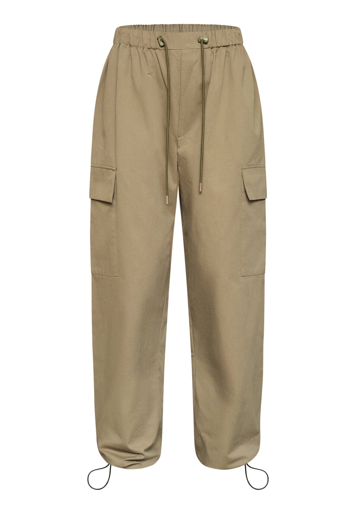 Olivgrüne Hose von Love & Divine aus Baumwolle. Die Hose hat eine lockere Passform und knöchellange Beine mit großen Seitentaschen und verstellbarem Kordelzug in der Taille.