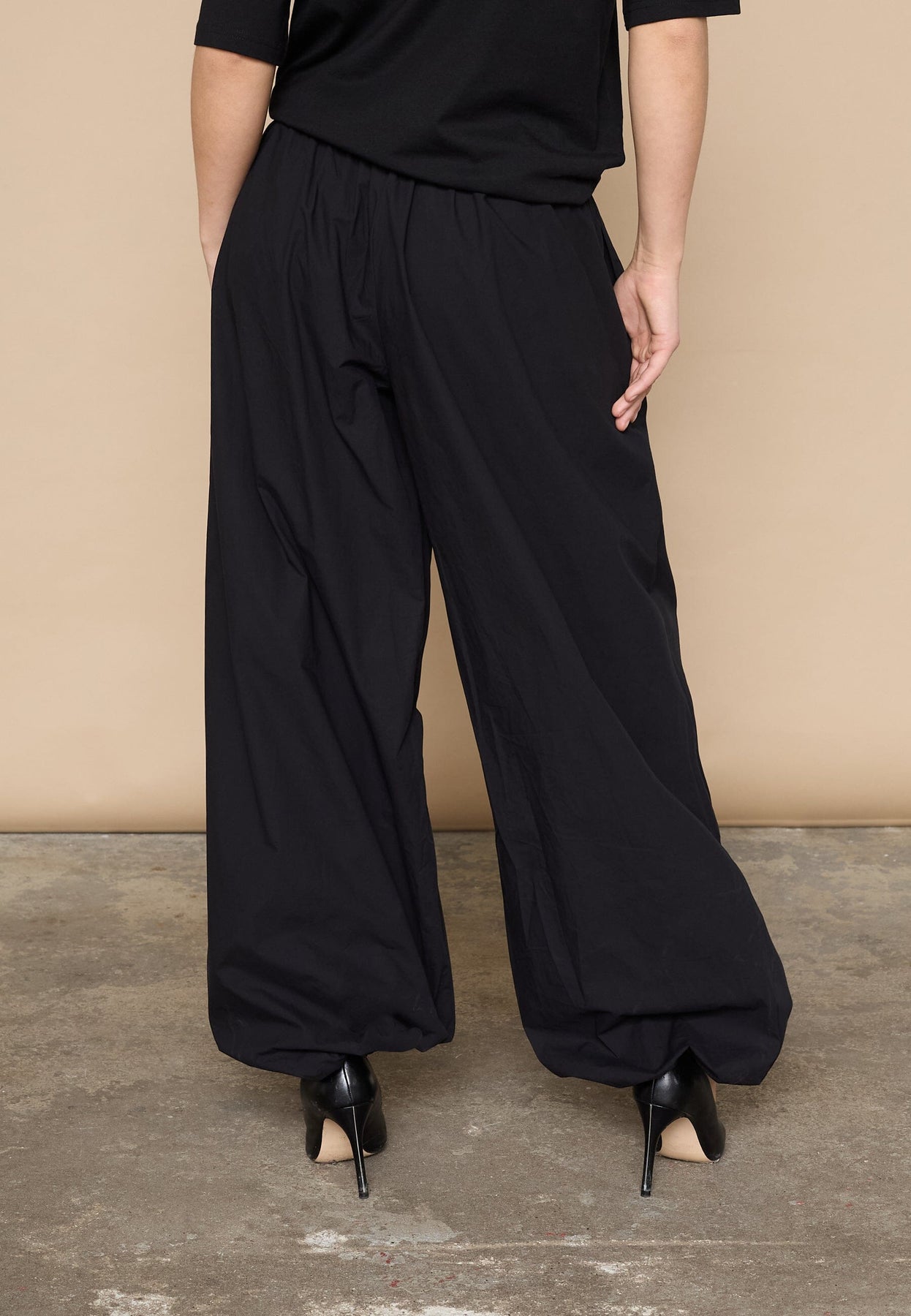 Schwarze Hose von Love & Divine aus Baumwolle. Die Hose hat eine lockere Passform mit weiten Beinen und einen elastischen Bund mit Kordelzug.