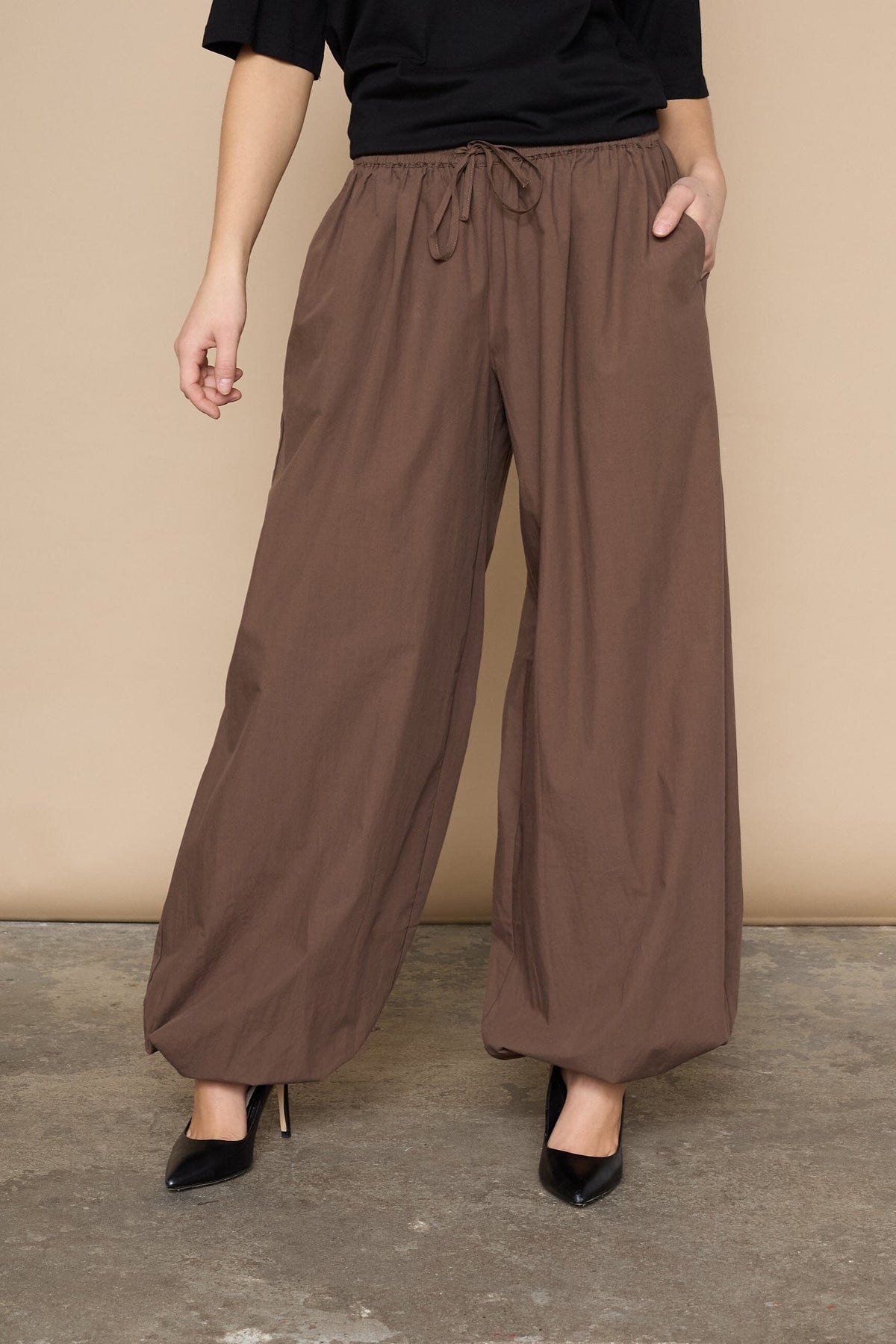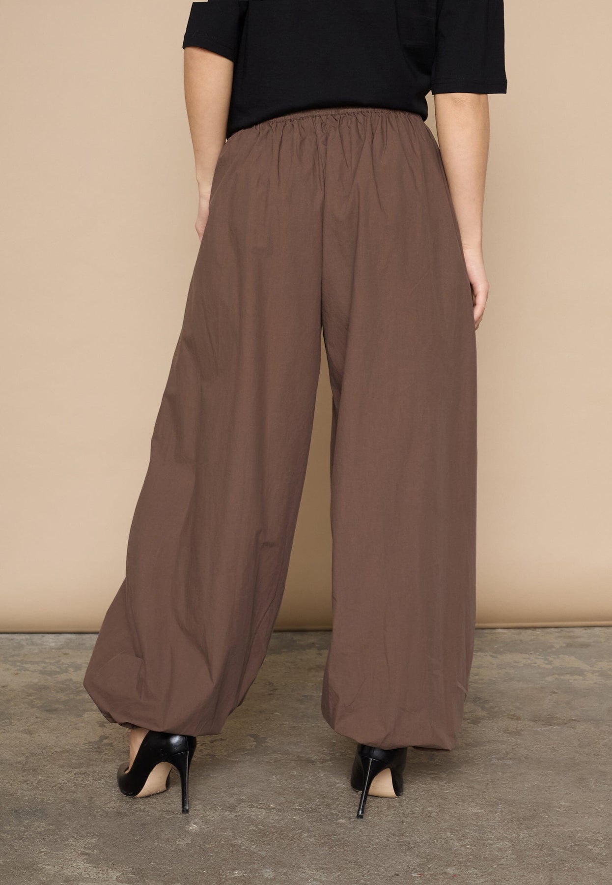 Dunkelbraune Hose von Love & Divine aus Baumwolle. Die Hose hat weite Beine und eine lockere Passform mit Gummizug und Kordelzug in der Taille.