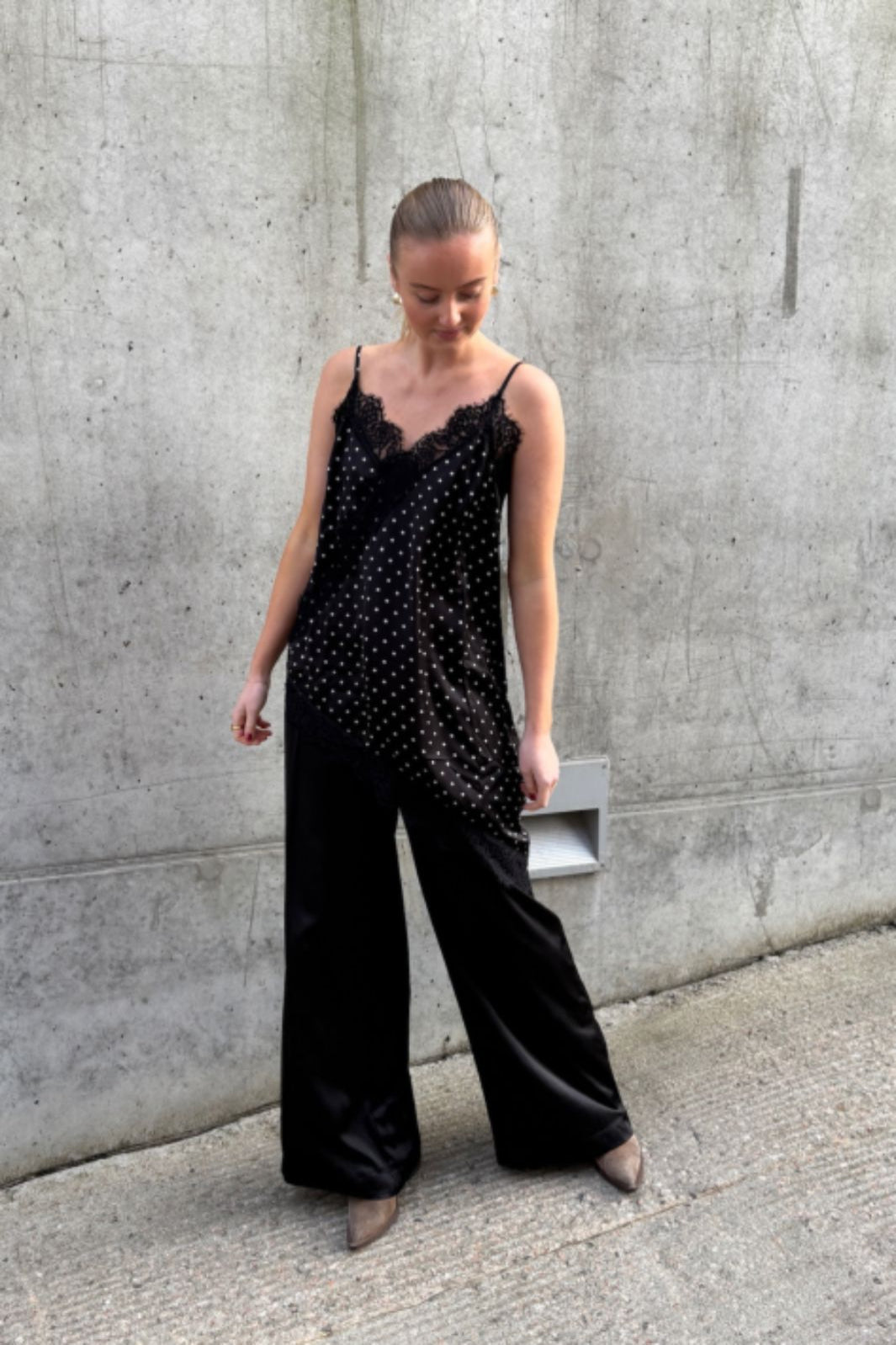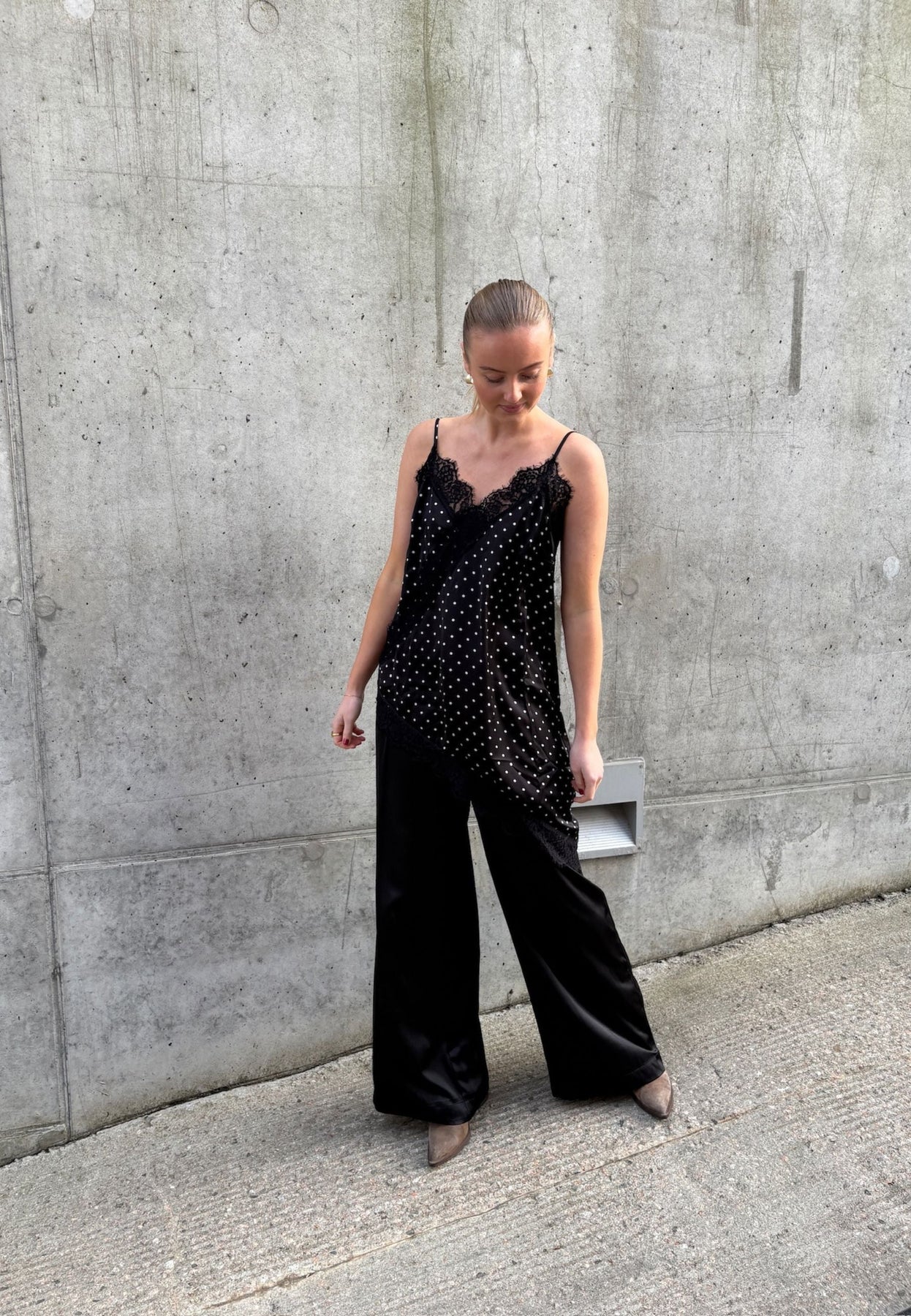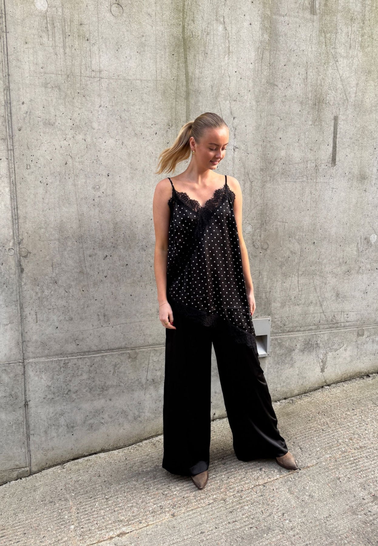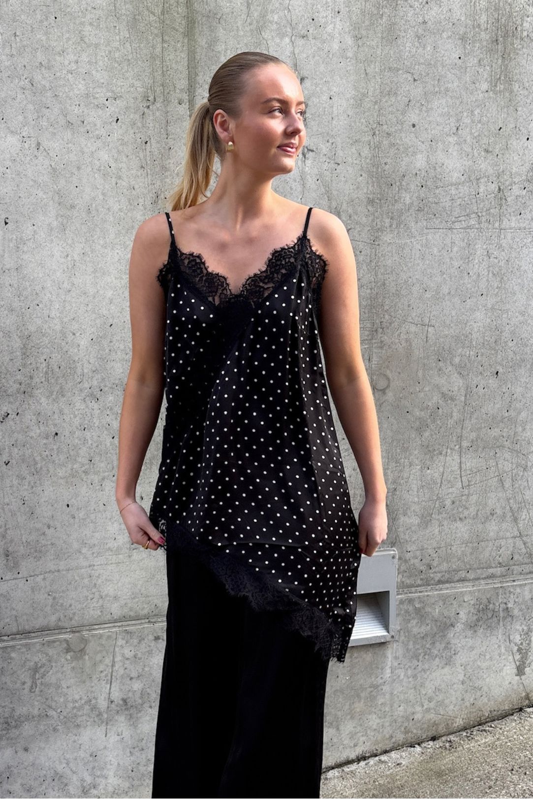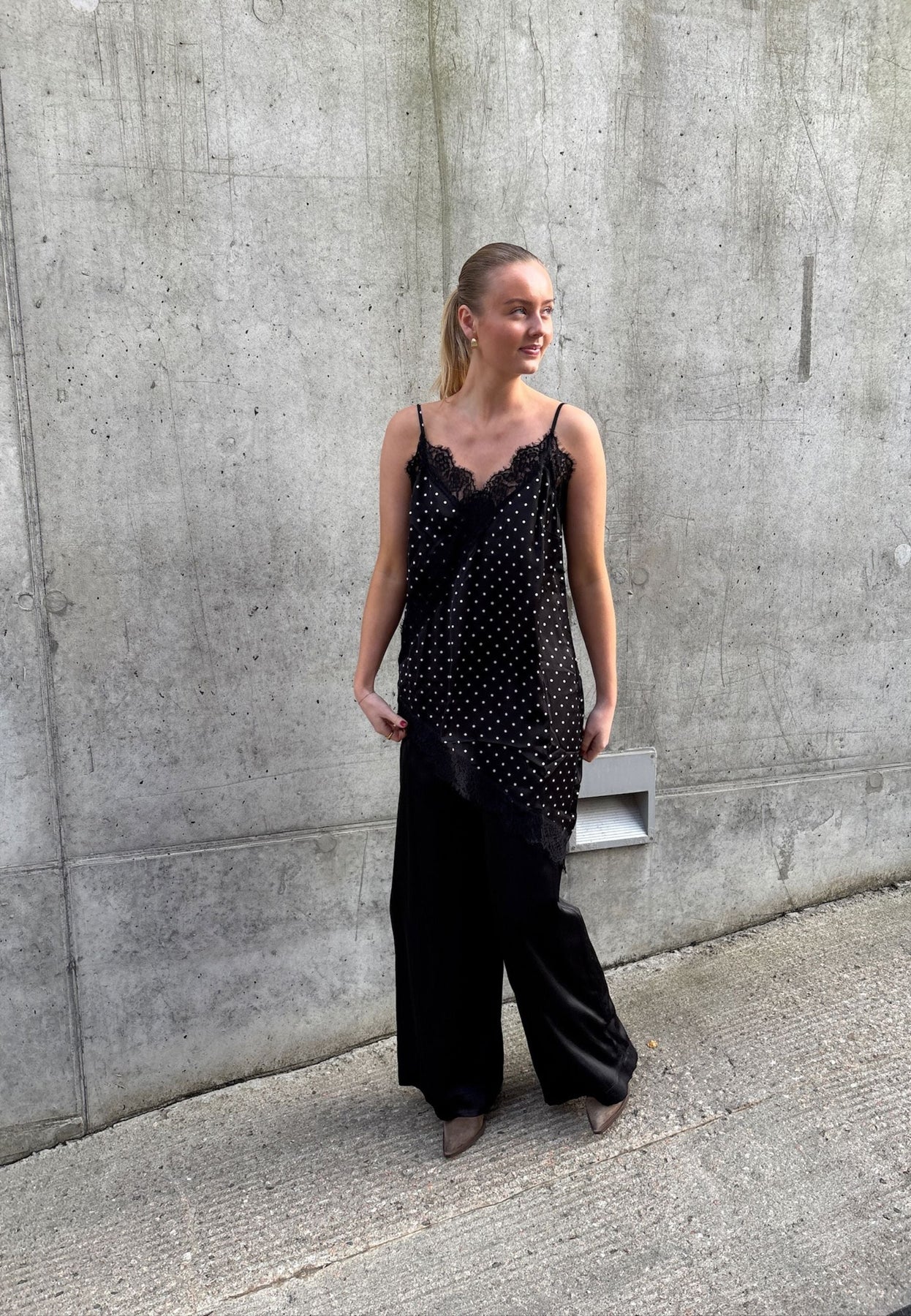 Schwarzes Top von Love & Divine mit weißen Punkten. Das Top hat dünne Spaghettiträger und einen asymmetrischen Spitzenabschluss am Saum.