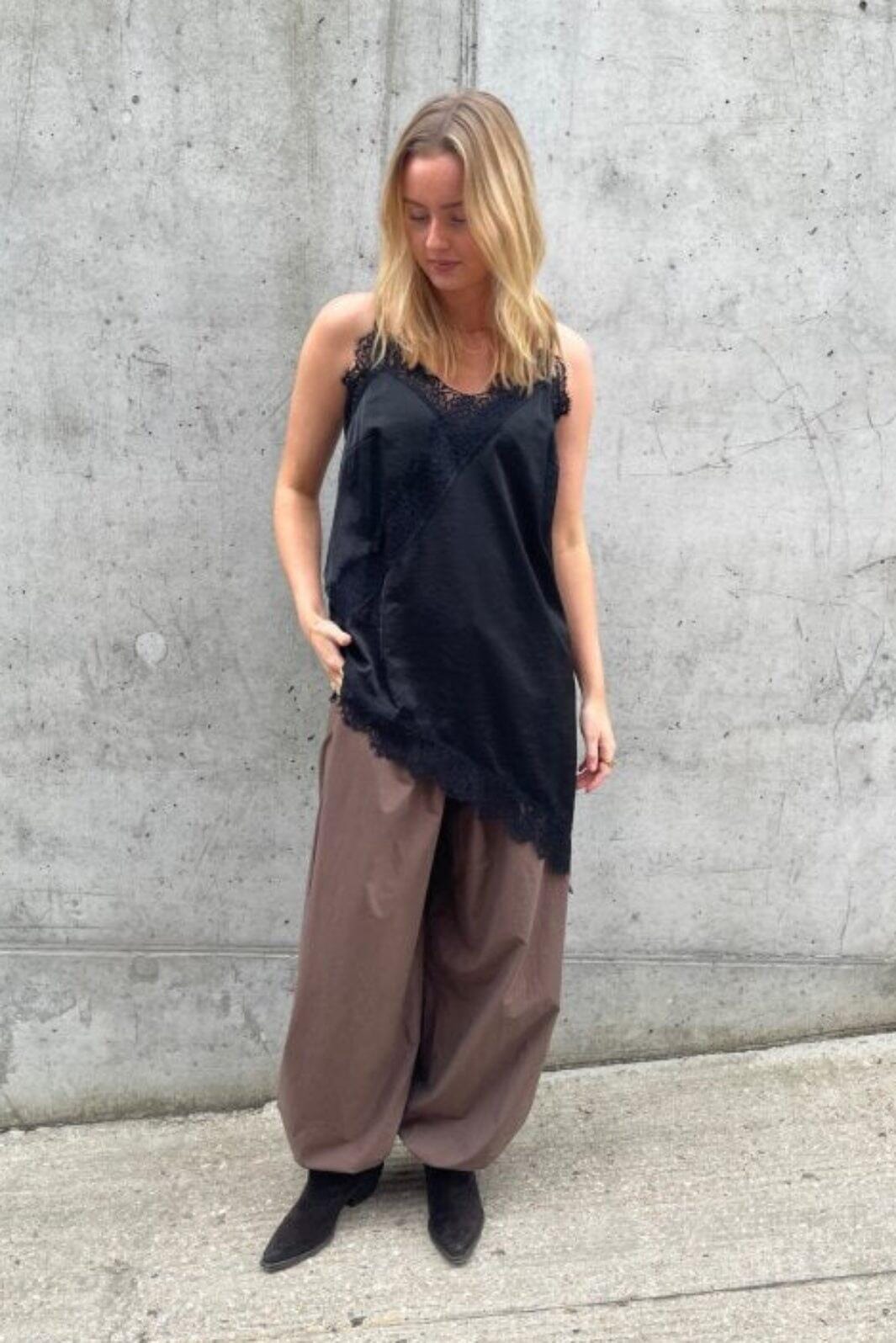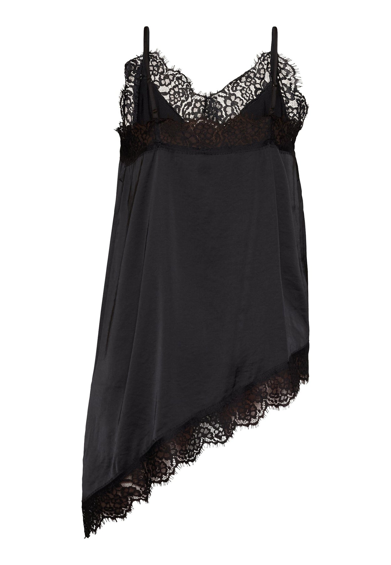 Schwarzes Top von Love & Divine mit Spitzendetails entlang des Halsausschnitts und einem asymmetrischen Spitzensaum am unteren Abschluss. Das Top hat dünne Träger und einen V-Ausschnitt.