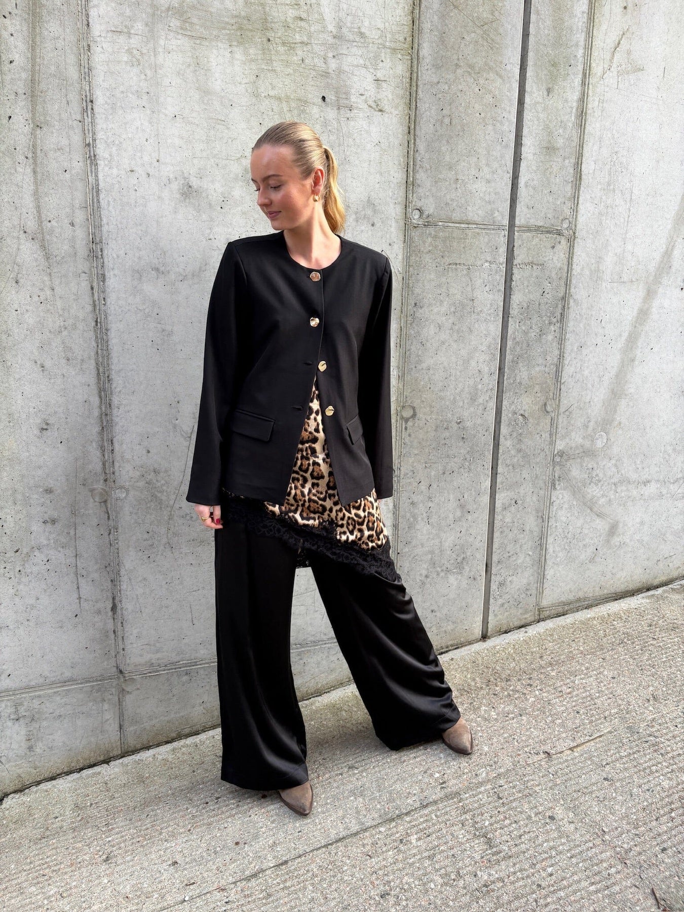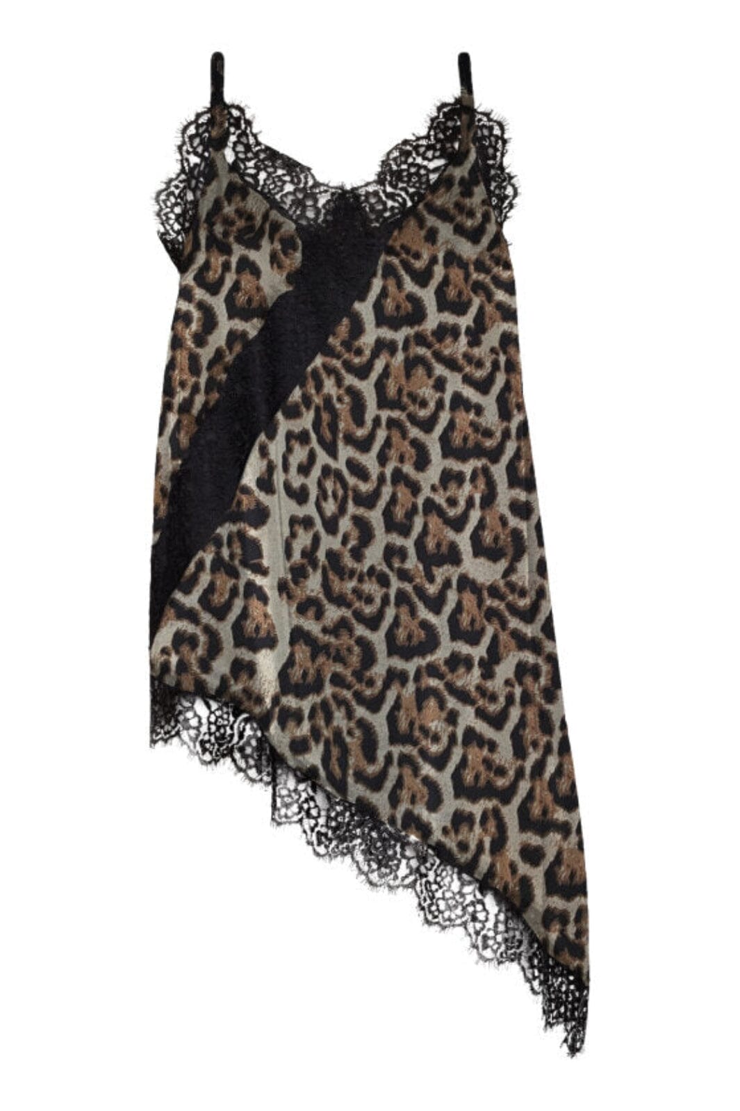 Top von Love & Divine mit Leopardenmuster in braunen und beigen Nuancen auf schwarzem Hintergrund. Das Top hat Spitzendetails und ein asymmetrisches Design mit schrägem Saum.