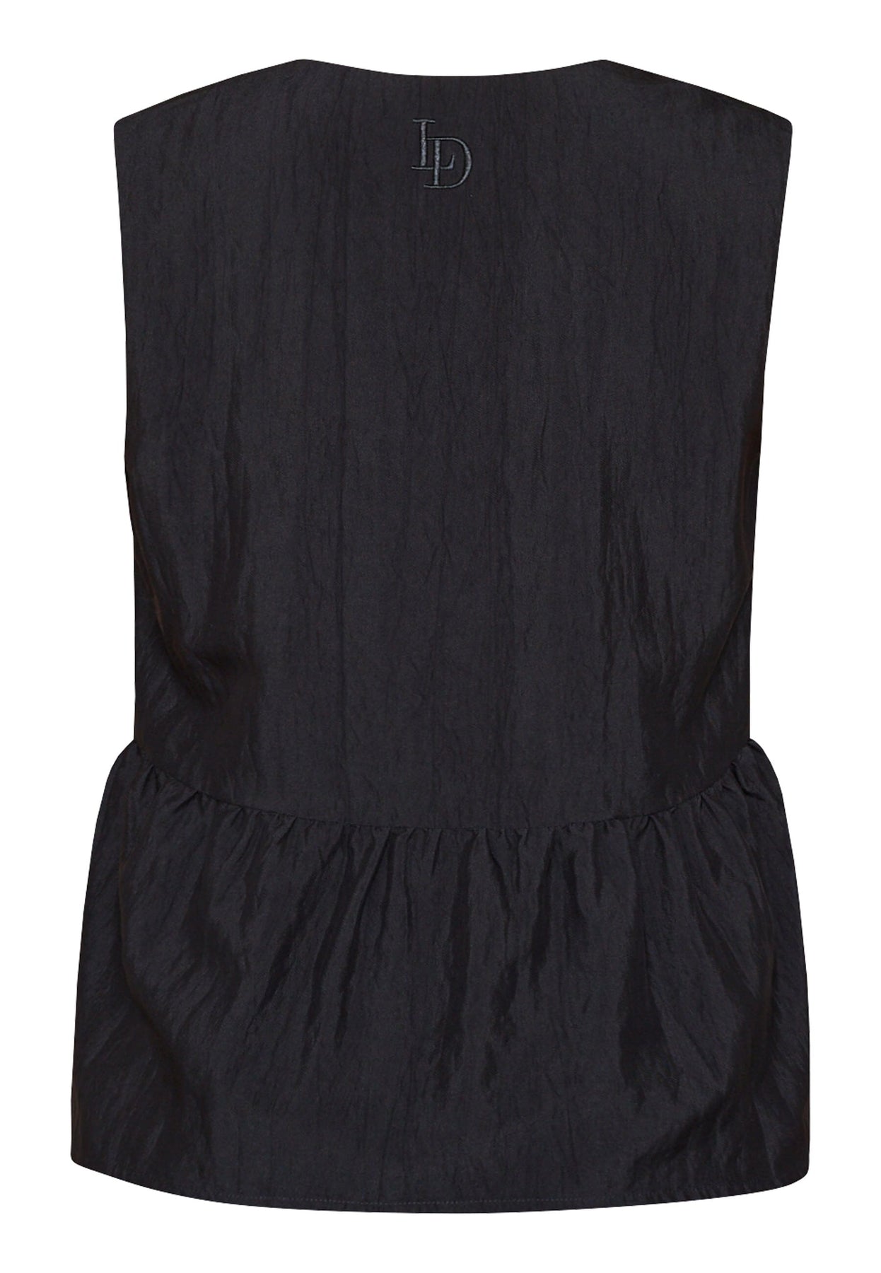 Schwarzes ärmelloses Top von Love & Divine mit V-Ausschnitt und Rüschen. Das Top hat eine Knopfleiste und ist in einem einfarbigen schwarzen Design gefertigt.