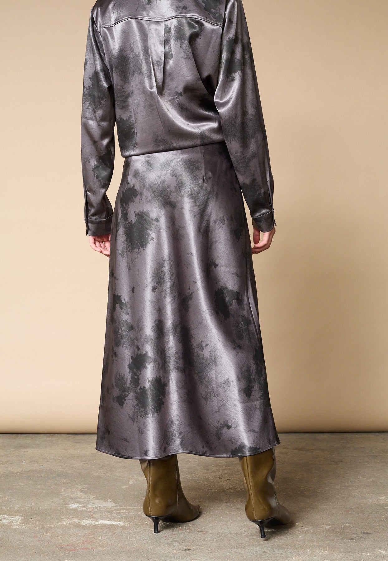 Rock von Love & Divine in Grau- und Silbernuancen mit einem marmorierten Acid-Wash-Muster aus glänzendem Polyester.