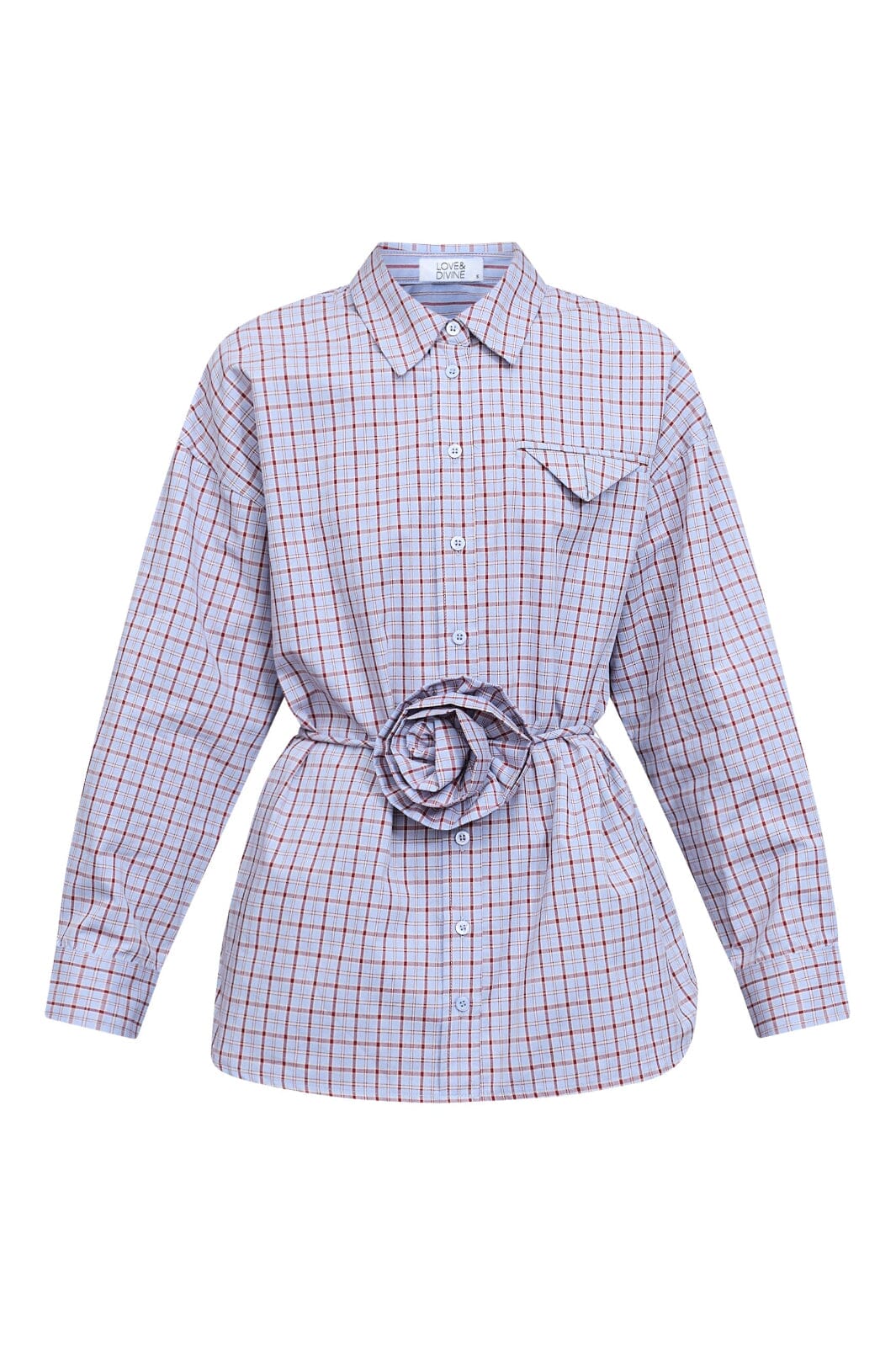 Kariertes Hemd von Love & Divine in hellblauen, blauen und roten Nuancen. Das Hemd hat einen klassischen Hemdkragen und eine oversized Passform mit langen Ärmeln.