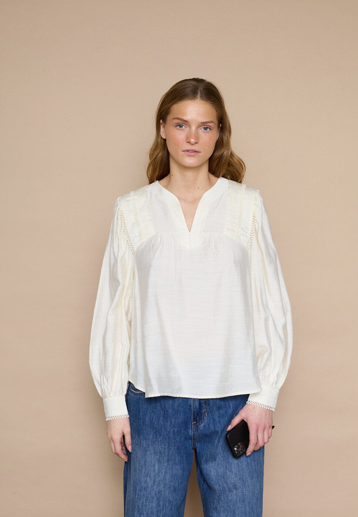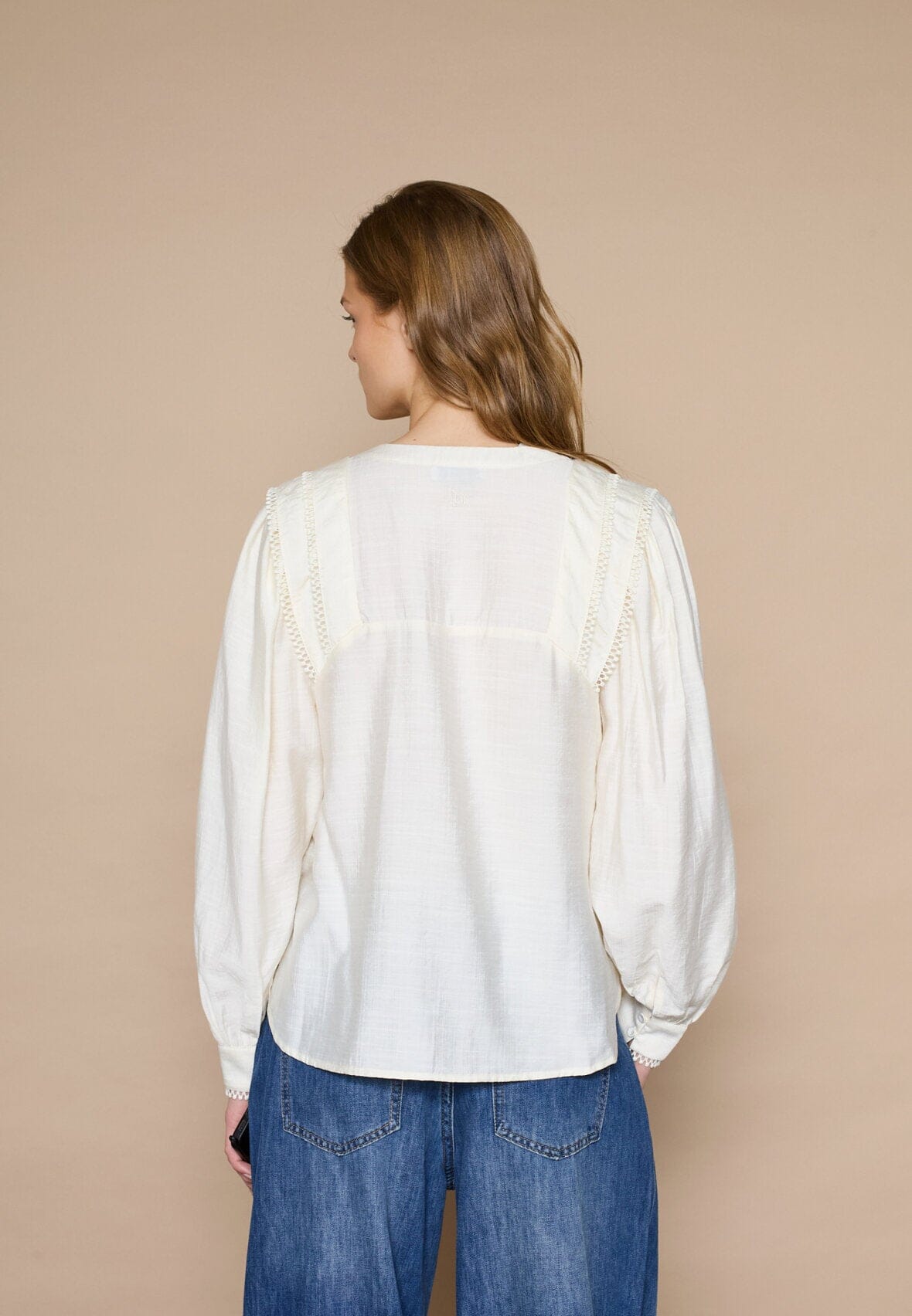 Cremefarbene Bluse von Love & Divine mit lockerer Passform und langen Ärmeln. Die Bluse hat einen V-Ausschnitt und dekorative Rüschen-Details an den Schultern und Manschetten.