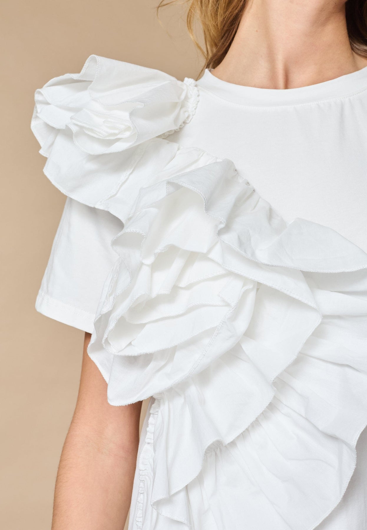 Weißes T-Shirt von Love & Divine mit asymmetrischem Design. Das Oberteil ist mit großen, voluminösen Rüschen über einer Schulter und der Brust verziert.