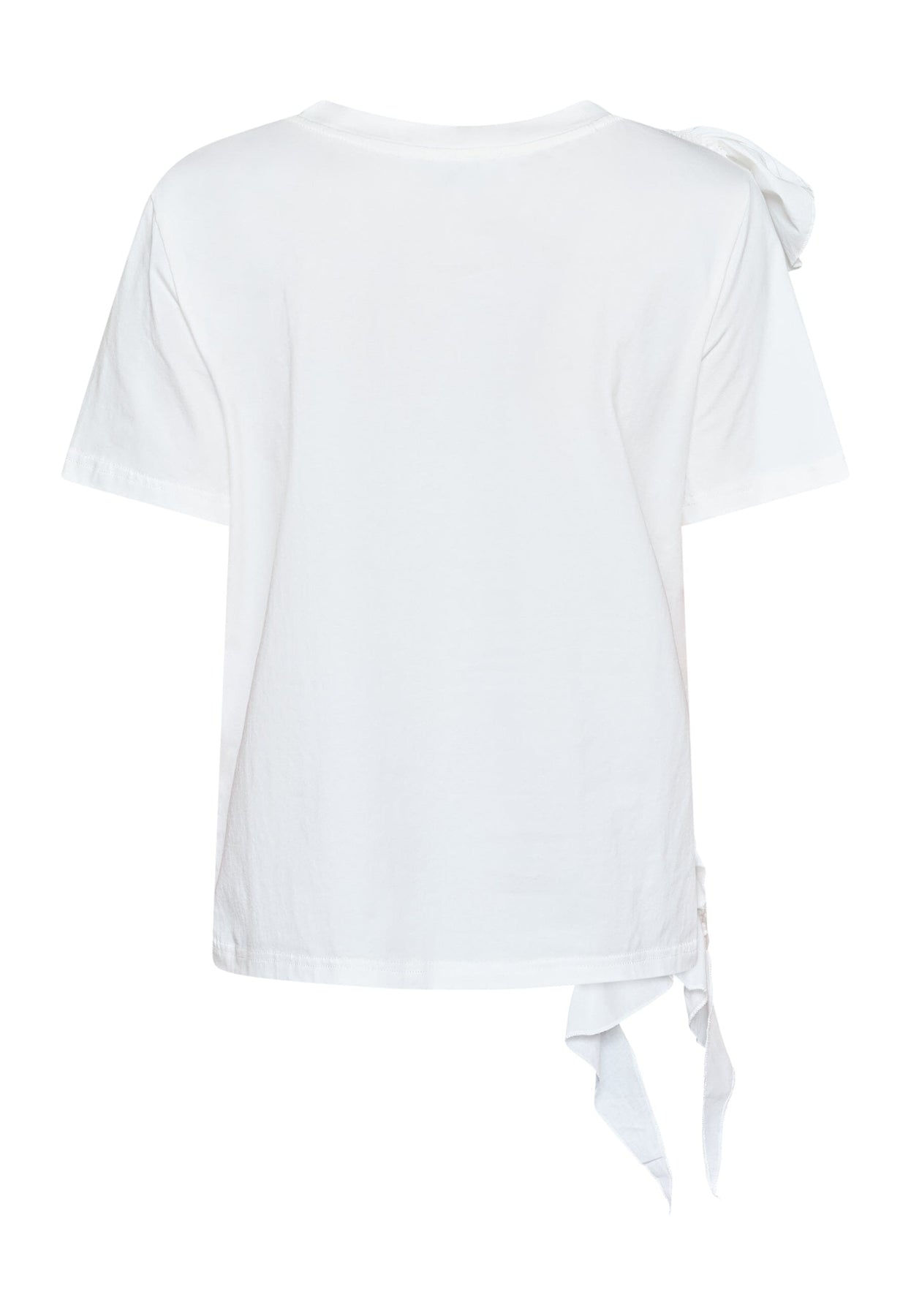 Weißes T-Shirt von Love & Divine mit asymmetrischem Design. Das Oberteil ist mit großen, voluminösen Rüschen über einer Schulter und der Brust verziert.