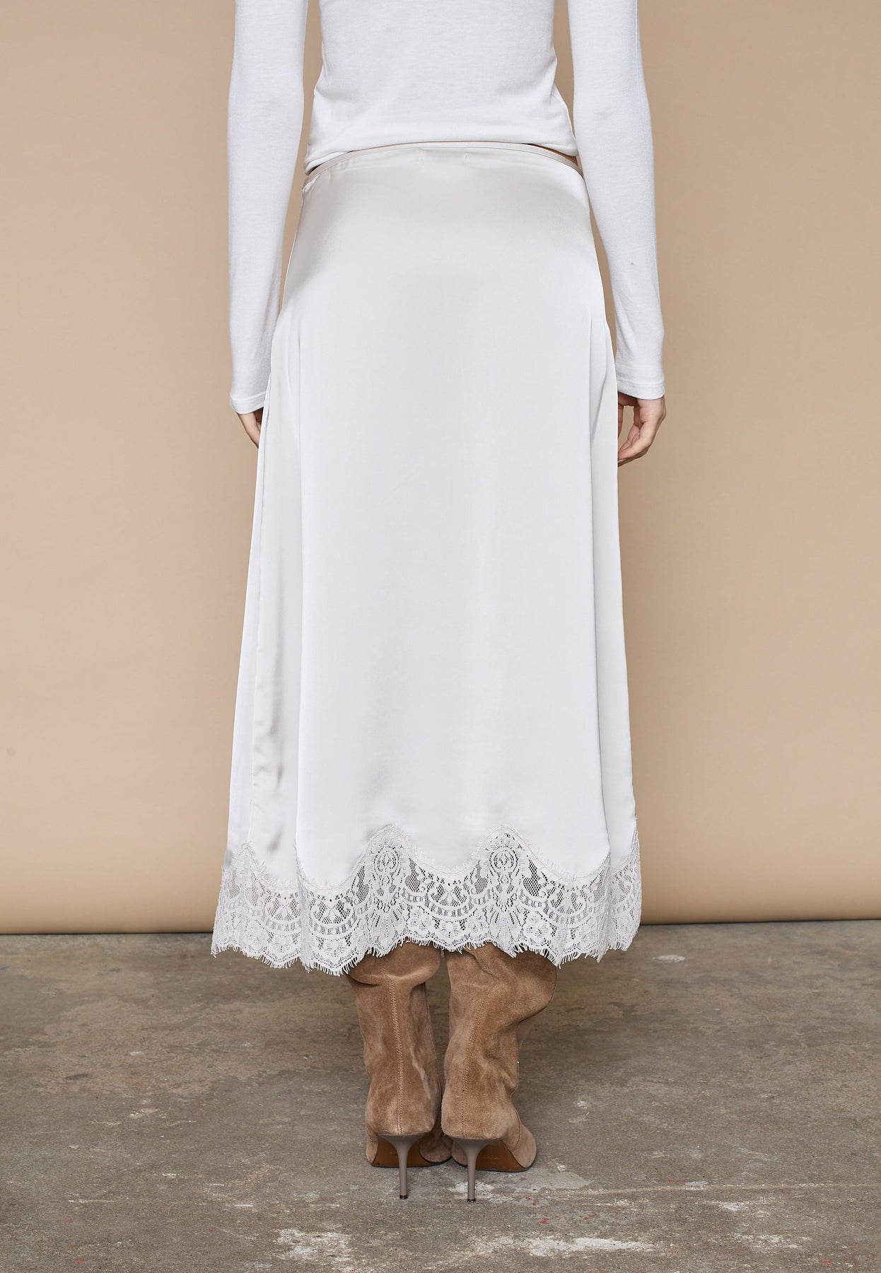 Ein langer Rock von Love & Divine in weißer und cremefarbener Nuance. Der Rock hat eine glatte, glänzende Oberfläche mit Spitzenkante entlang des Saums.