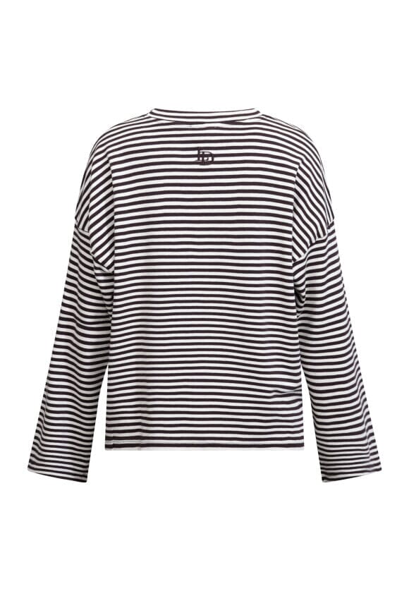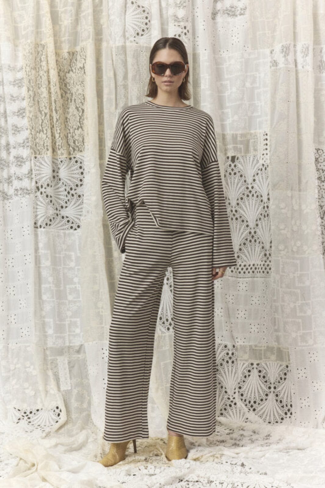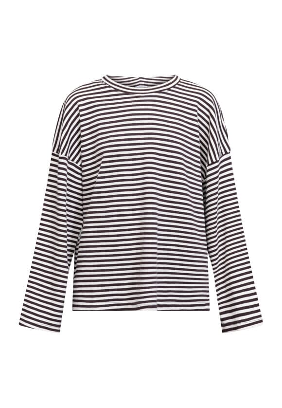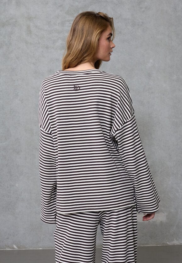 Gestreiftes Top von Love & Divine in Creme und Braun. Das Top besteht aus 100 % Baumwolle und hat lange Ärmel mit rundem Halsausschnitt.