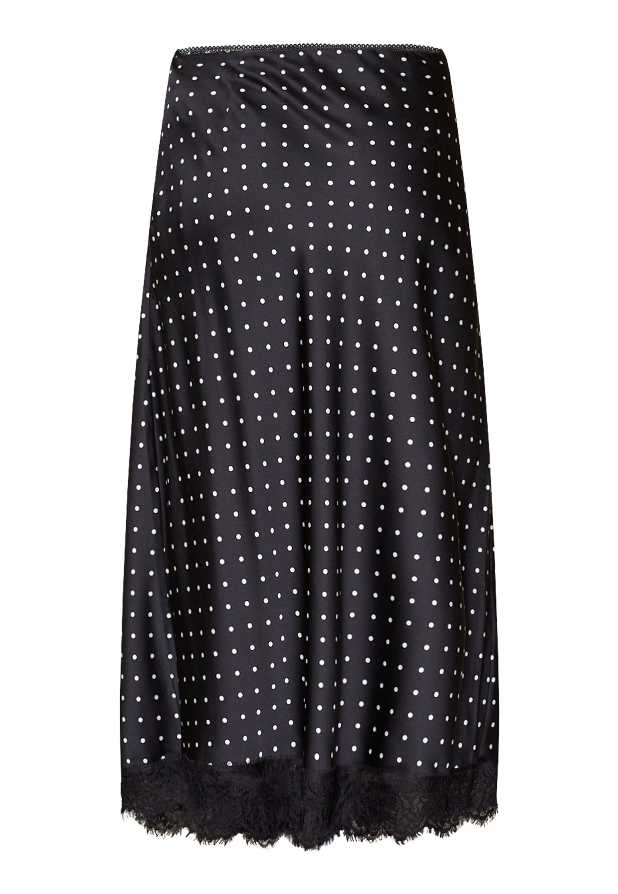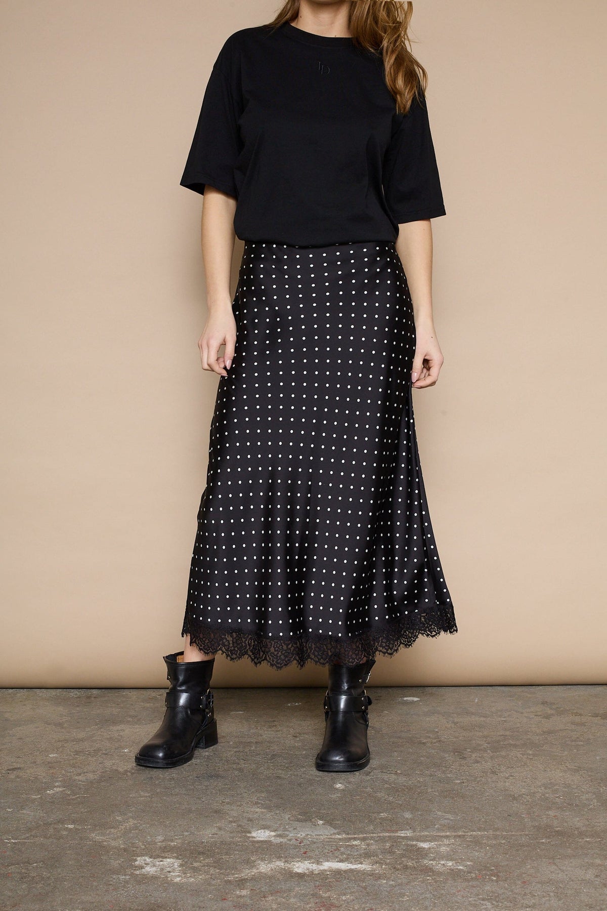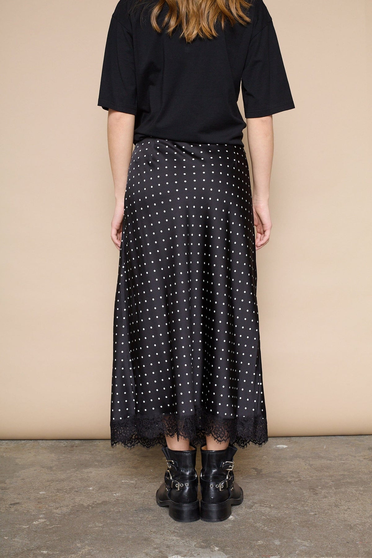 Schwarzer Rock von Love & Divine mit weißen Punkten. Der Rock hat eine Spitzenkante am Saum und reicht bis zur Mitte der Wade.