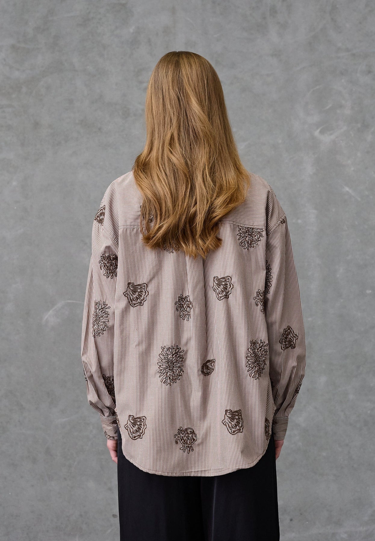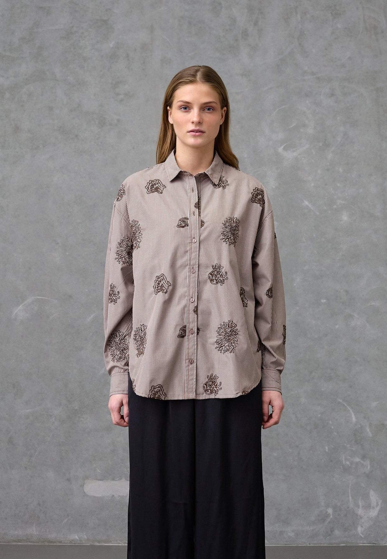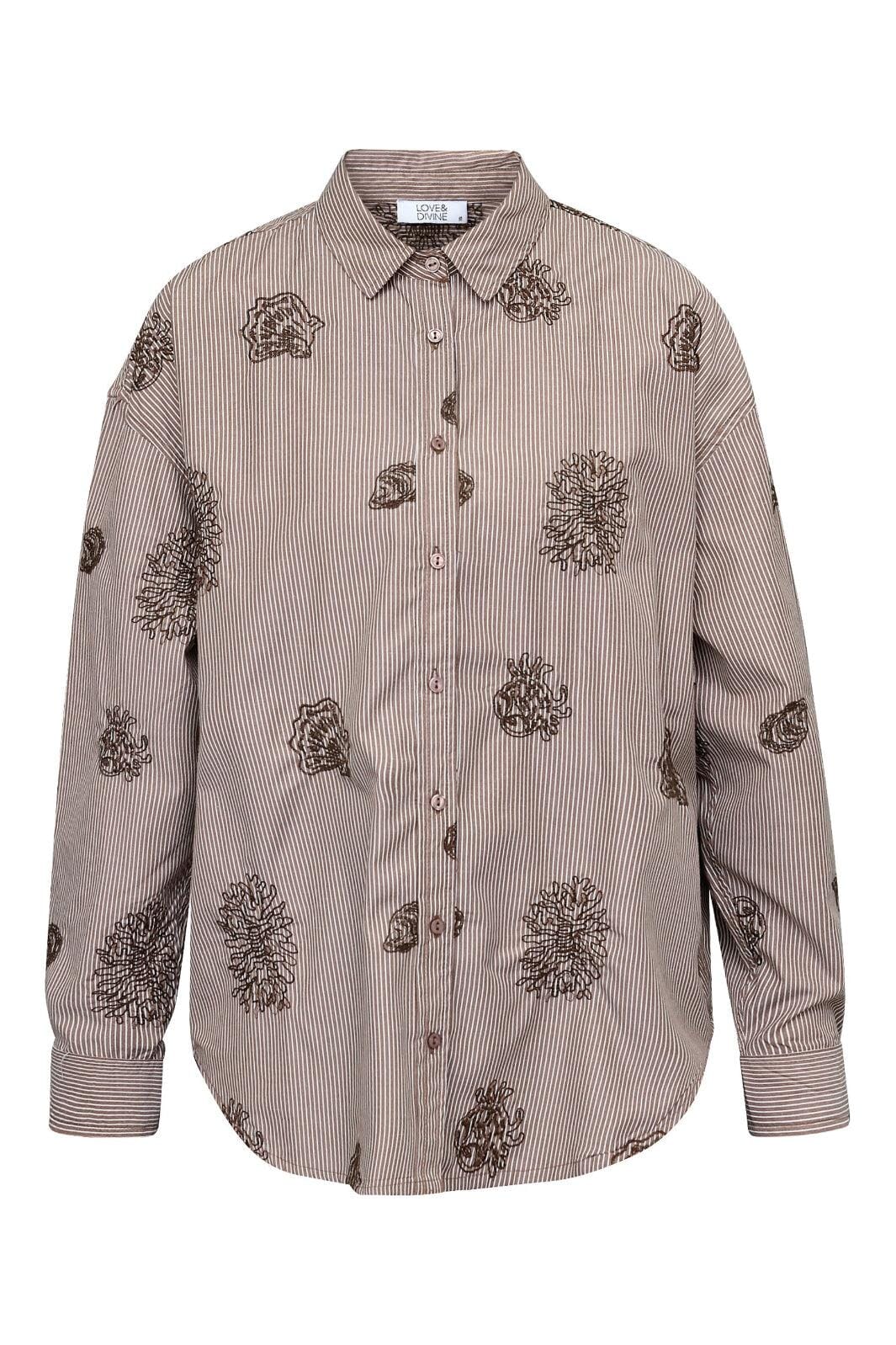 Braun gestreiftes Hemd von Love & Divine aus 100 % Baumwolle. Das Hemd hat ein Paisleymuster mit Stickerei auf den braunen Streifen.