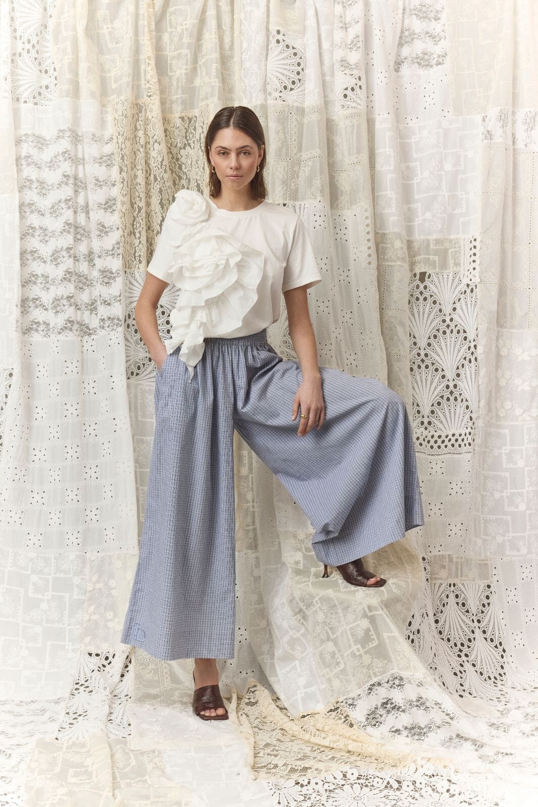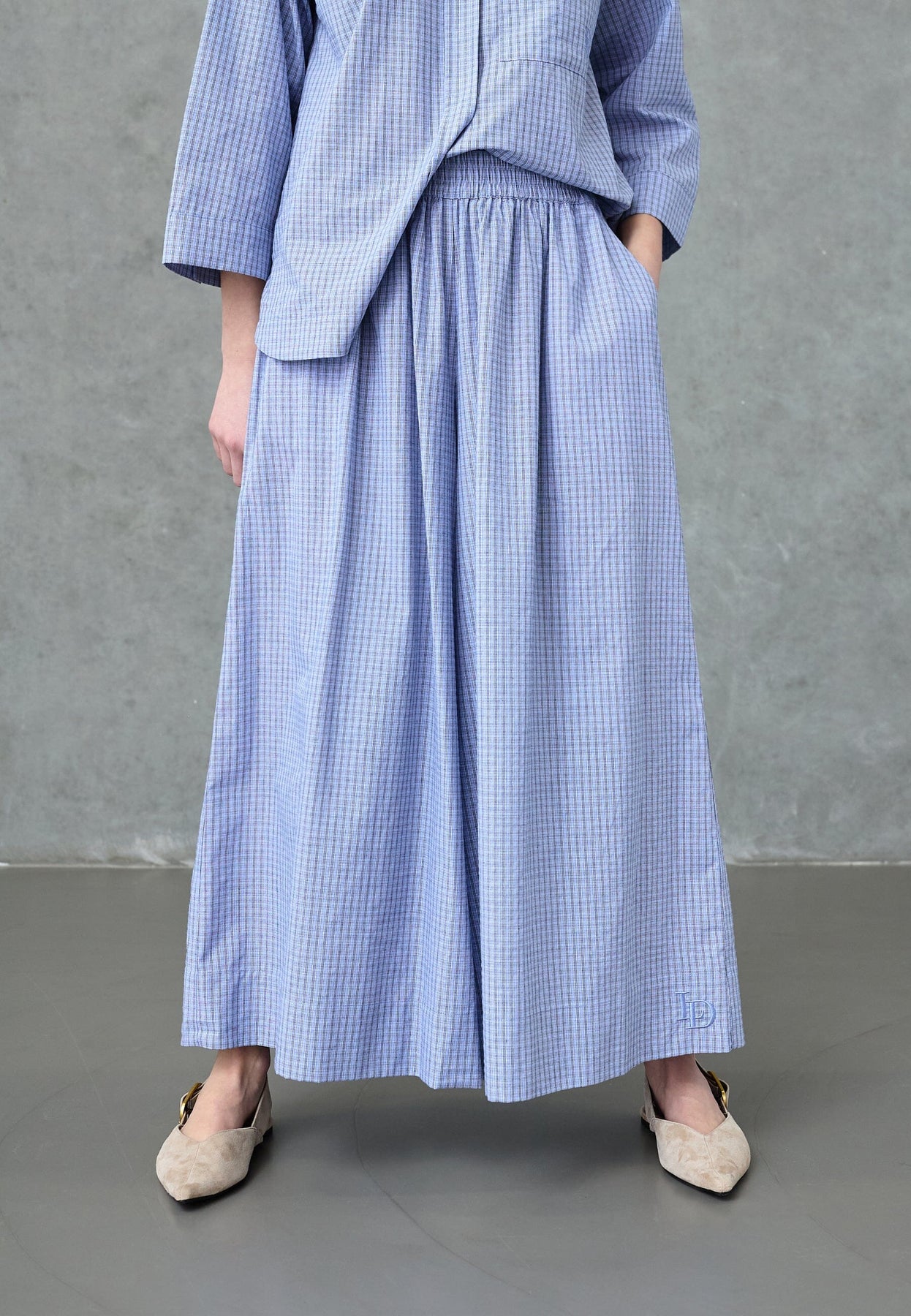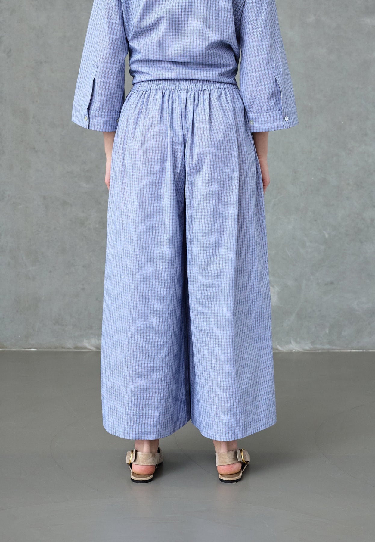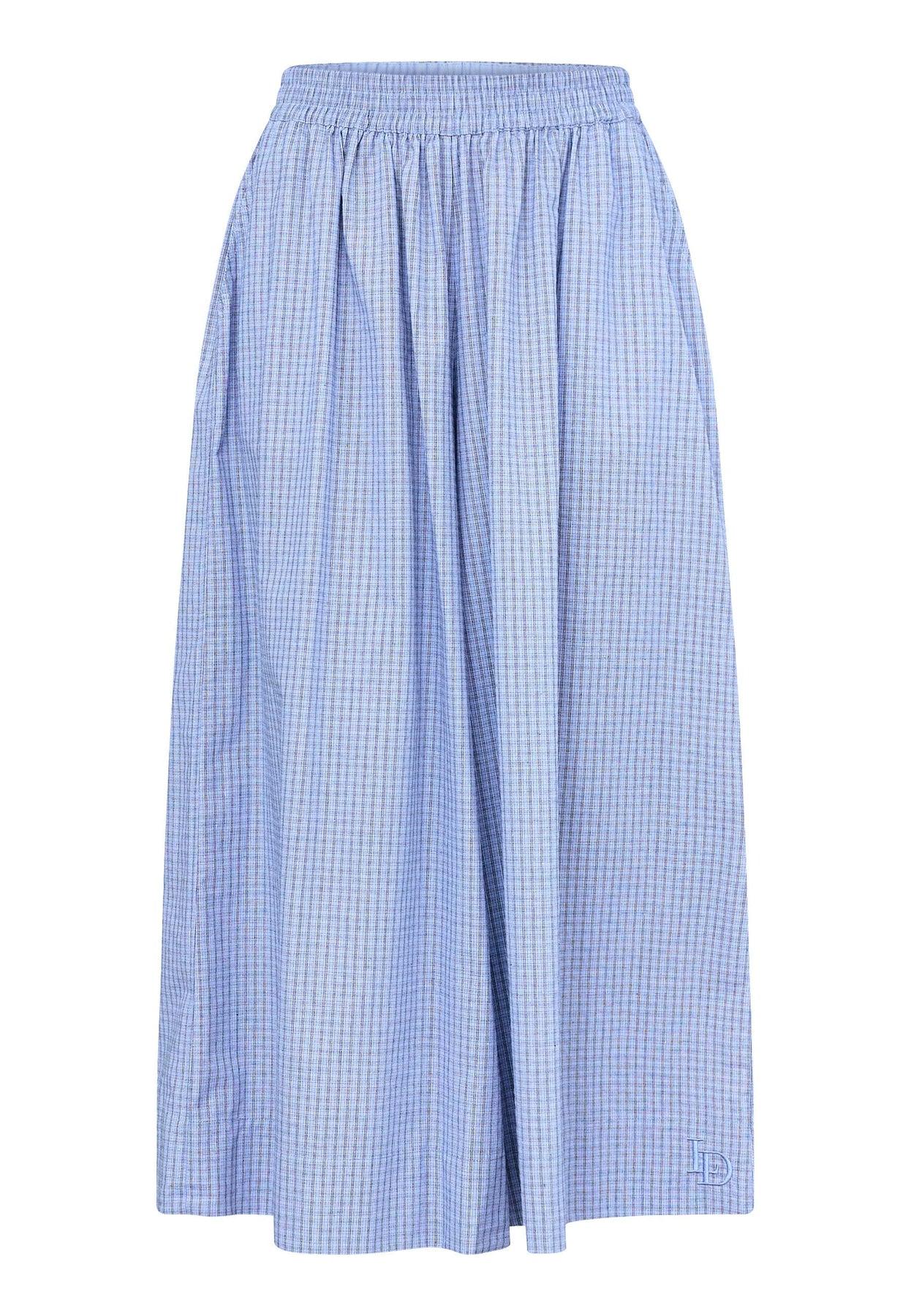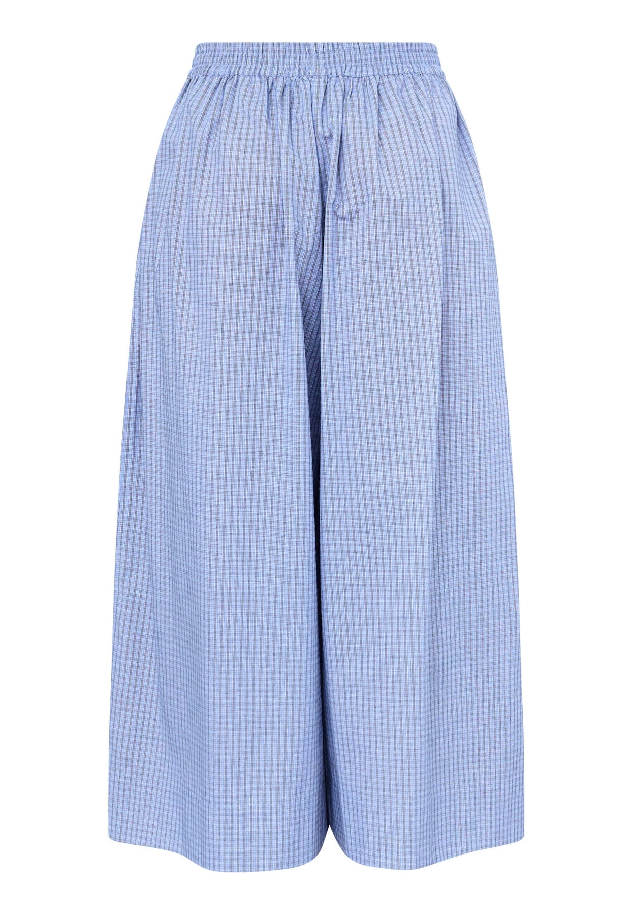 Weit geschnittene Hose von Love & Divine mit blau kariertem Muster. Die Hose besteht aus 100% Baumwolle und hat eine hohe Taille mit Gummizug im Bund.