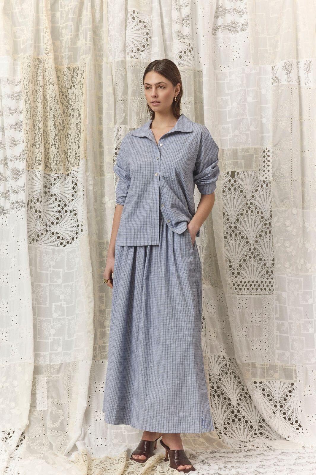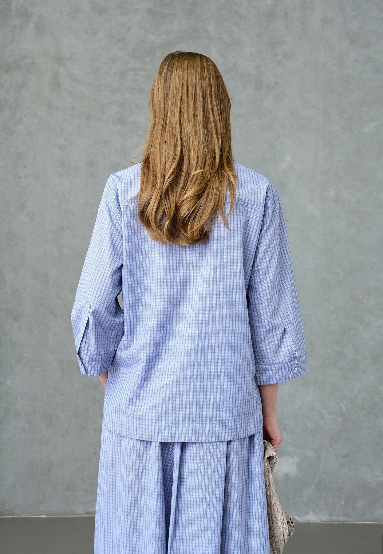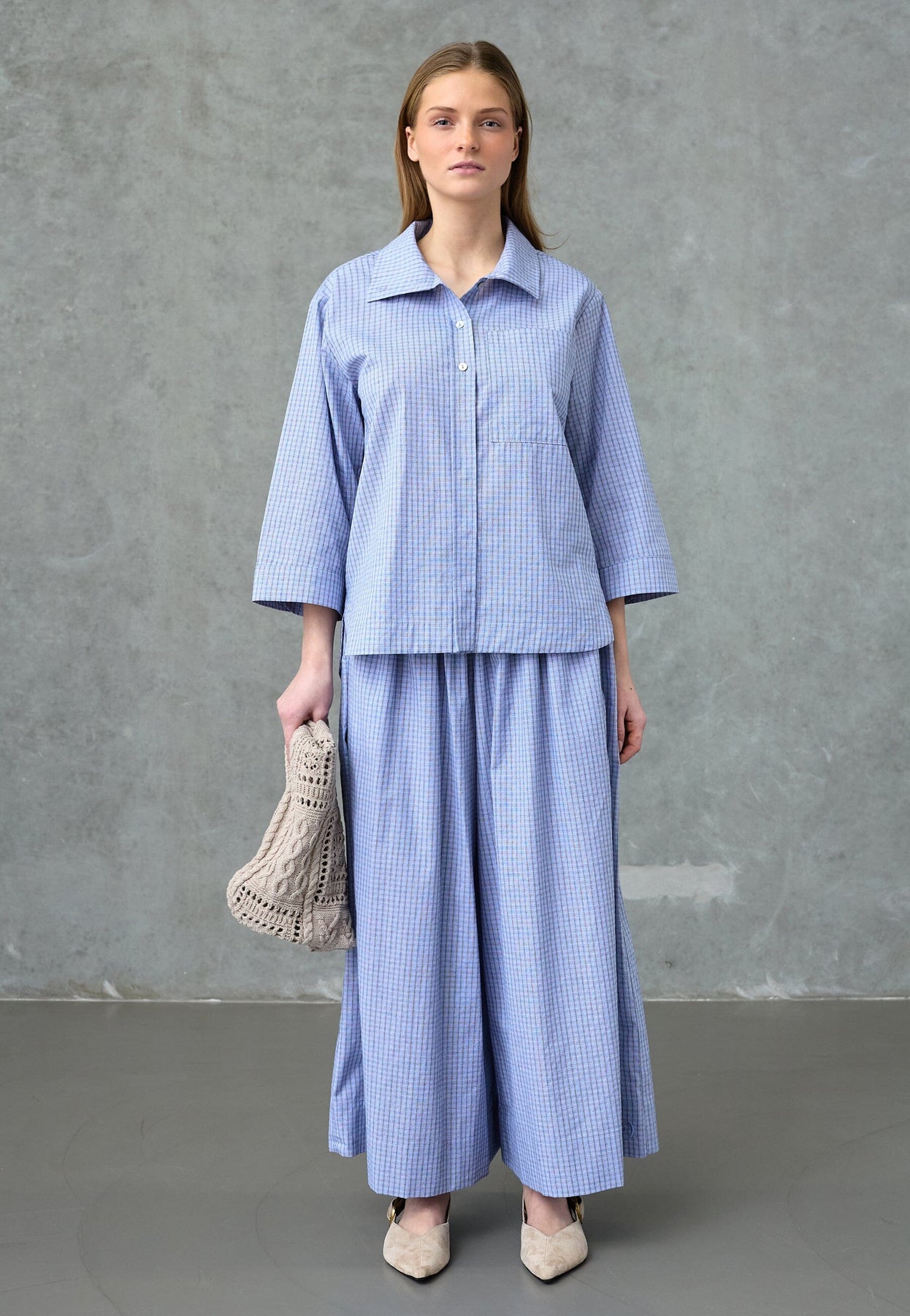 Blau karierte Bluse von Love & Divine aus 100 % Baumwolle. Die Bluse hat einen Kragen und eine Knopfleiste vorn mit einem karierten Muster in Blautönen.