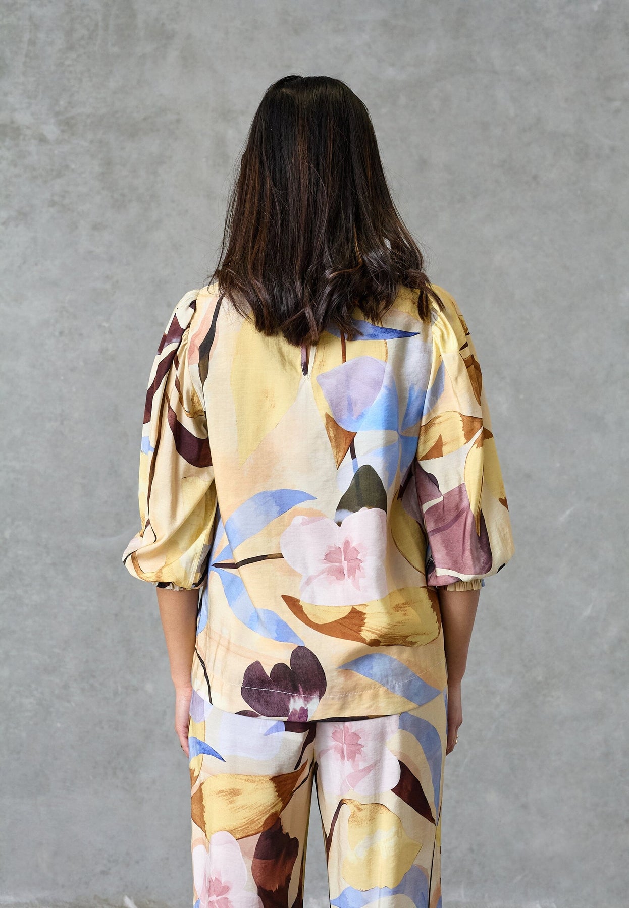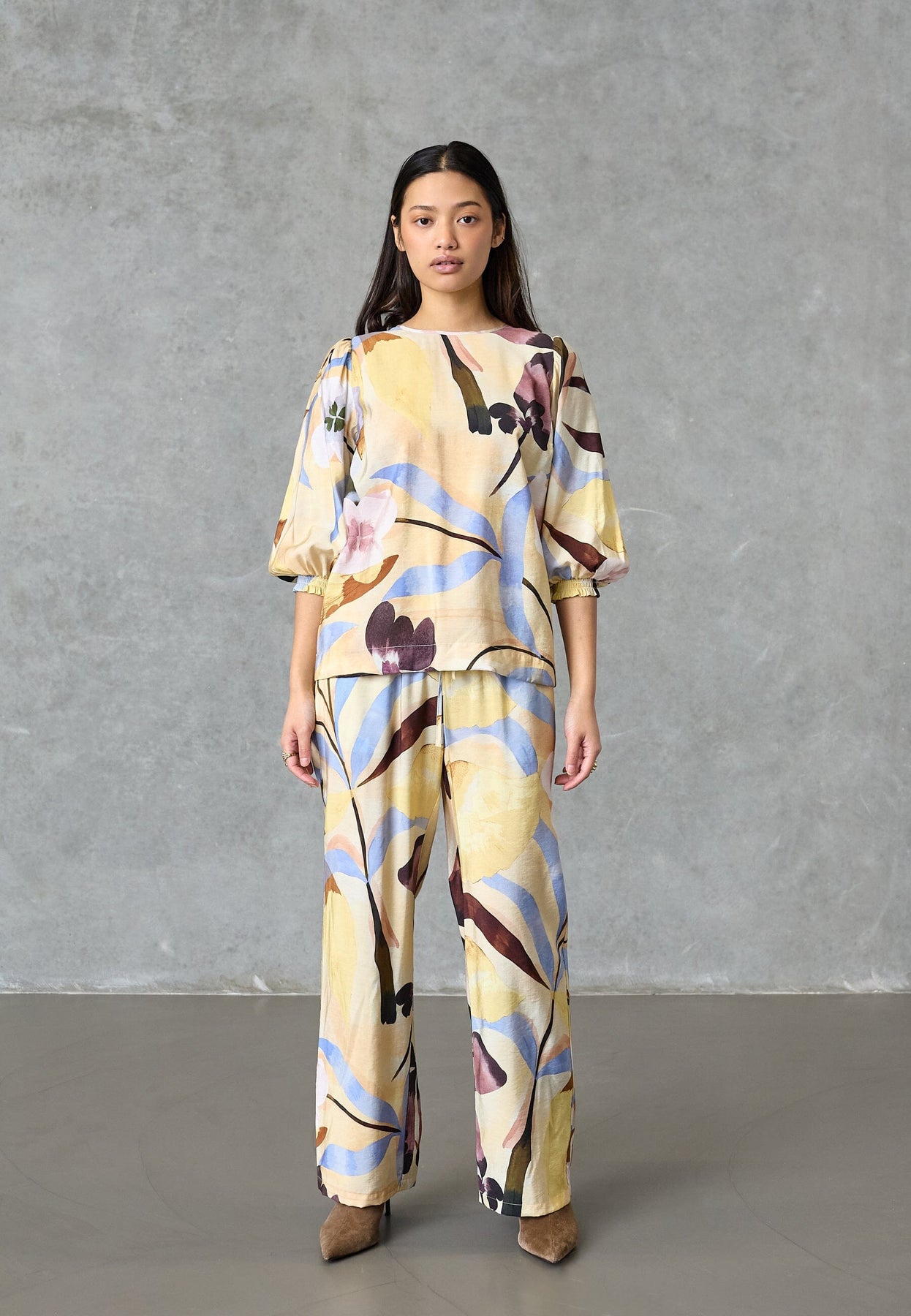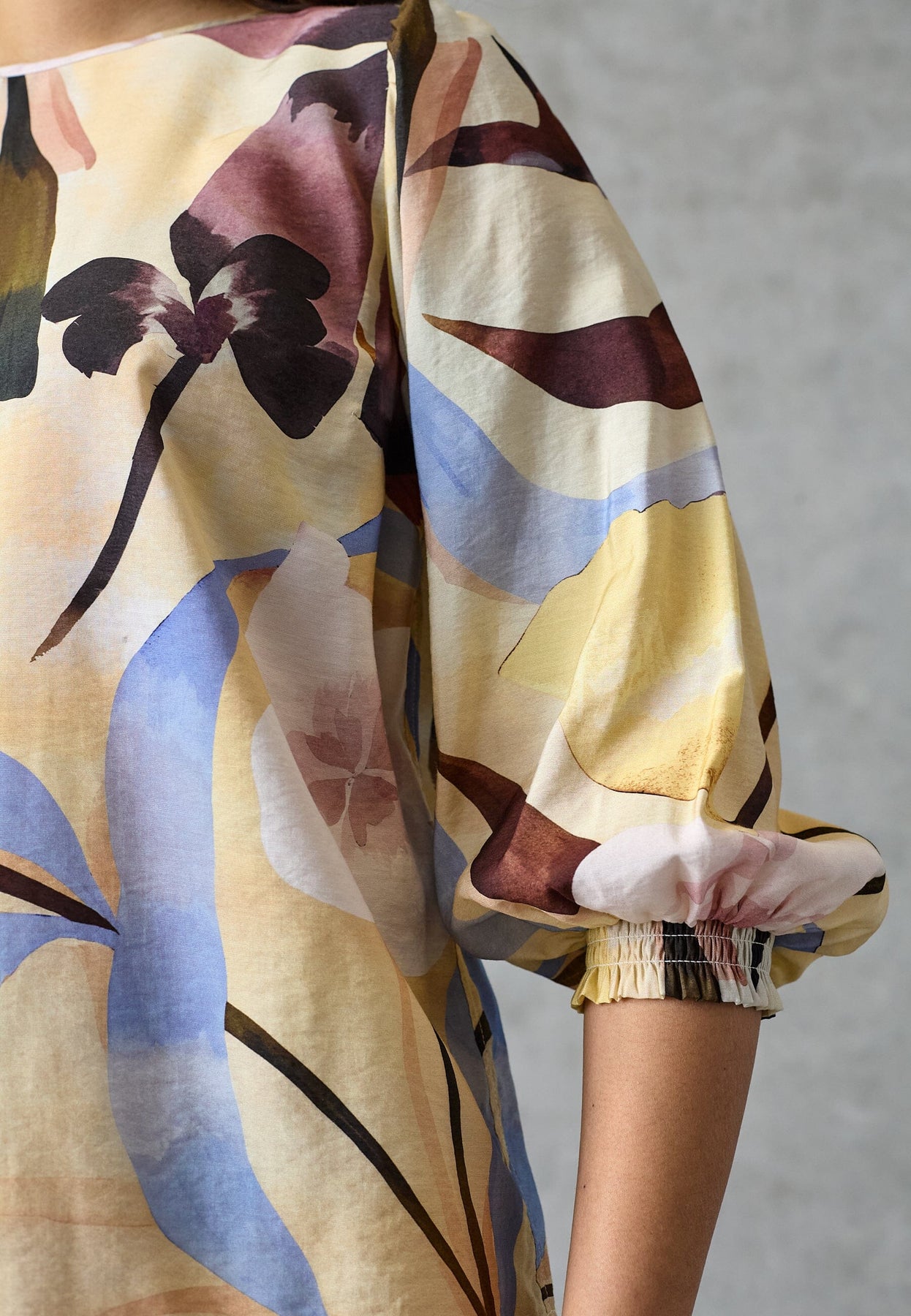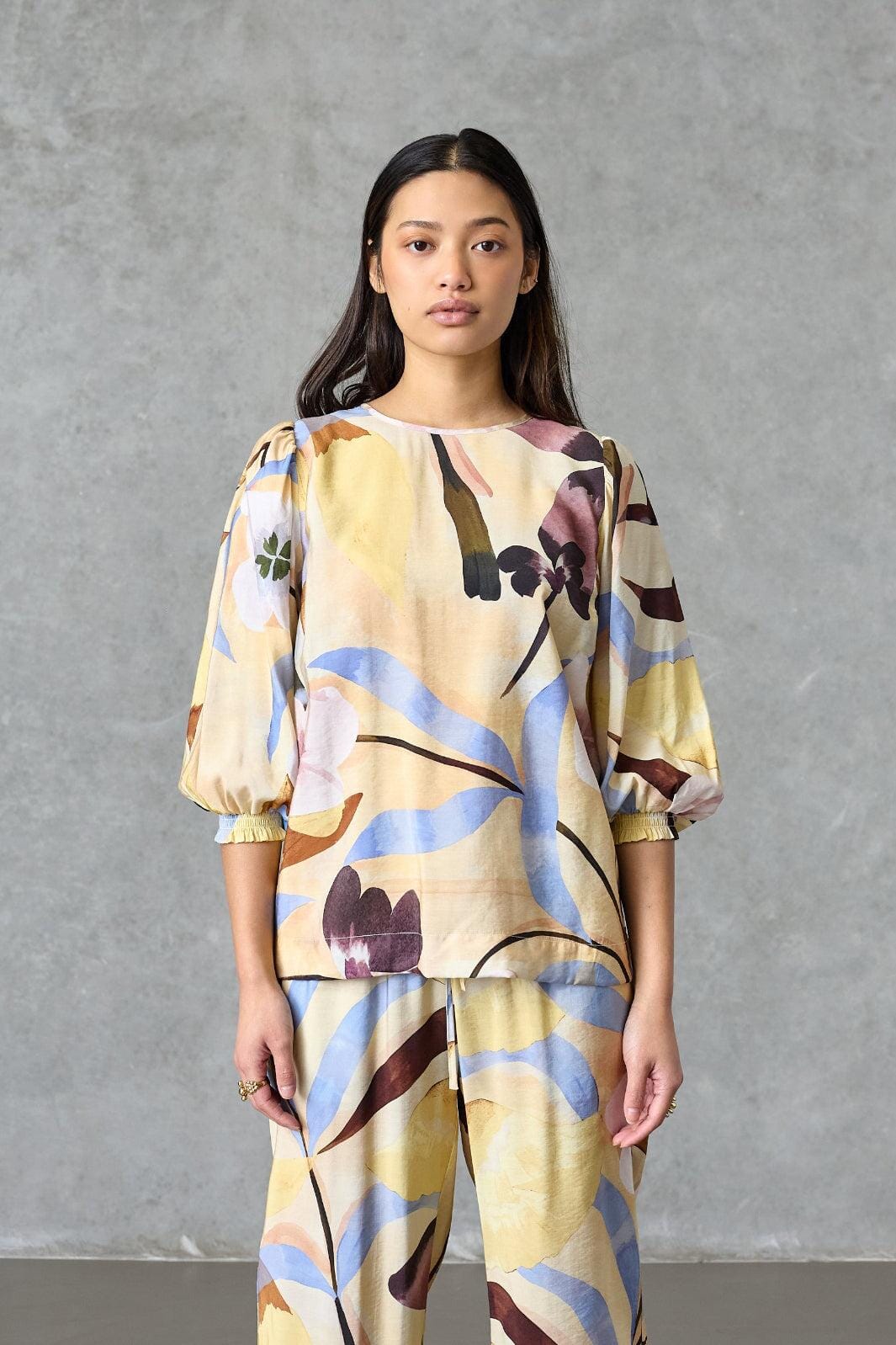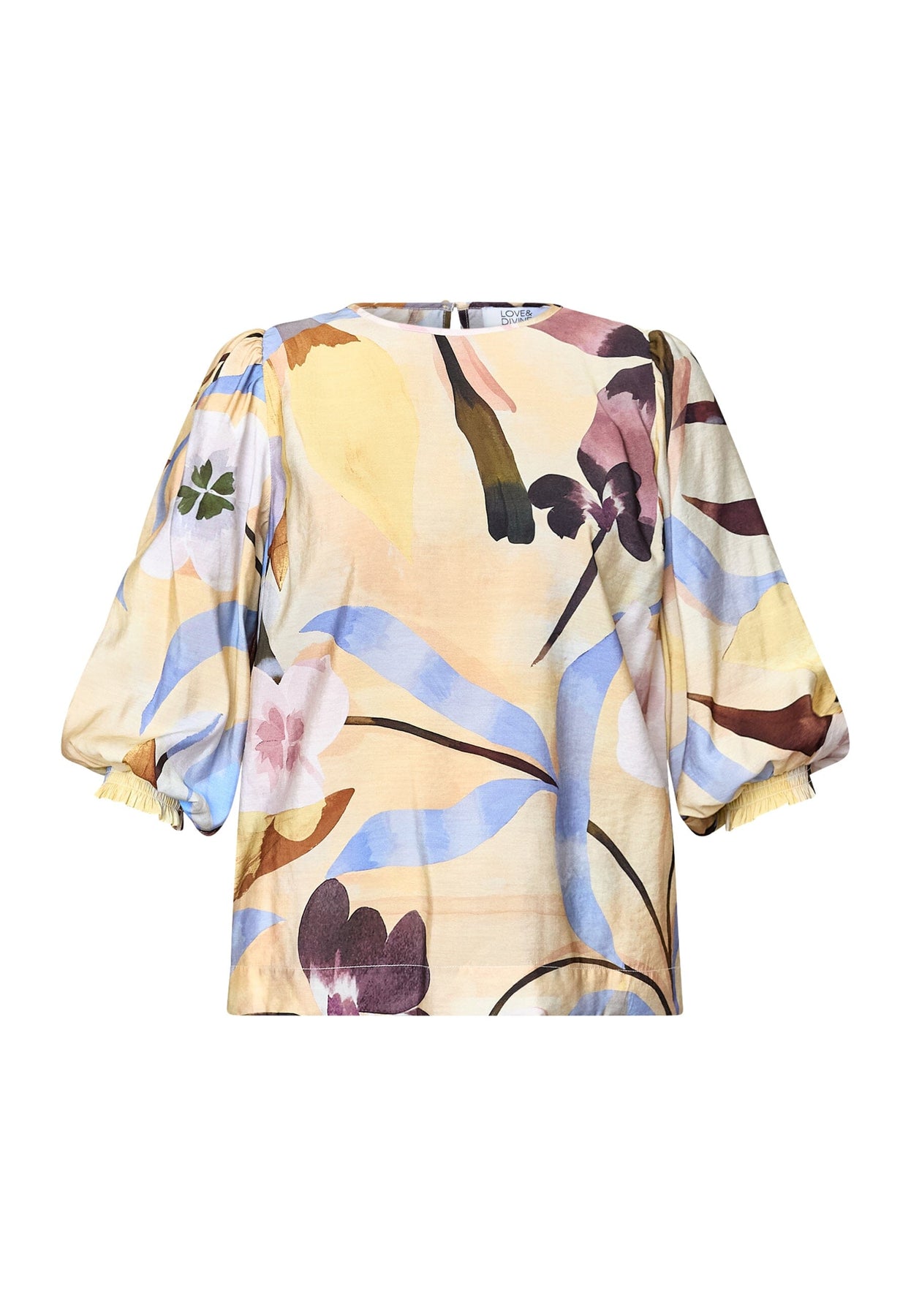 Bluse von Love & Divine in der Farbe Antique Flower mit Blumenprint in Gelb-, Blau-, Rosa- und Lilatönen auf hellem Hintergrund.