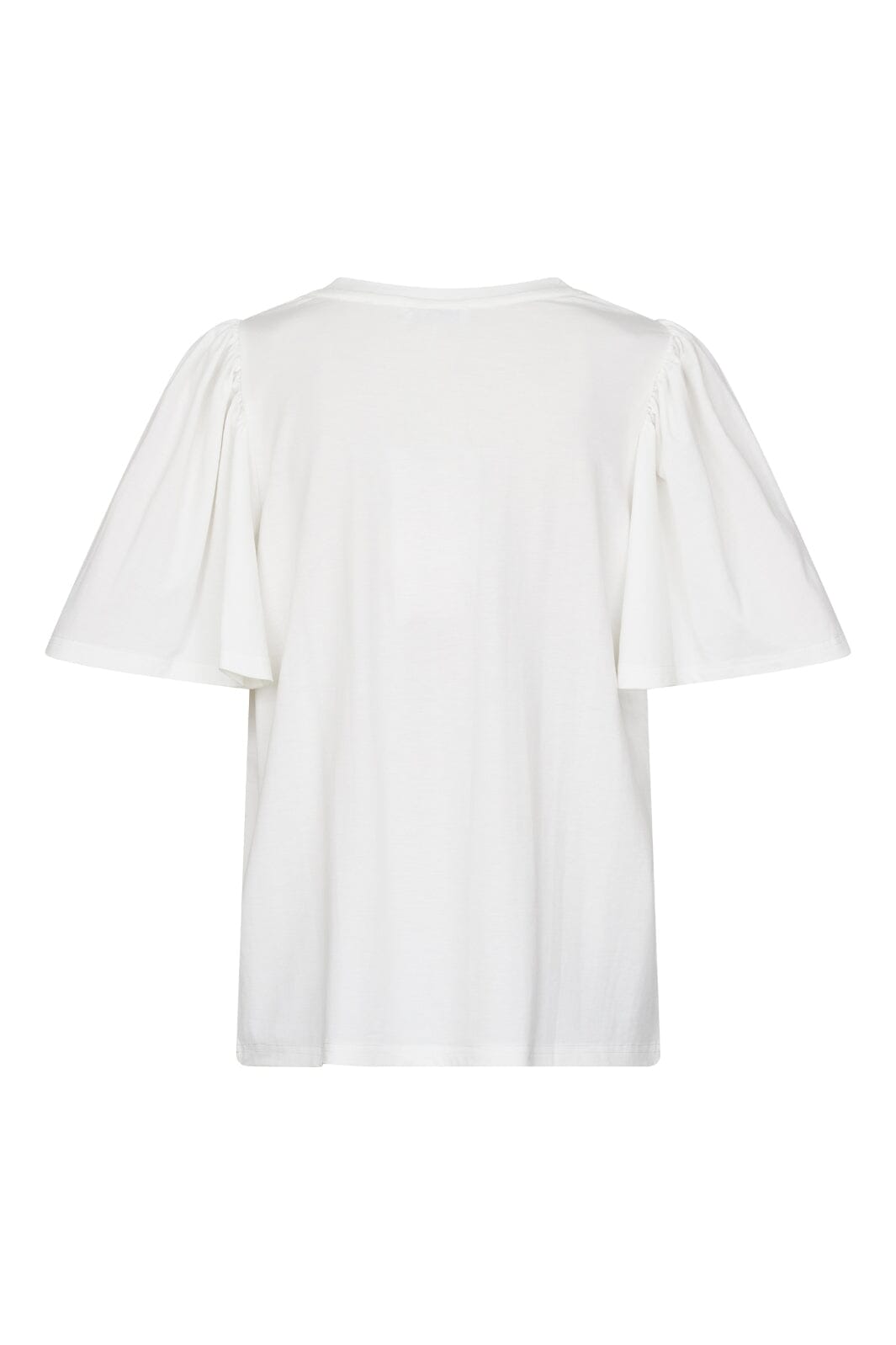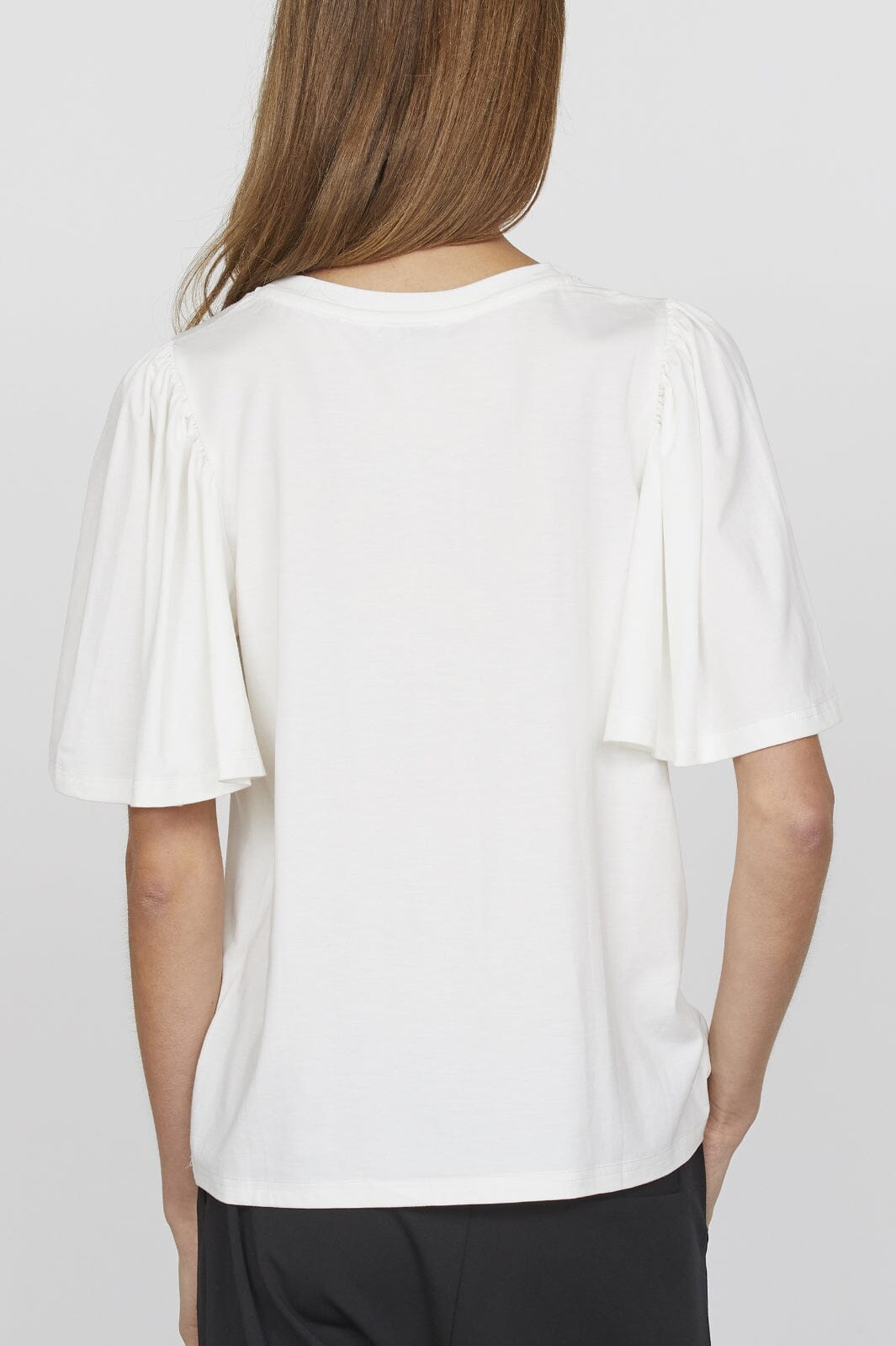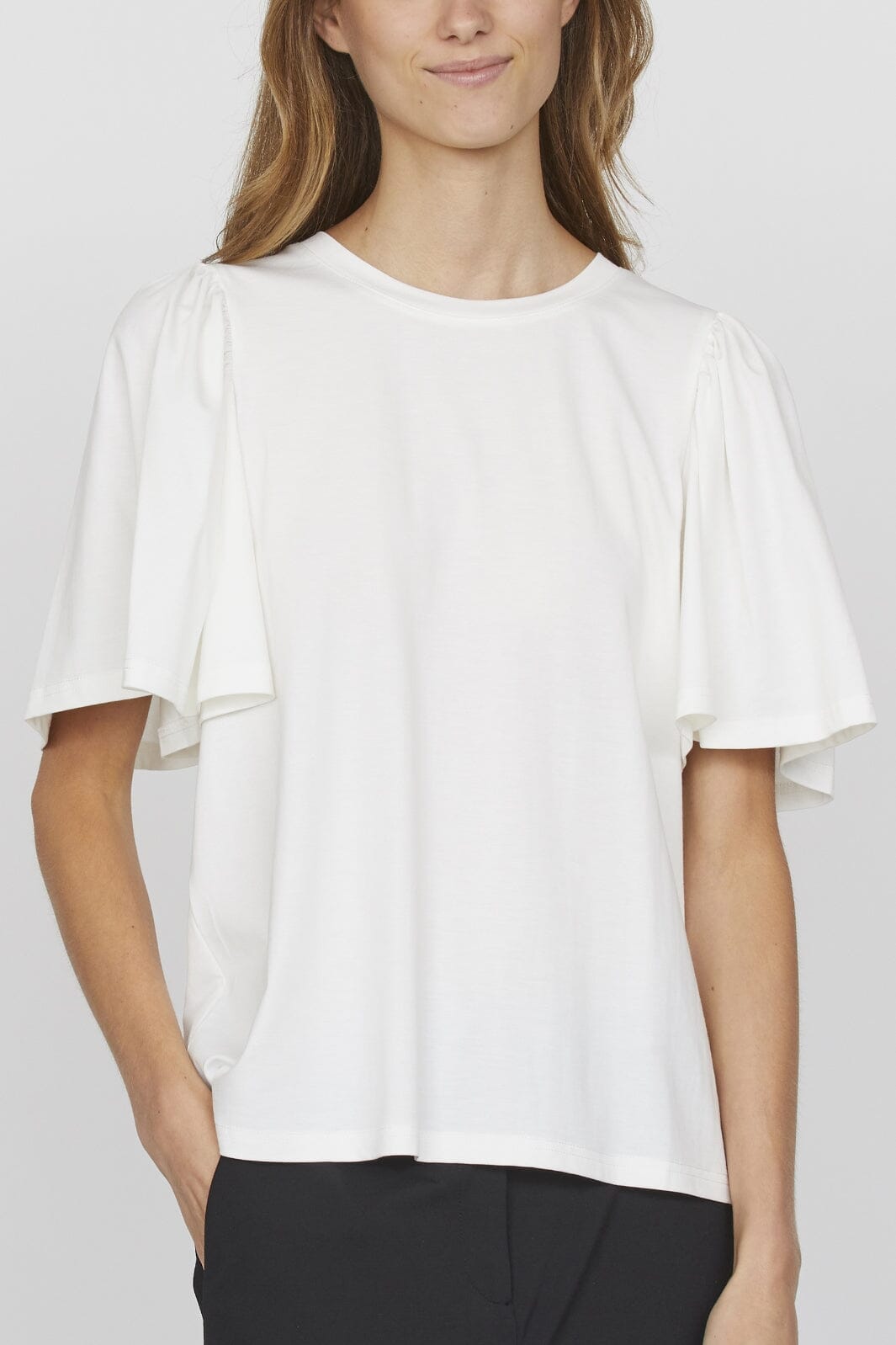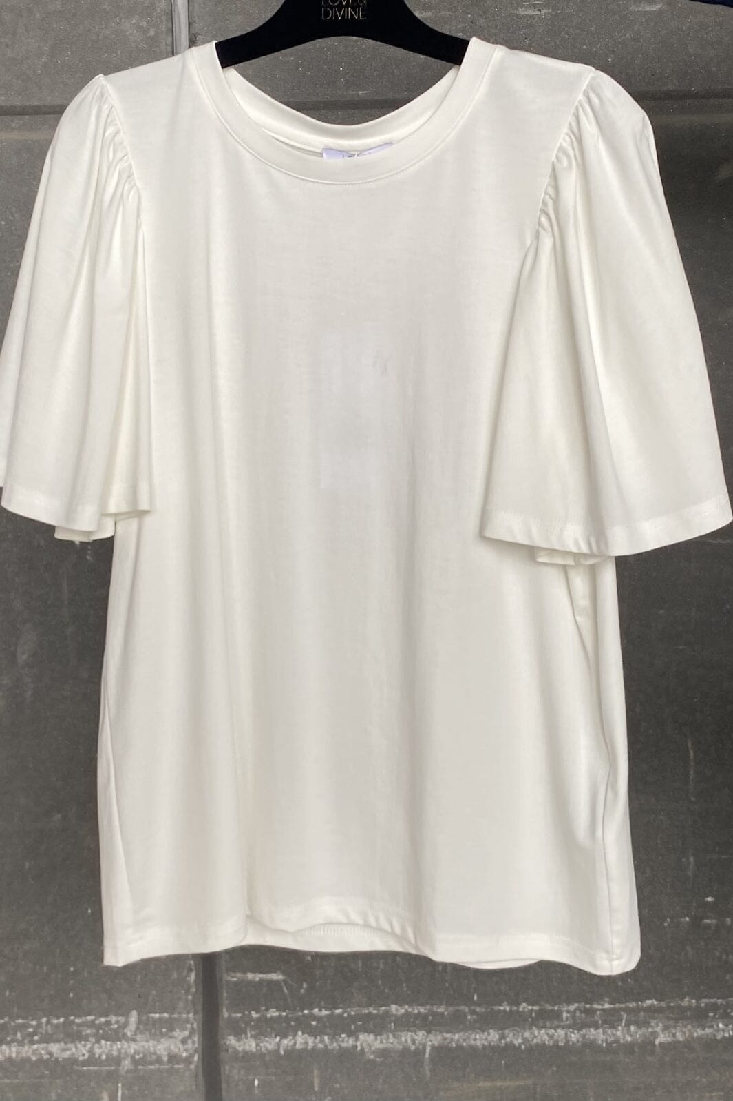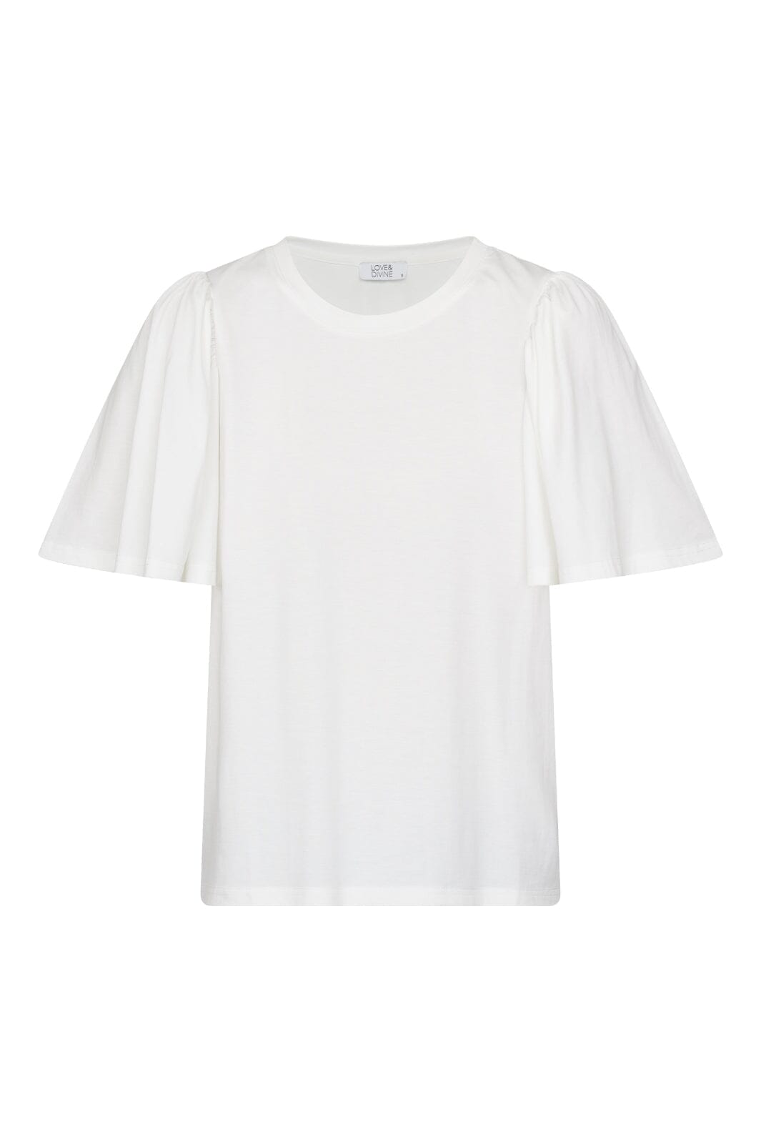 Cremfarbener T-Shirt von Love & Divine mit kurzen Puffärmeln und rundem Halsausschnitt. Das T-Shirt hat eine lockere Passform und ein einfaches Design ohne Muster.