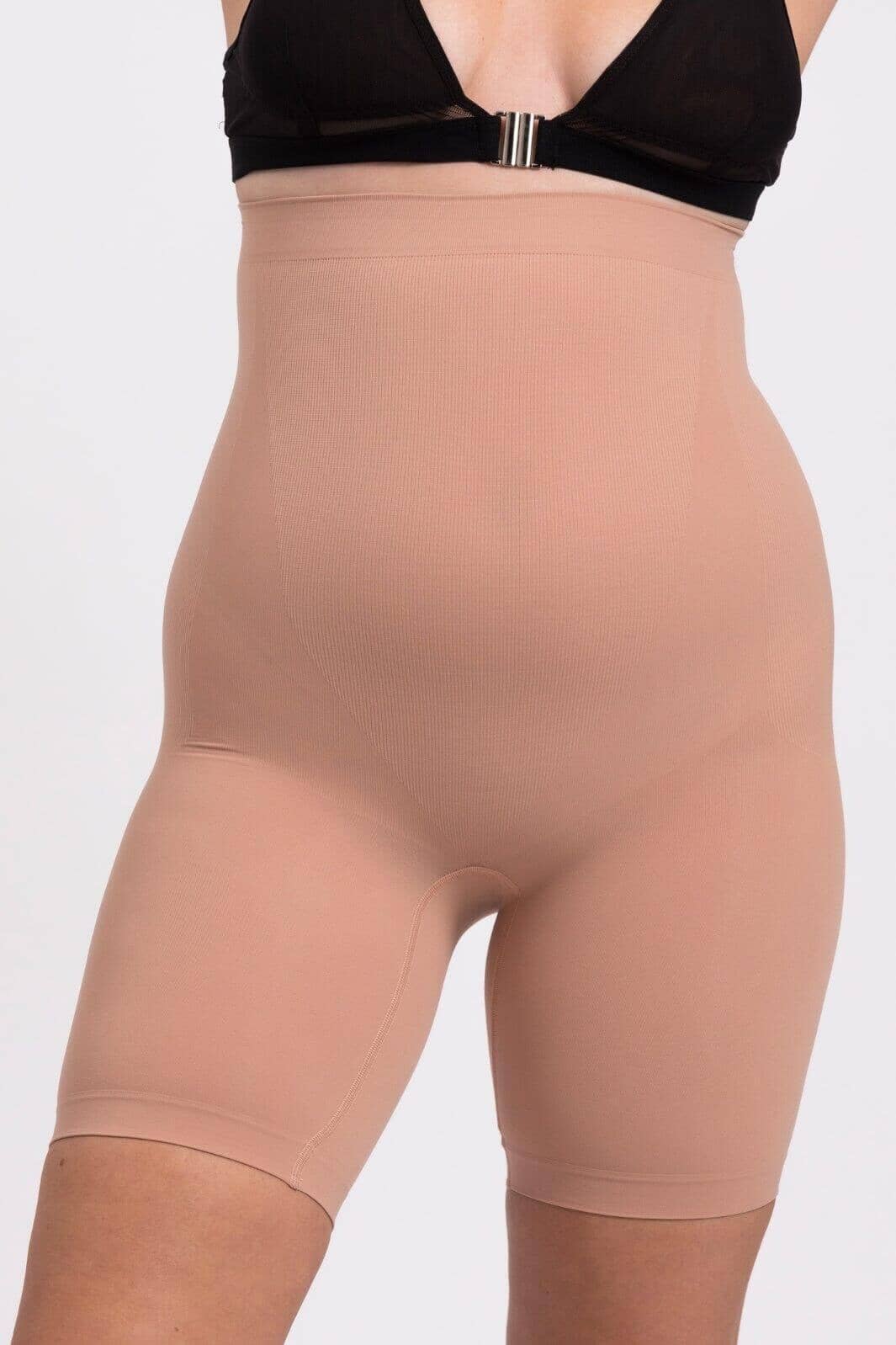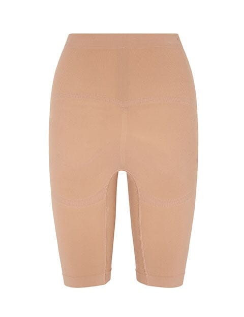 Formende Shorts von Lykkeland Ateliér in Beige. Die Shorts haben eine hohe Taille mit einem inneren Silikonband und eine enge Passform, die den Bauch, die Seiten und die Oberschenkel formt.