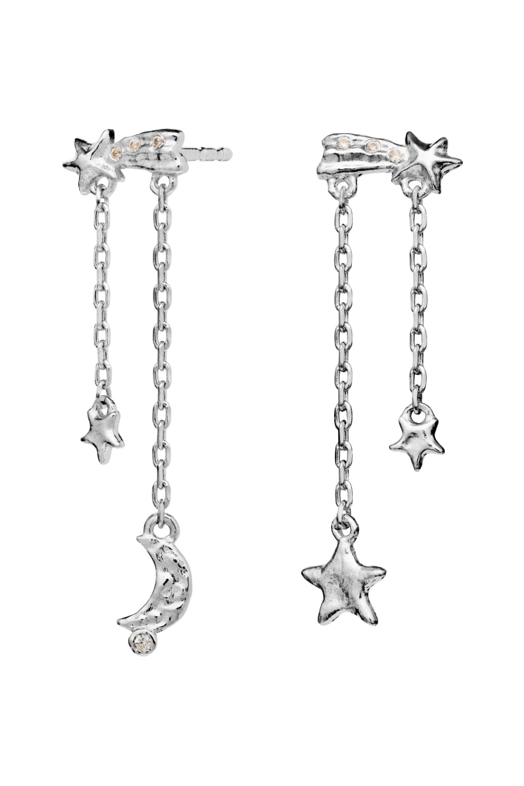 Silberohrringe von Maanesten mit Sternen und Mond im Kettendesign. Die Ohrringe haben asymmetrische Details und sind aus recyceltem Sterlingsilber gefertigt.