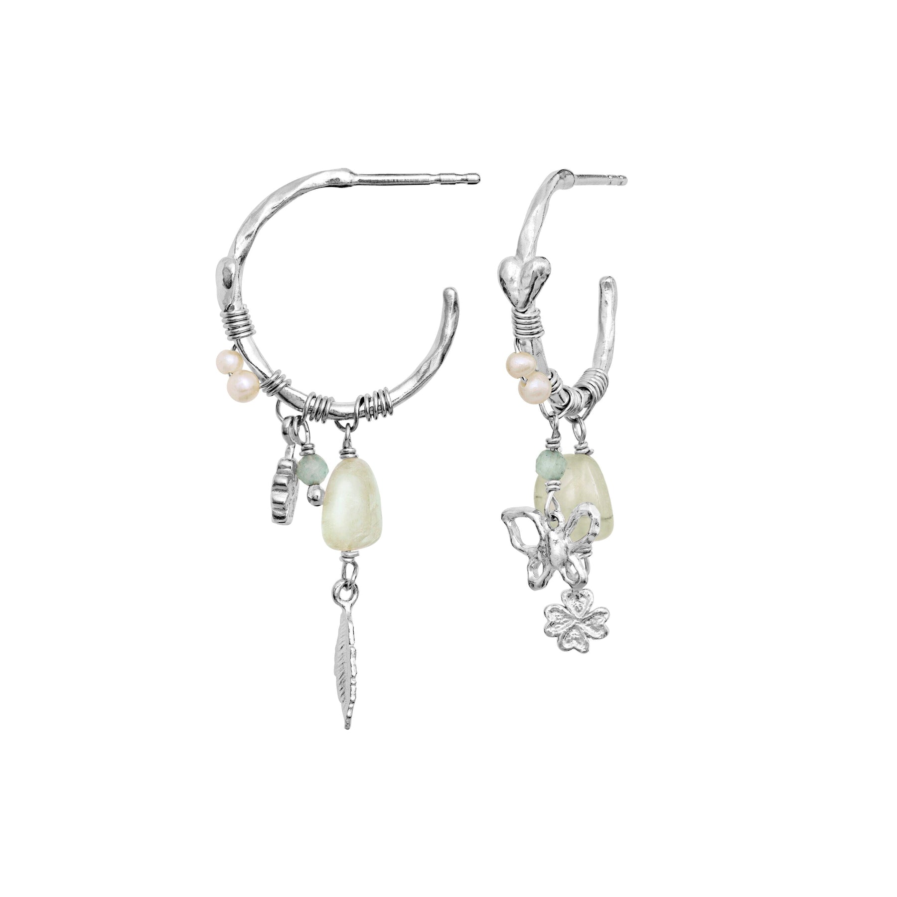 Ohrringe von Maanesten aus Silber mit runder Form und unregelmäßiger, strukturierter Oberfläche. Mehrere Anhänger umfassen Feder, Schmetterling, Blume und kleine Perlen.