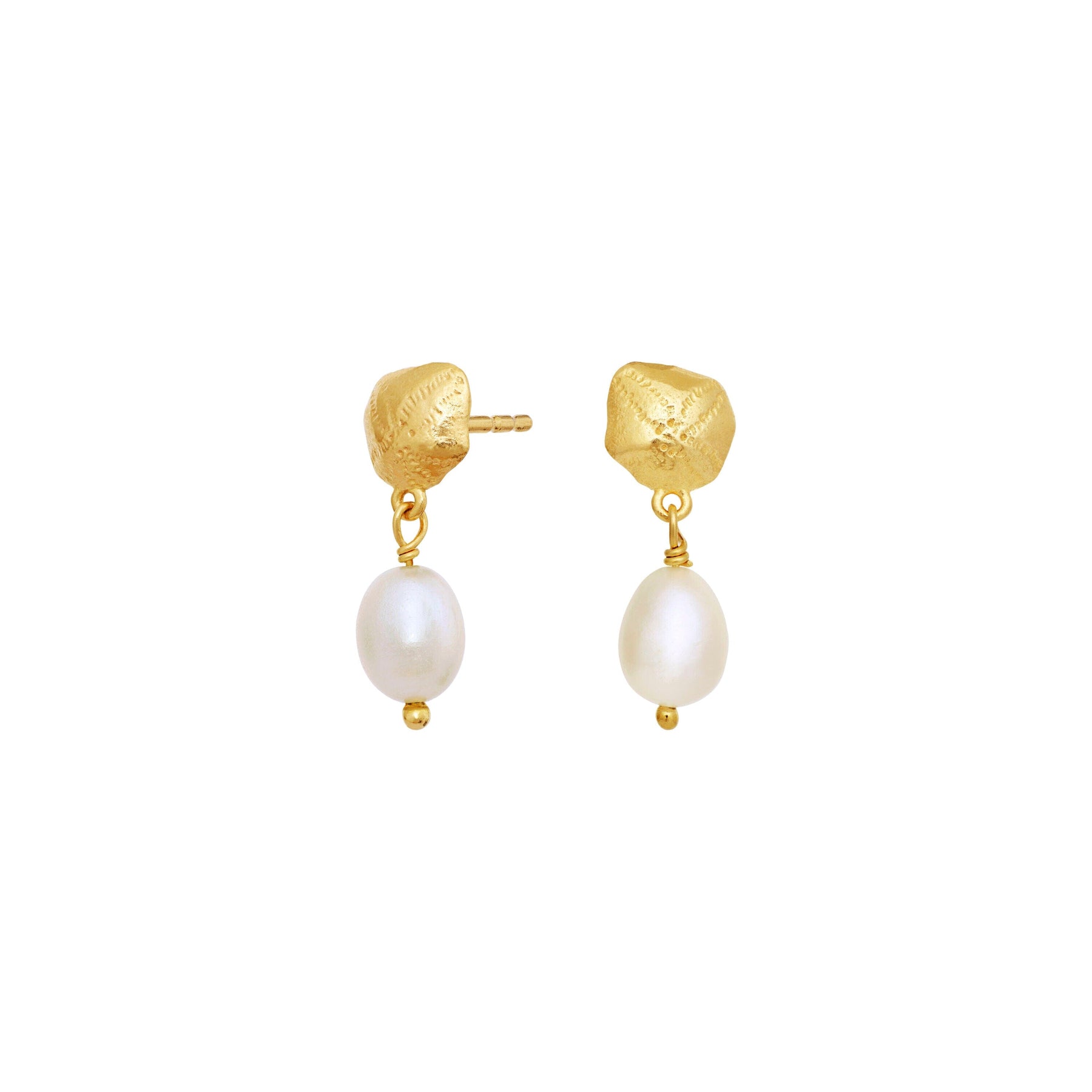 Ohrringe von Maanesten mit einem unregelmäßig geformten Goldelement oben und einem perlenähnlichen Anhänger darunter. Das Design kombiniert goldene und weiße Nuancen.