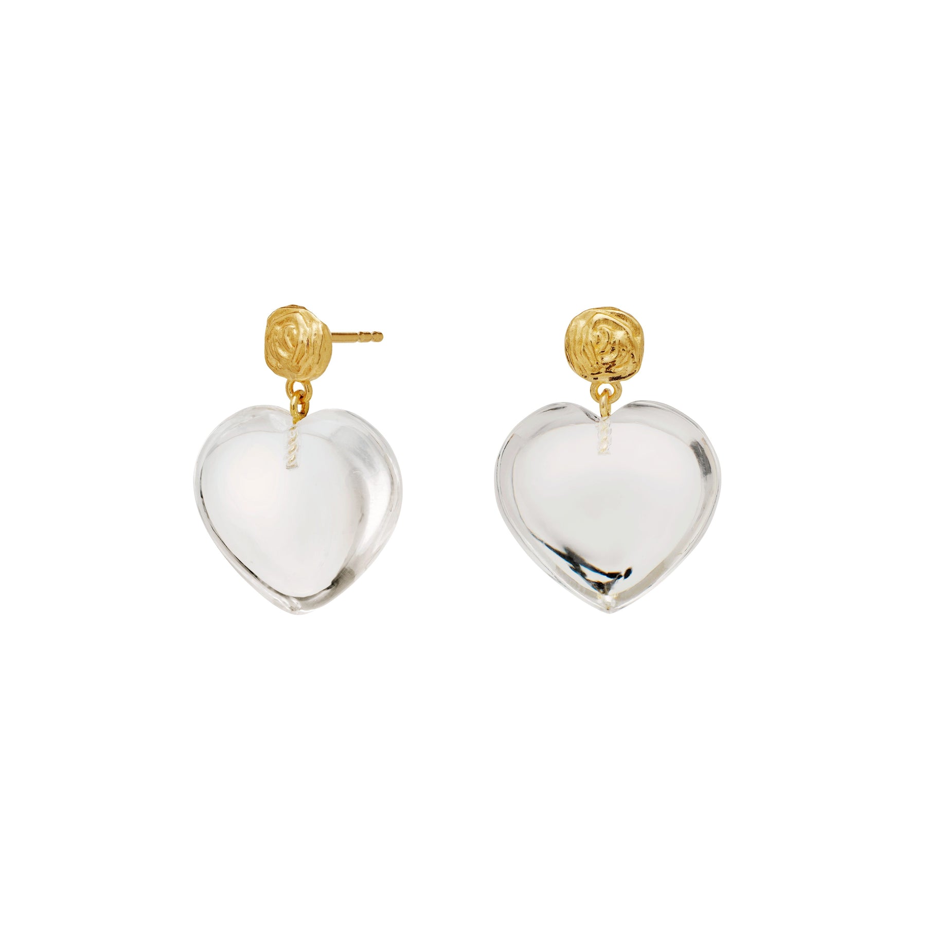 Herzförmige Ohrringe von Maanesten mit klarem Kristall und einem vergoldeten Rosendetail oben. Die Ohrringe haben eine glatte Oberfläche, die das Licht einfängt, und ein handgefertigtes Finish.
