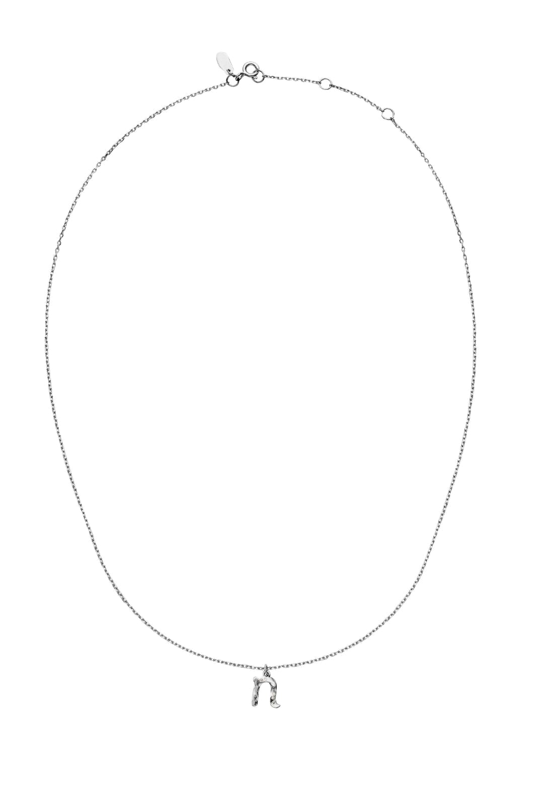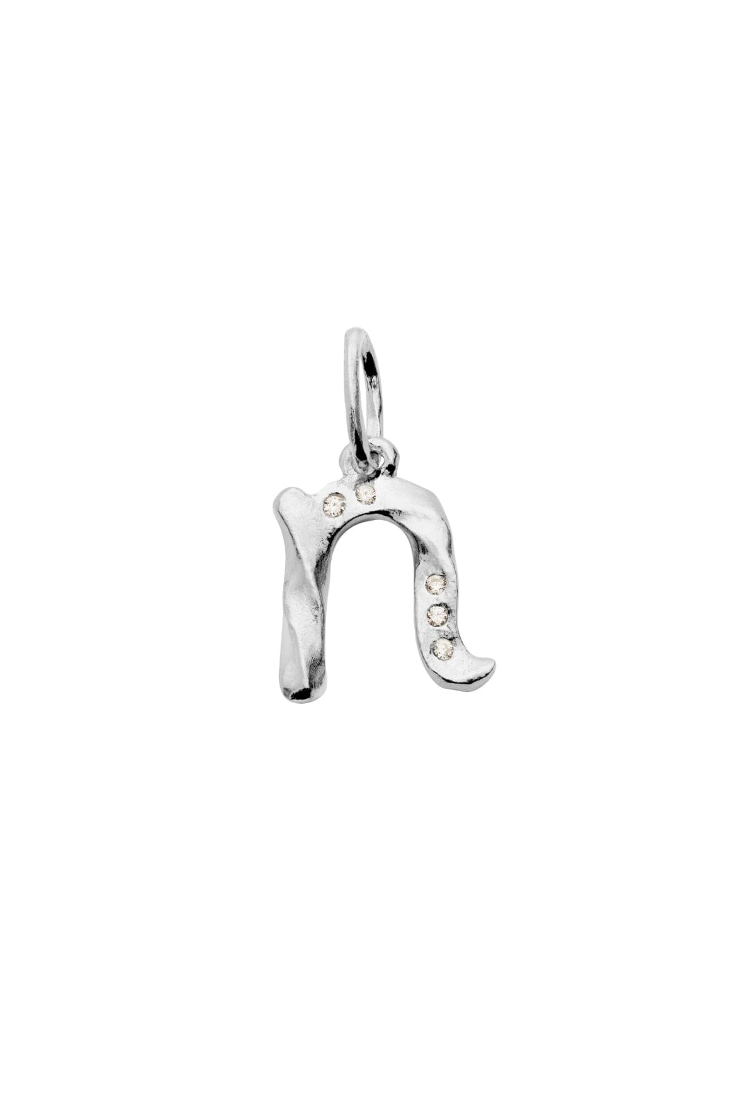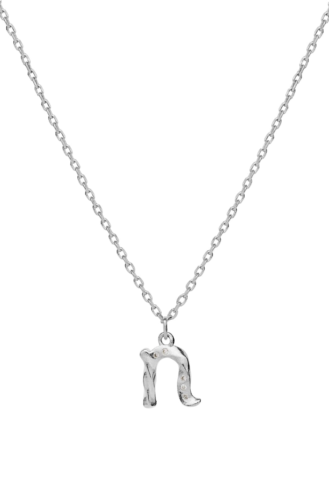 Silberhalskette von Maanesten mit einem Buchstabenanhänger aus recyceltem Sterlingsilber. Der Anhänger hat die Form eines 'n' und ist mit kleinen Steinen verziert, die feine Details im Design schaffen.