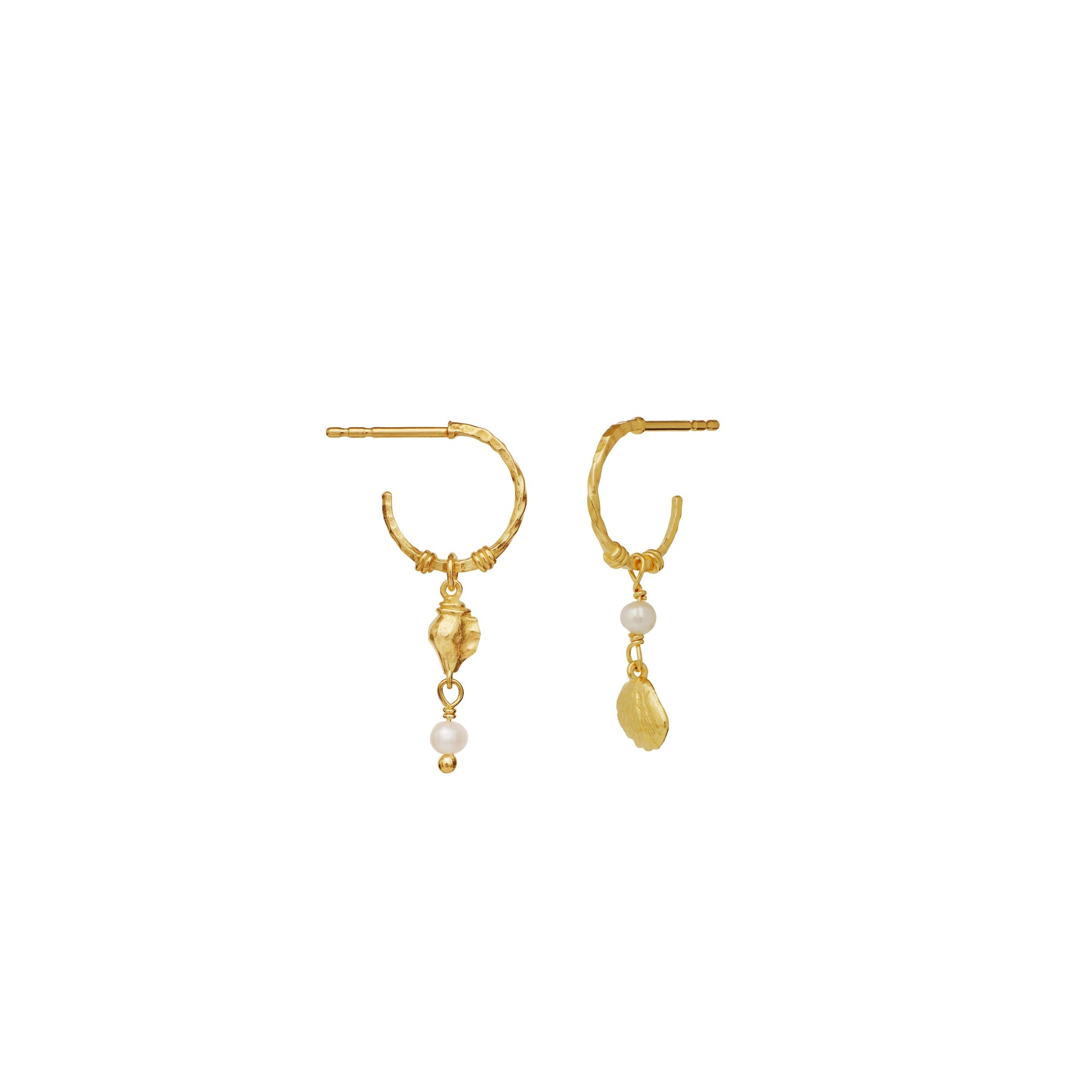 Goldene Ohrringe von Maanesten mit Süßwasserperlen. Die Ohrringe haben eine gedrehte Hoop-Form mit dekorativen Anhängern und Perlen, die einen eleganten Ausdruck verleihen.