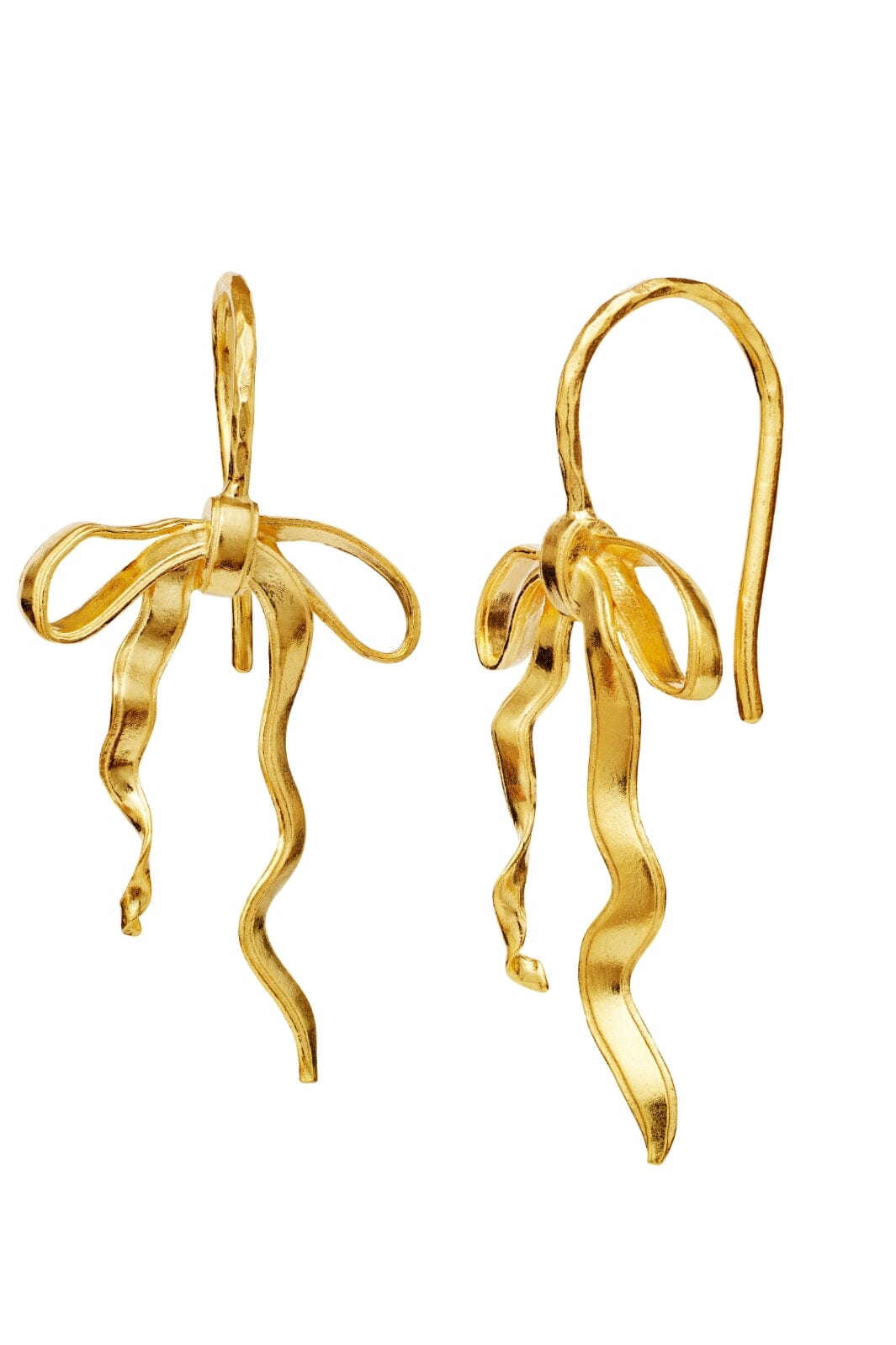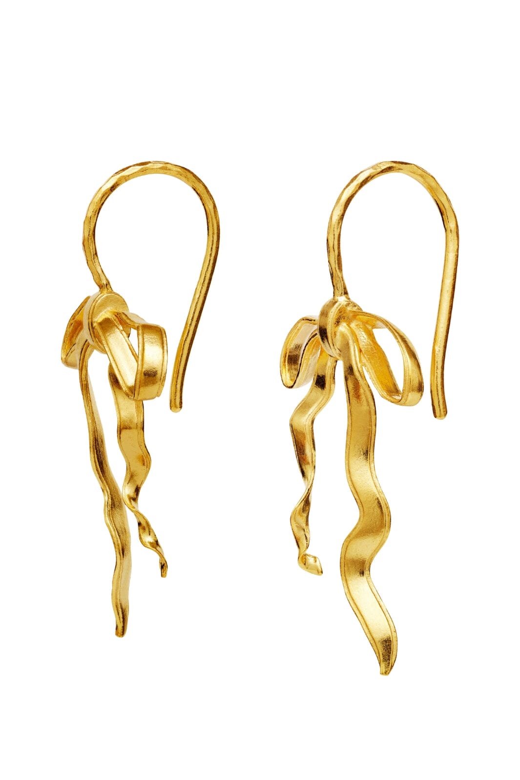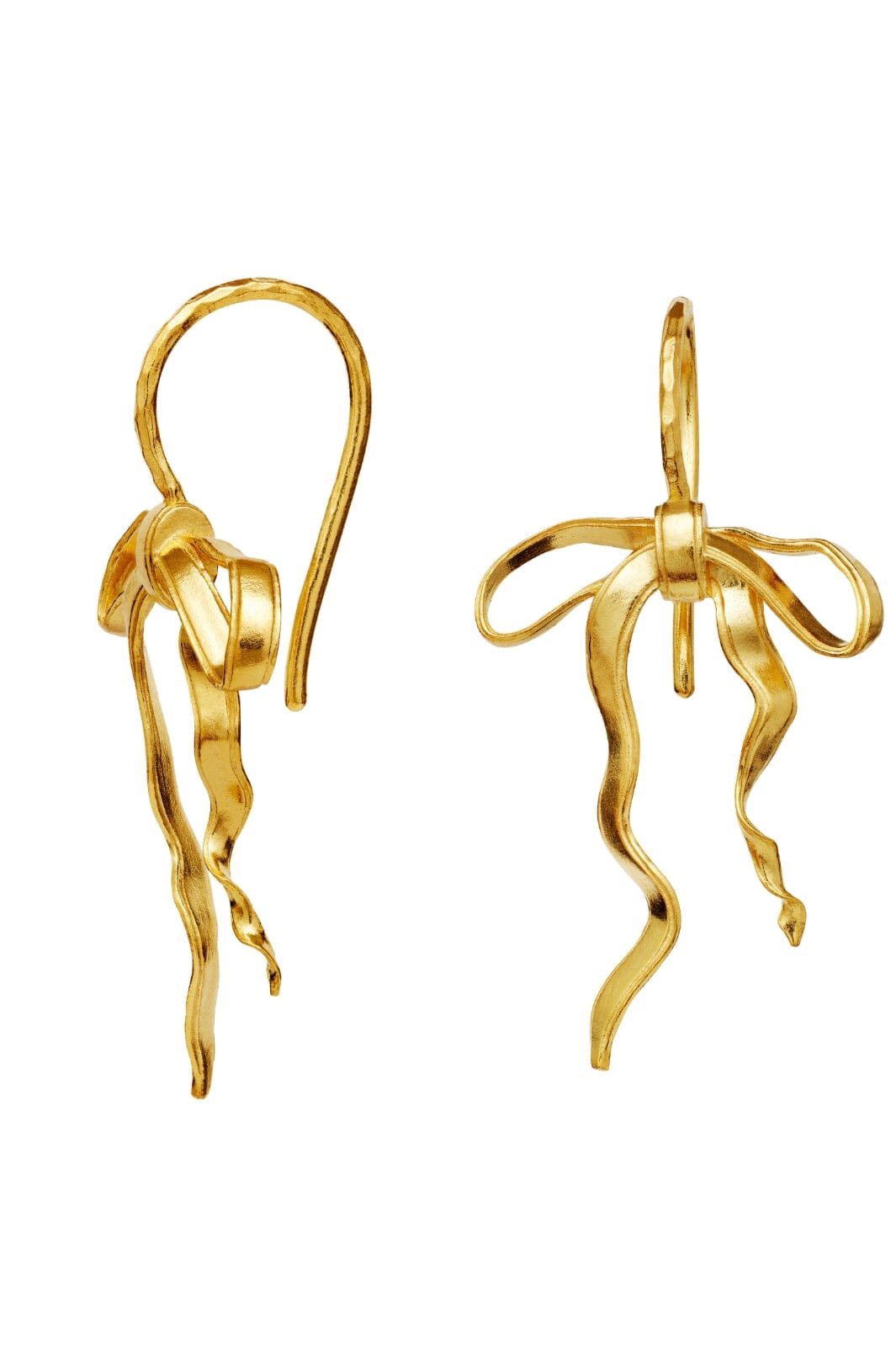 Goldplattierte Ohrringe von Maanesten mit einem Schleifen-Design. Die Ohrringe haben gewellte Bänder, die eine dynamische Form in goldener Farbe schaffen.
