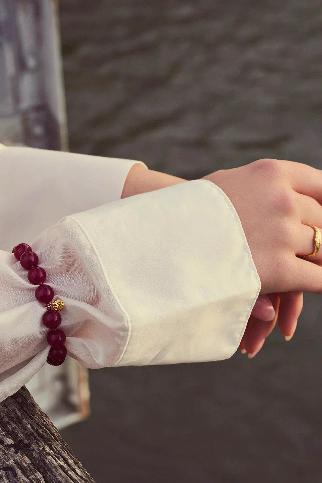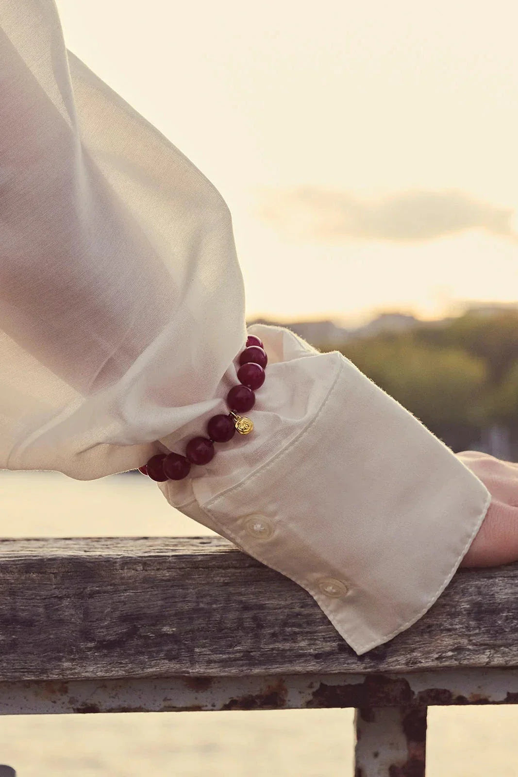 Armband von Maanesten mit roten, kugelförmigen Perlen und einem kleinen goldfarbenen Charm. Das Armband ist von traditionellen Chakra-Armbändern inspiriert.