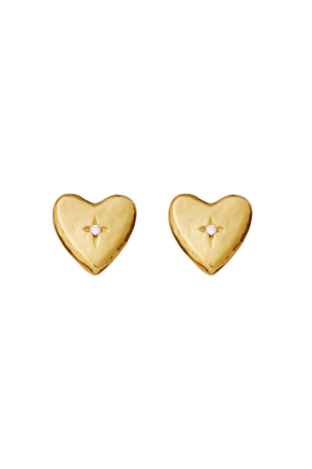 Herzförmige Ohrringe von Maanesten mit einem kleinen Kristalldetail in der Mitte. Die kleinen Ohrringe haben eine kompakte Größe von 6 x 6 mm und sind mit einer leichten Konstruktion gefertigt.