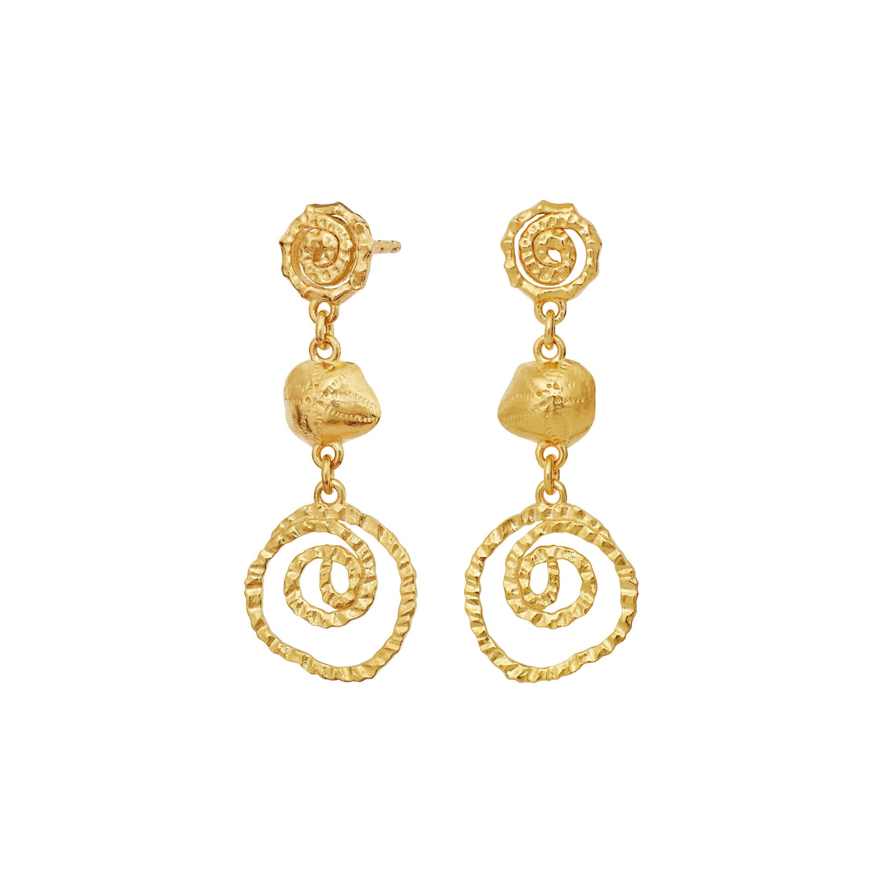 Ohrringe von Maanesten in Gold. Das Design hat unten eine spiralförmige Verzierung, in der Mitte eine unregelmäßige Perle und oben ein gedrehtes Detail.