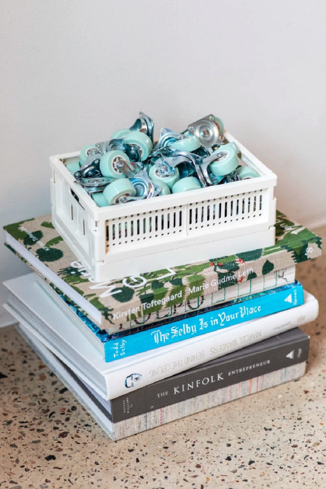 Räder von Made Crate in einem mintgrünen Farbton mit silberfarbenen Metallelementen. Sie sind als Zubehör für Made Crate-Aufbewahrungsboxen konzipiert und bieten einfache Mobilität im Zuhause.